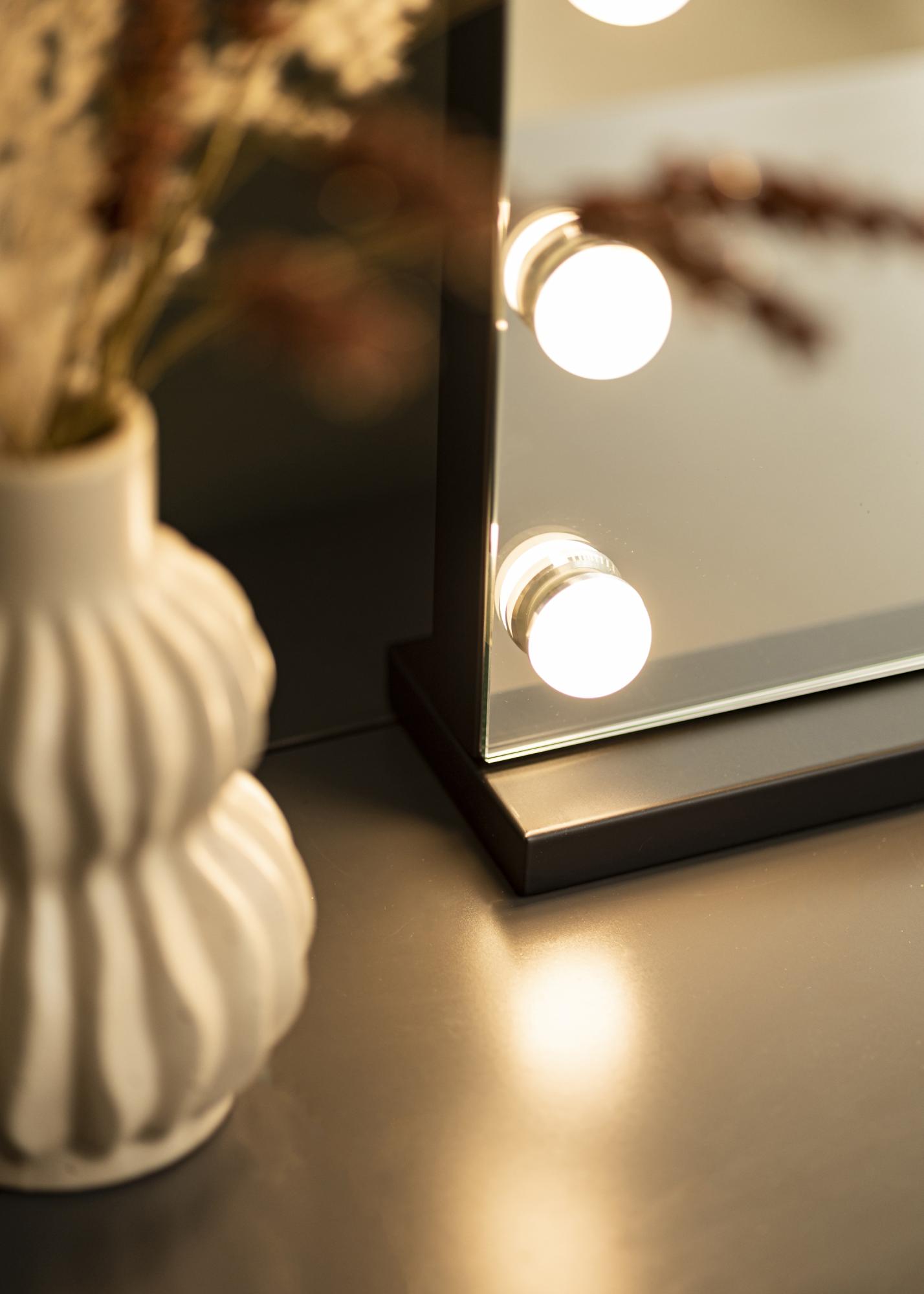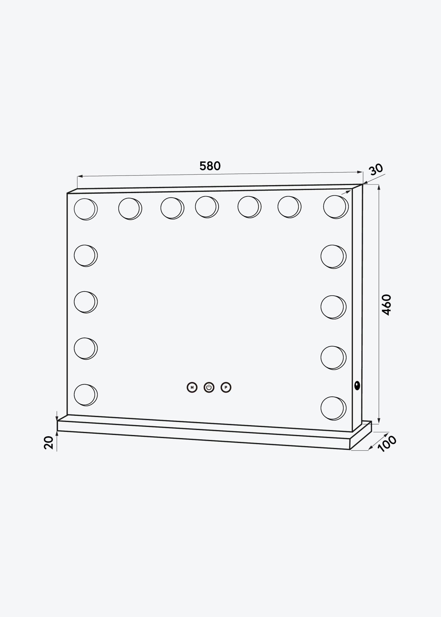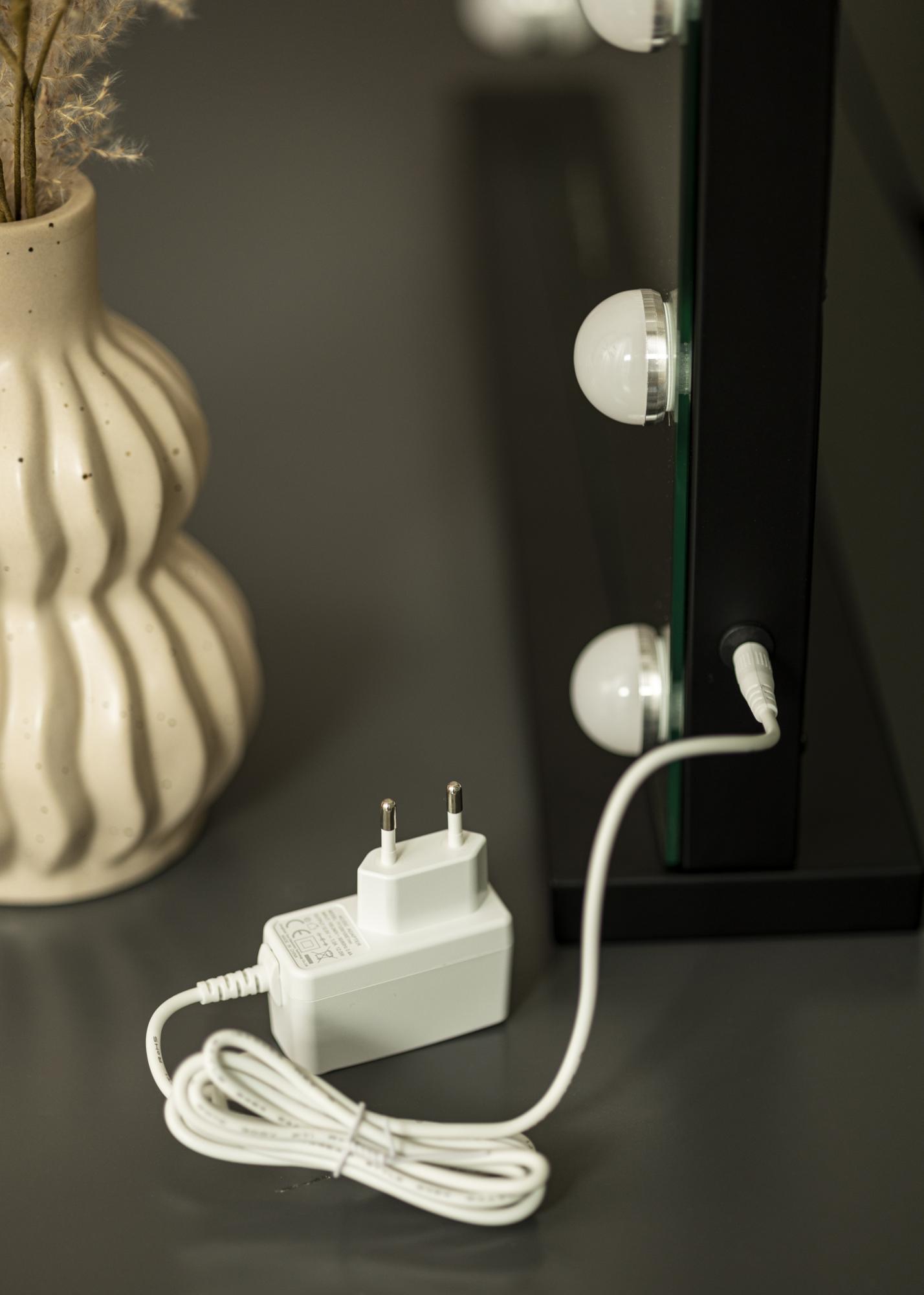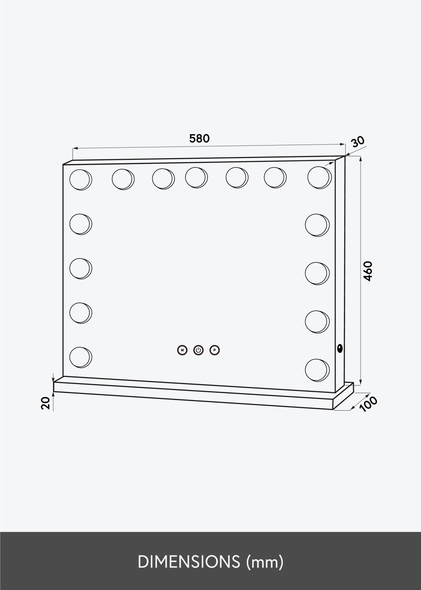 Освежете ъгъла за гримиране, всекидневната или антрето с елегантно огледало за гримиране с вградена светлина! Огледалото няма традиционна рамка; вместо това, лицевата повърхност е обрамчена от 15 LED лампи, които са разположени по краищата на огледалото. Осветлението е регулируемо и можете да настроите както яркостта, така и цветната температура. Настройките на светлината се правят чрез сензорни бутони в долния ръб на огледалото, където бутонът "P" променя яркостта, а бутонът "M" регулира цветната температура. Там има и сензорен бутон за включване или изключване на светлината. Ел. връзката се осъществява с щепсел.