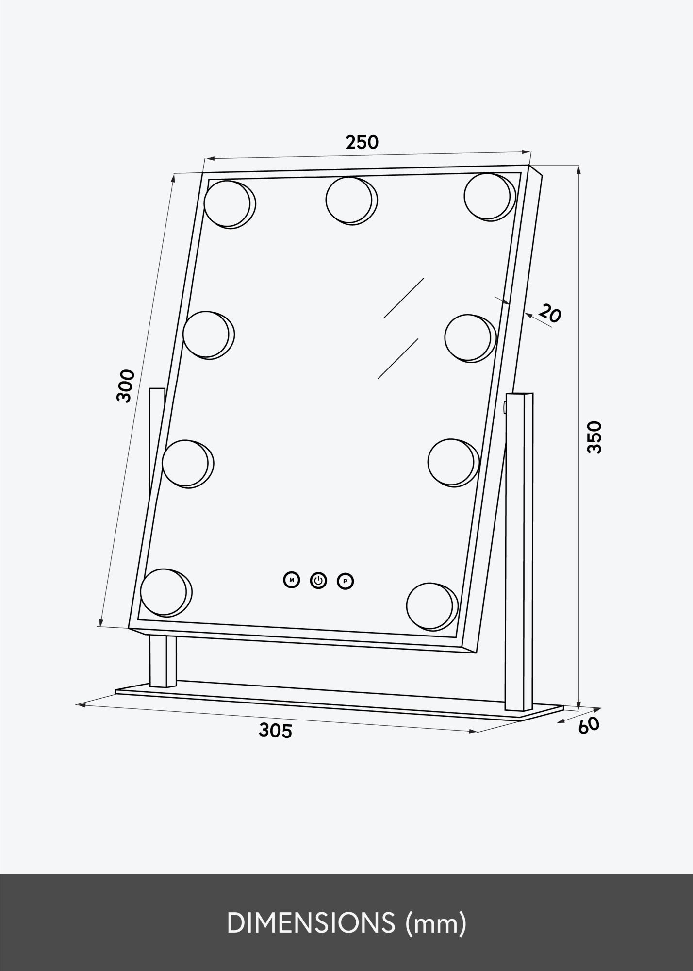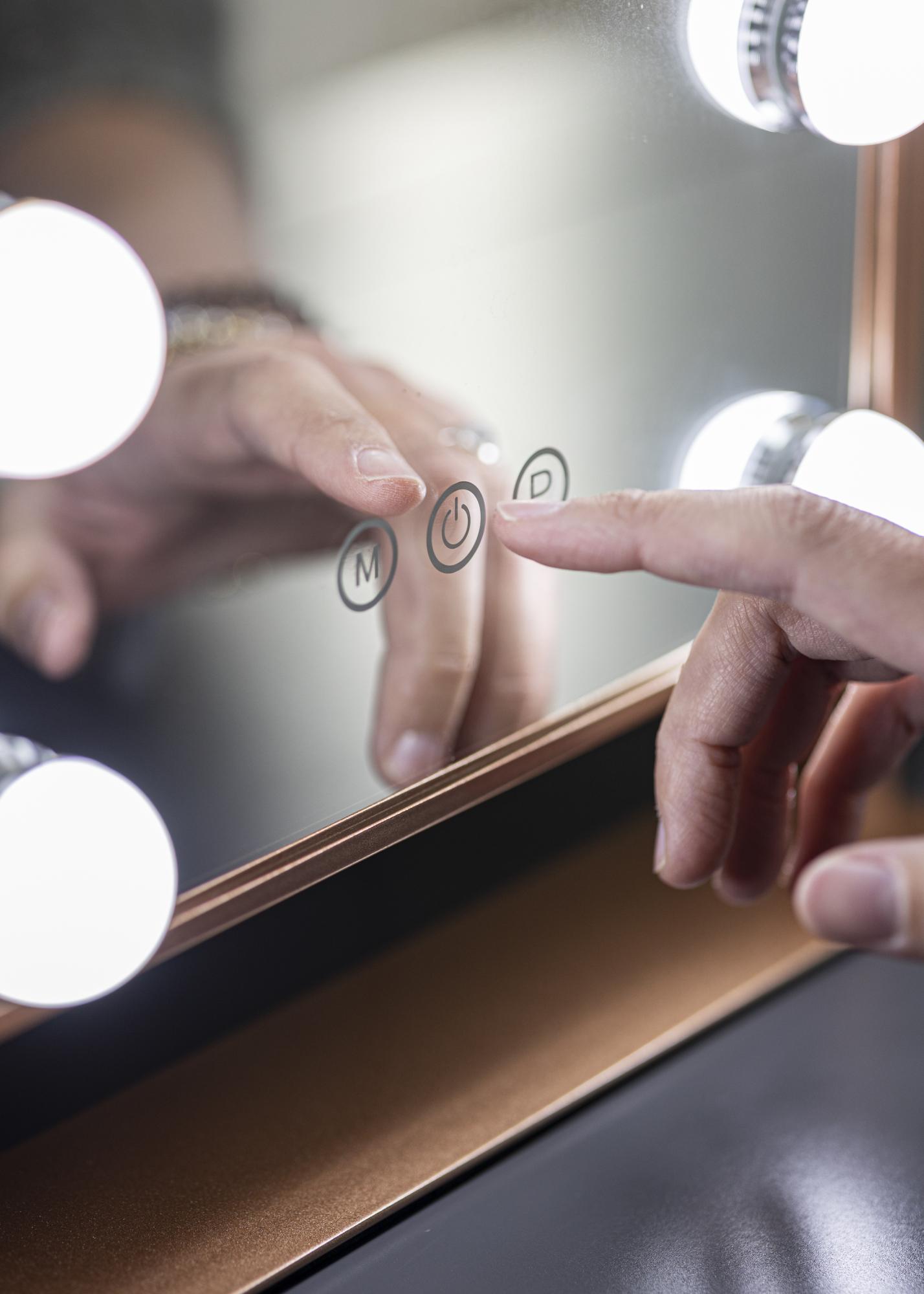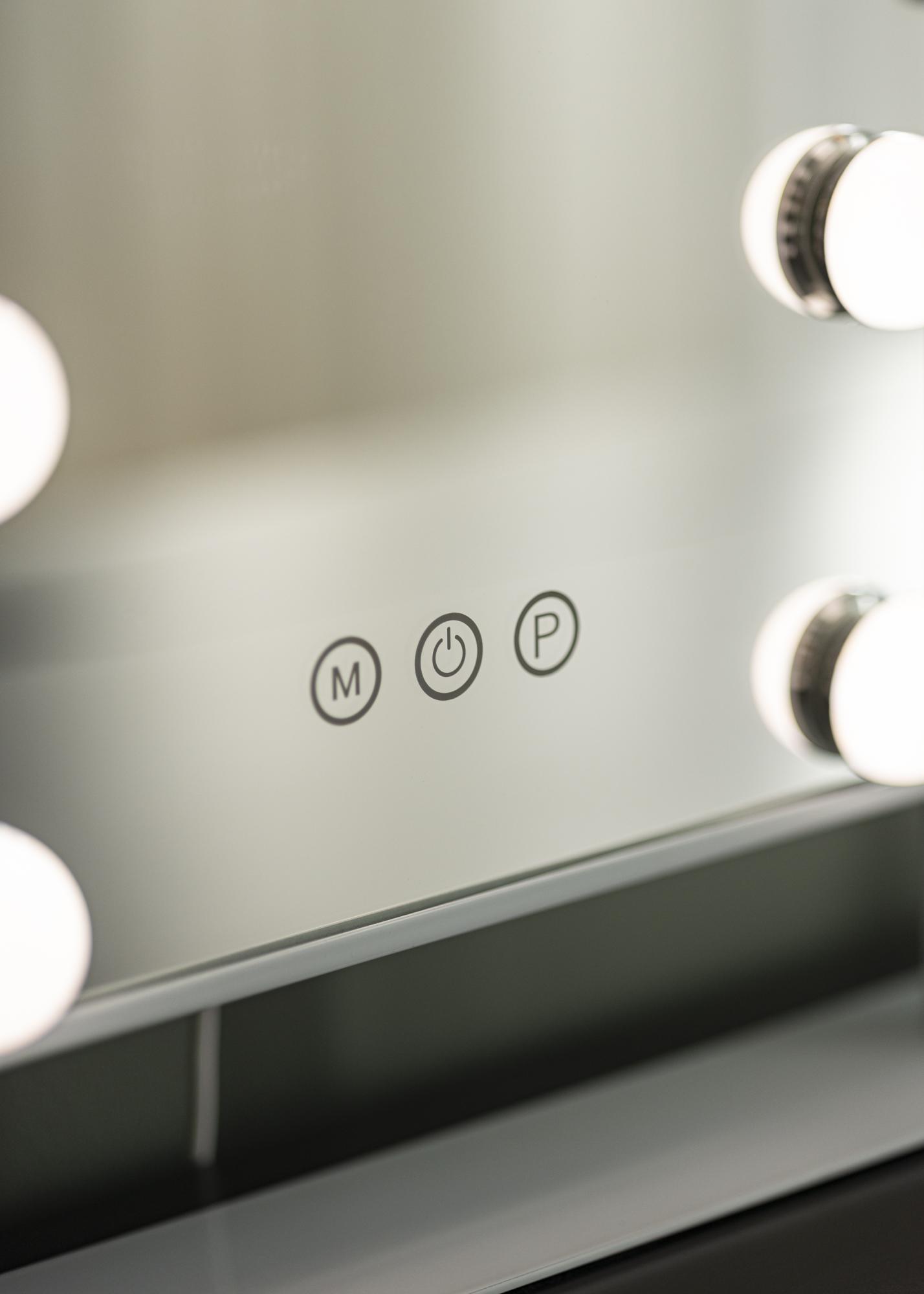 Осветлението се включва чрез бутон с докосване на предната част на огледалото. Има също така бутони с докосване за регулиране на яркостта и цветната температура, за да можете да настроите светлината точно по ваш вкус. Бутонът, маркиран с "P", ви позволява да затъмните светлината, а с бутона, маркиран с "M", можете да коригирате цветната температура на осветлението. Огледалото се свързва с щепсел.