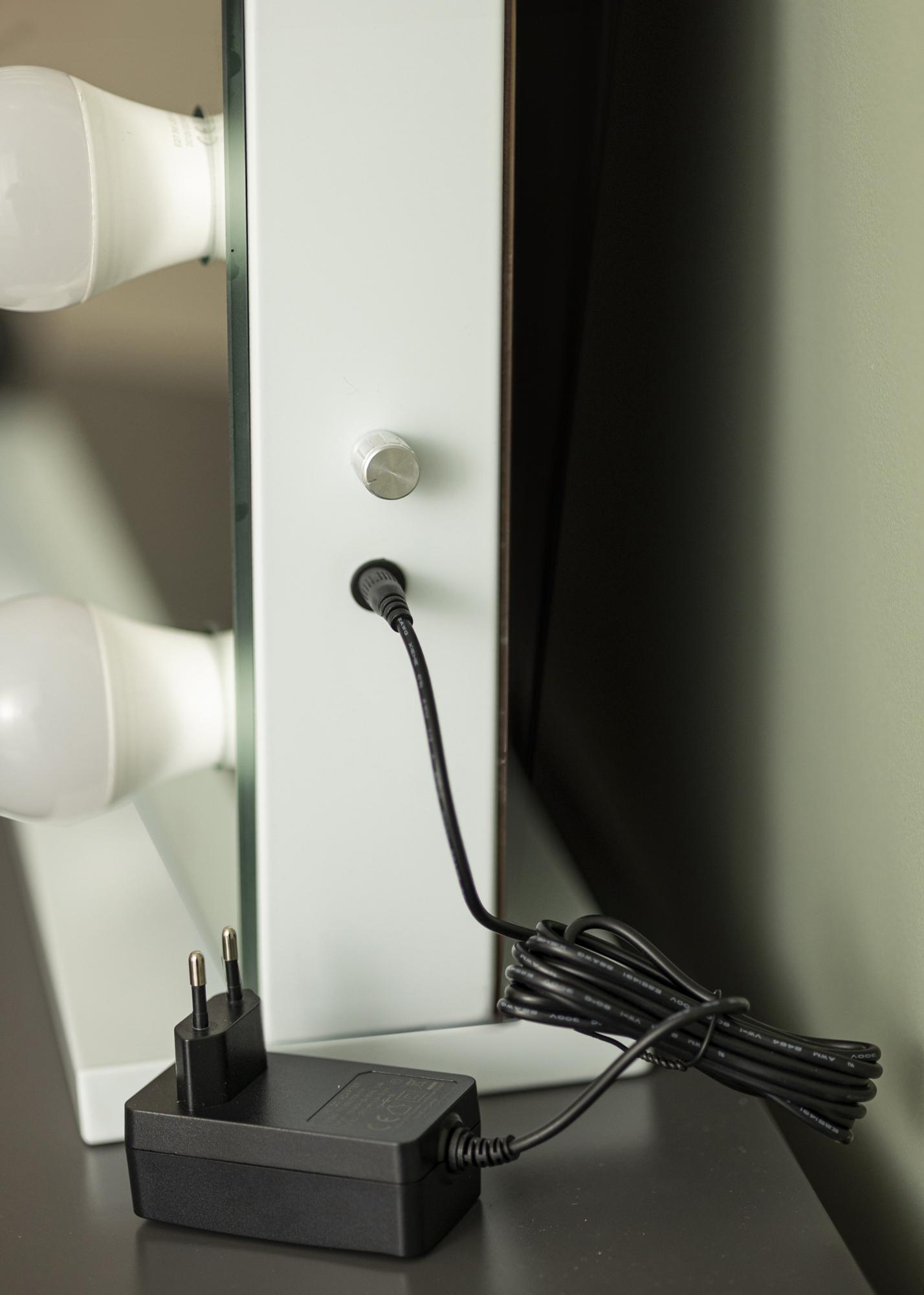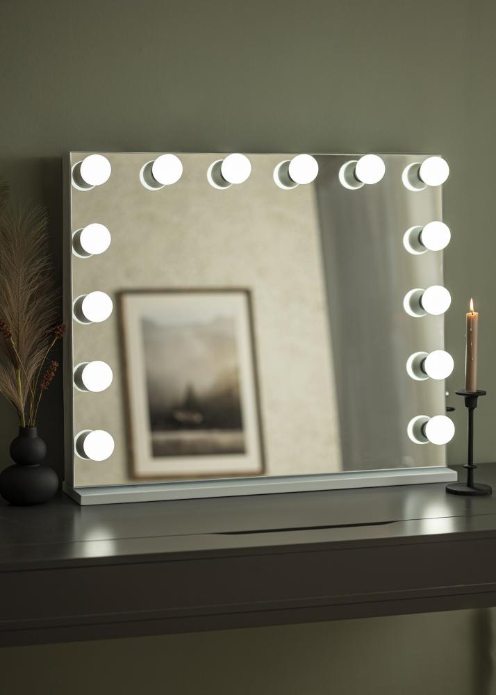 Това е уникално огледало за грим с дизайн, който напомня на гримьорна в Холивуд. Голямата повърхност на огледалото 80x65 см е обградена от 14 крушки с цокъл E27. Ефектът е равномерна, студена бяла светлина, която е подходяща както за гримиране, така и когато желаете модерна източник на светлина на масичката в хола. Осветлението е също така димируемо, за още повече гъвкавост. Просто завъртете копчето от едната кратка страна на огледалото и нагласете светлината по ваш избор.