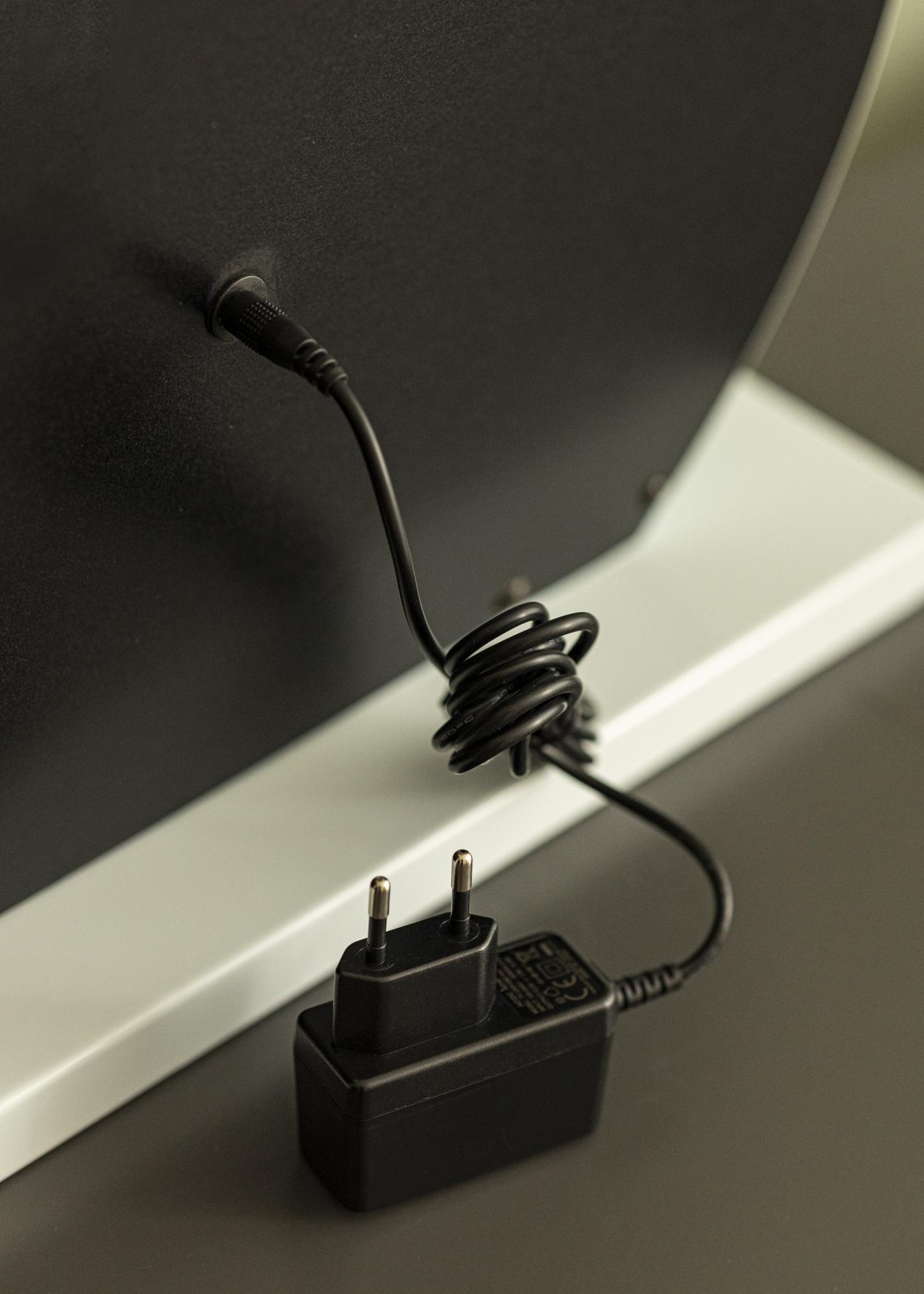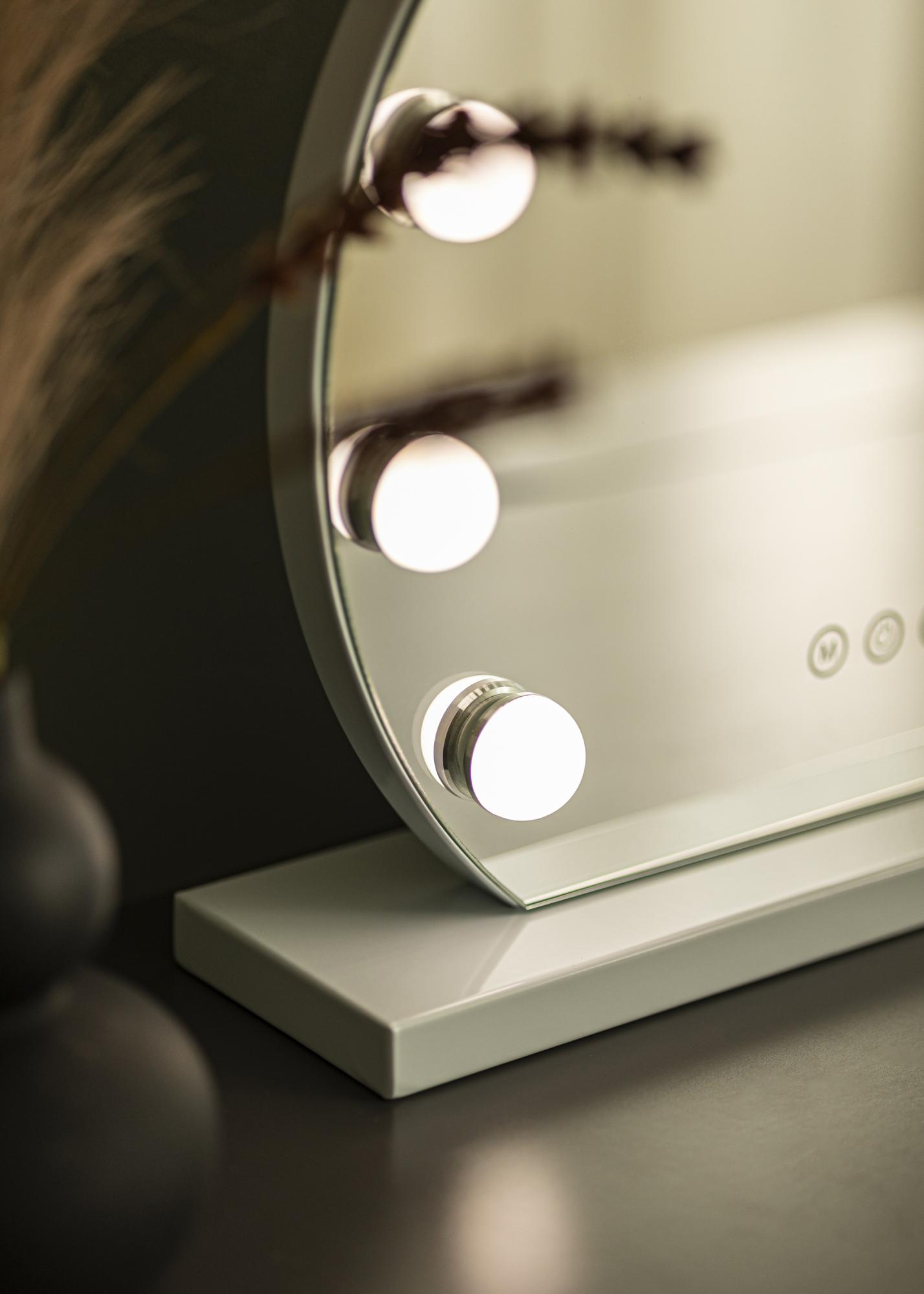 Това е луксозно огледало за грим с вградена LED осветление, което осигурява равномерна светлина върху лицето ви, когато се оглеждате. Осветлението се състои от 10 LED лампи, разположени по ръба на огледалната повърхност. Светлината може да се регулира според вашия вкус, тъй като имате възможност да настроите както яркостта, така и цветната температура. Настройките на светлината се извършват чрез сензорните бутони на долния ръб на огледалната повърхност, които са маркирани с букви. С бутона, маркиран с "M", можете да изберете цветна температура между топло, студено и естествено осветление. Бутонът, маркиран с "P", се използва за затъмняване на светлината. Има и бутон за включване/изключване, който се използва за включване или изключване на осветлението. Електрическото свързване се извършва с щепсел.