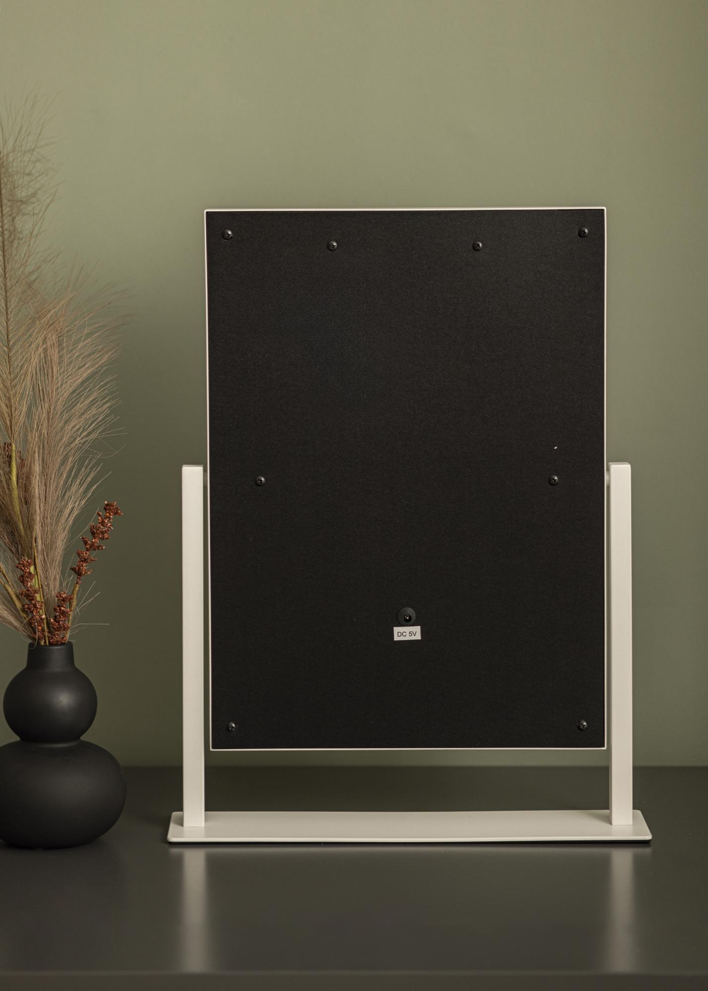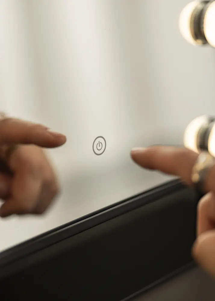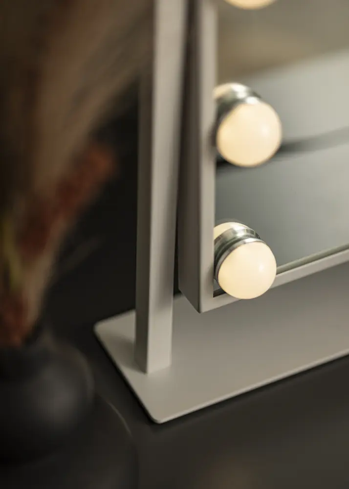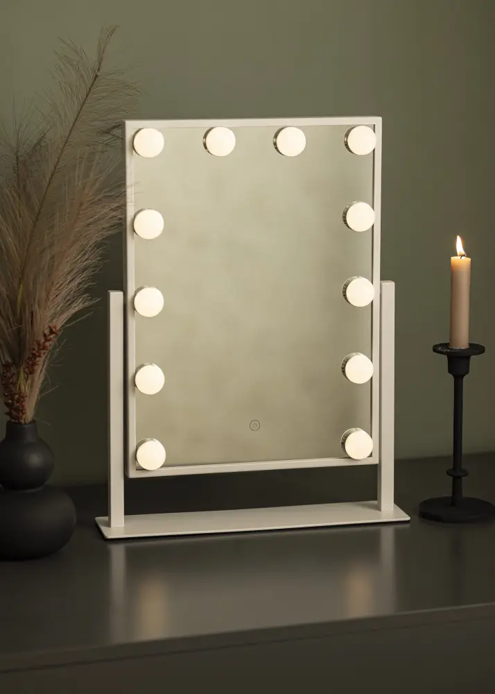 Това е огледало за грим с луксозен дизайн и 12 декоративни LED крушки в елегантен бял нюанс. Крушките стилно обграждат голямата повърхност на огледалото с размери 30x40 см и излъчват топла бяла светлина при 3000K. Осветлението се включва чрез натискане на сензорния бутон на екрана и има функция за затъмняване, която лесно регулирате, като задържите бутона за няколко секунди. Огледалото може да се накланя вертикално, така че лесно да се гримирате от ъгъл, който ви подхожда най-добре. Освен многото си функции, това огледало за грим става елегантен детайл и създава автентично усещане за Холивуд във вашия дом!