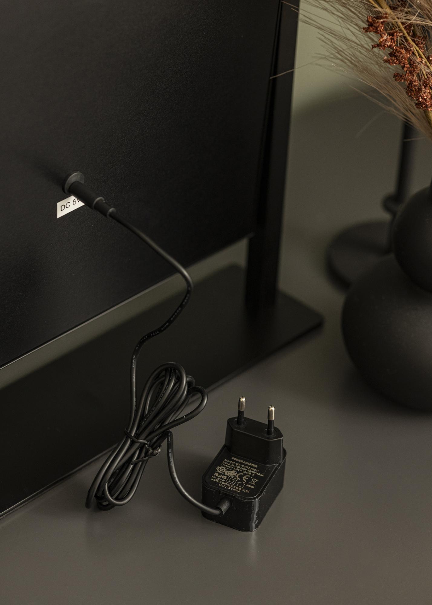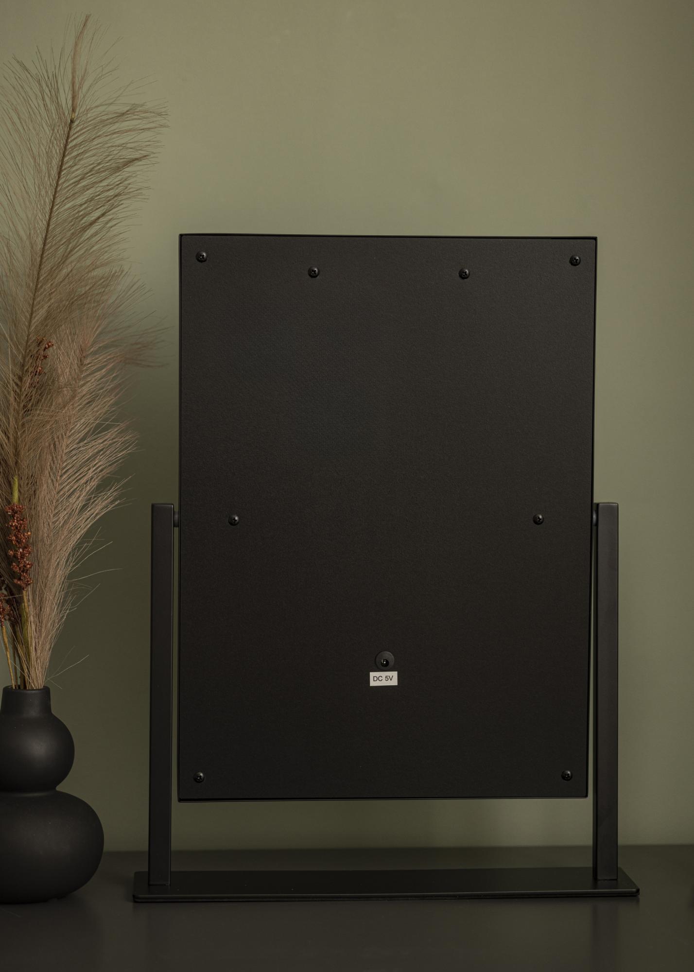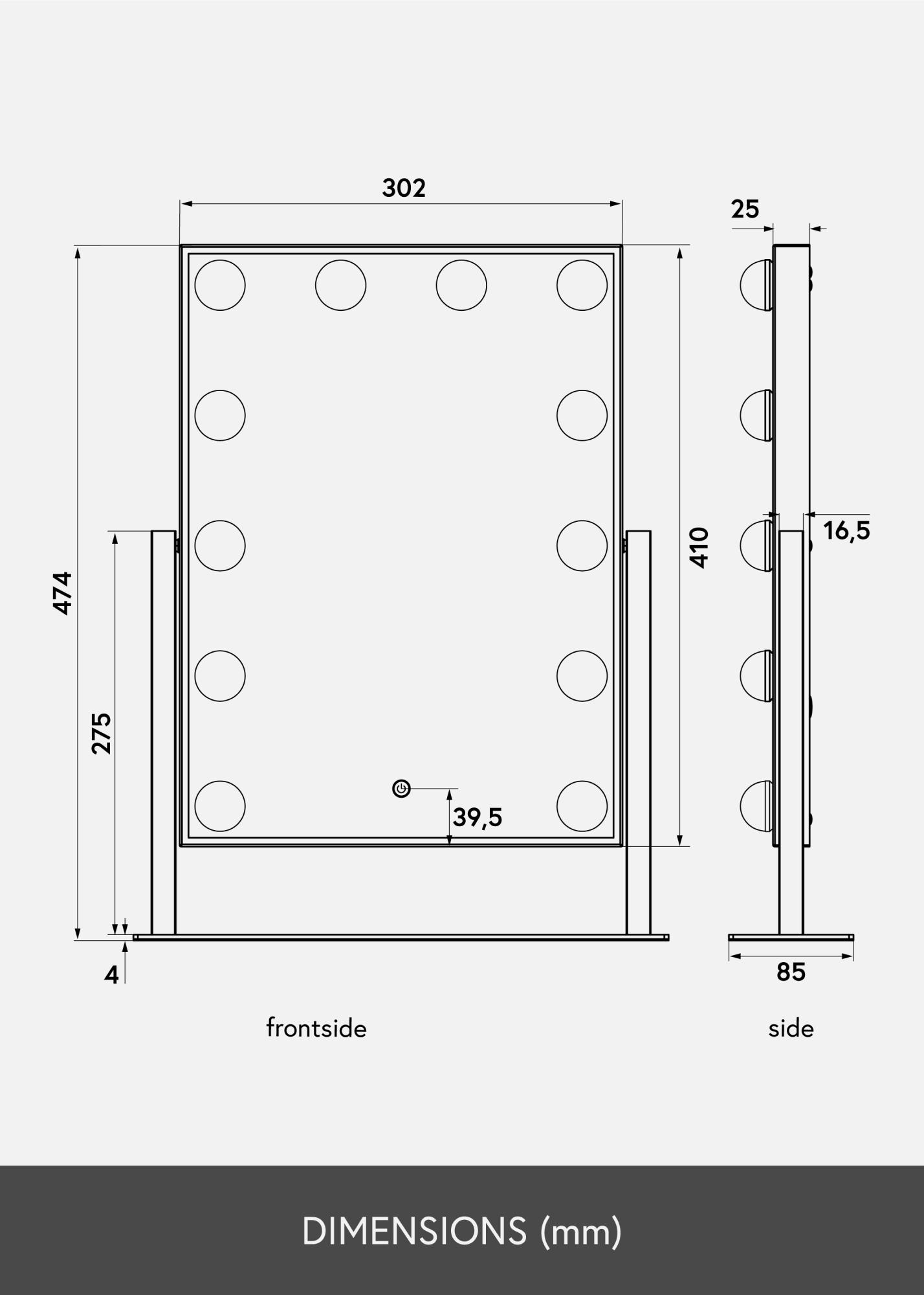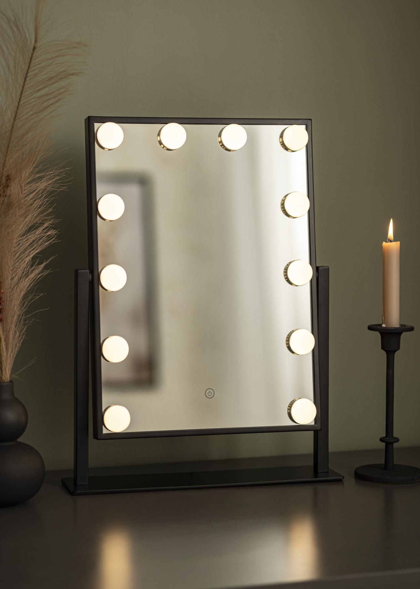 Това е огледало за грим с луксозен дизайн и 12 декоративни LED крушки в стилен черен цвят. Крушките стилно рамкират щедрата повърхност на огледалото с размери 30x40 см и излъчват топла бяла светлина от 3000K. Осветлението се включва чрез натискане на сензорния бутон на екрана и има функция за регулиране на яркостта, която лесно можете да настроите, като задържите бутона за няколко секунди. Огледалото може да се накланя вертикално, за да се гримирате от ъгъла, който най-добре ви подхожда. Освен многото си функции, това огледало за грим е елегантен детайл и създава истинско холивудско усещане у вас у дома!