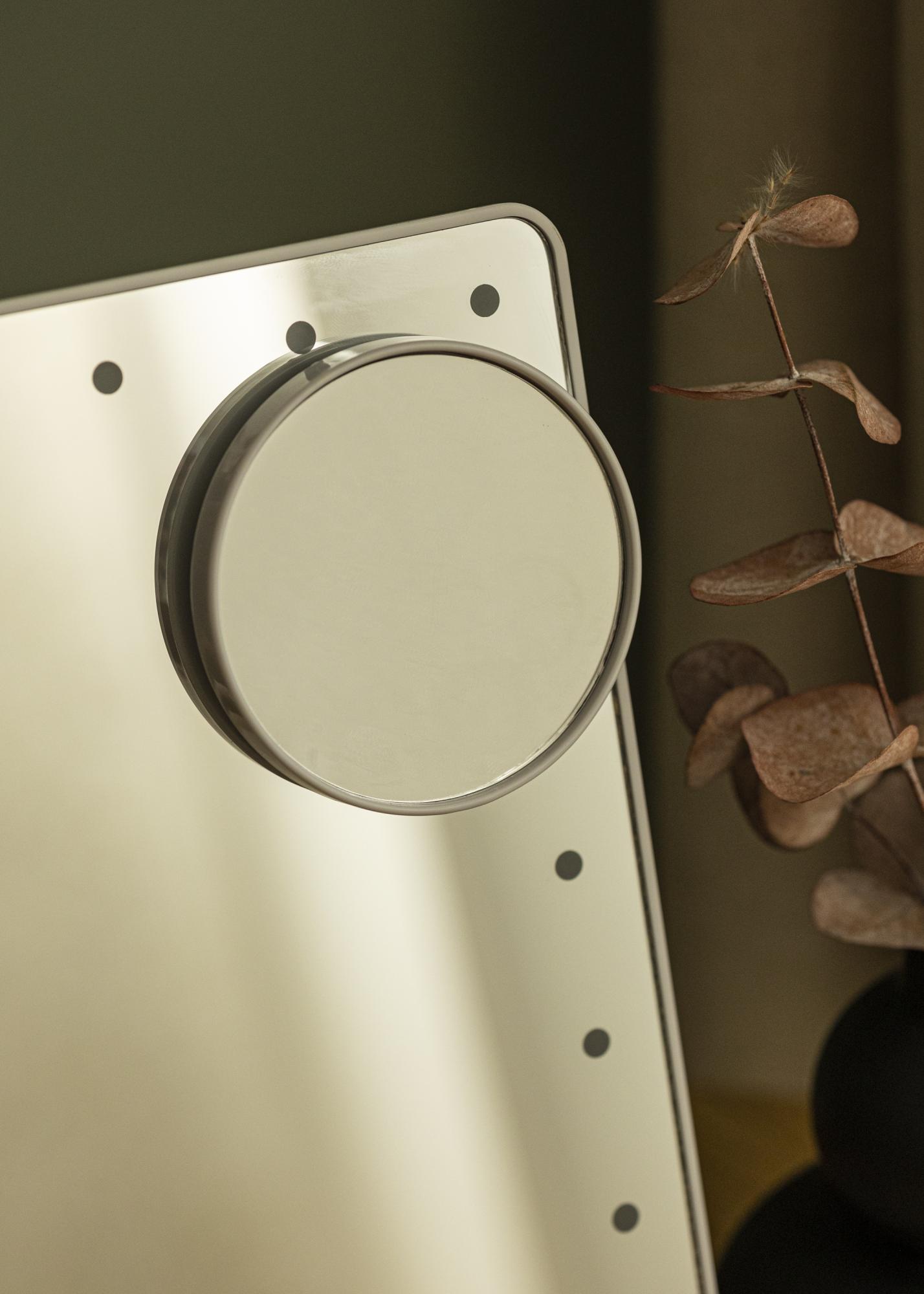 Огледалото има компактен размер с огледална повърхност от 16,5x25 см, която лесно може да се премества. Огледалната повърхност може както да се върти, така и да се накланя, за да се настрои ъгъл, който ви е удобен. Включена е по-малка огледало с 2x и 3x увеличение, което може да се използва самостоятелно или да се прикрепи към стъклото на по-голямото огледало. Това огледало за гримиране има и вградена LED осветление, която предоставя студена бяла светлина върху лицето ви, когато се оглеждате. Осветлението може да се включва и изключва чрез бутон за включване/изключване на гърба на огледалото, като същевременно имате възможност да регулирате яркостта на светлината. Огледалото се захранва от вградена батерия, която се зарежда чрез USB връзка. Кабел за зареждане е включен.