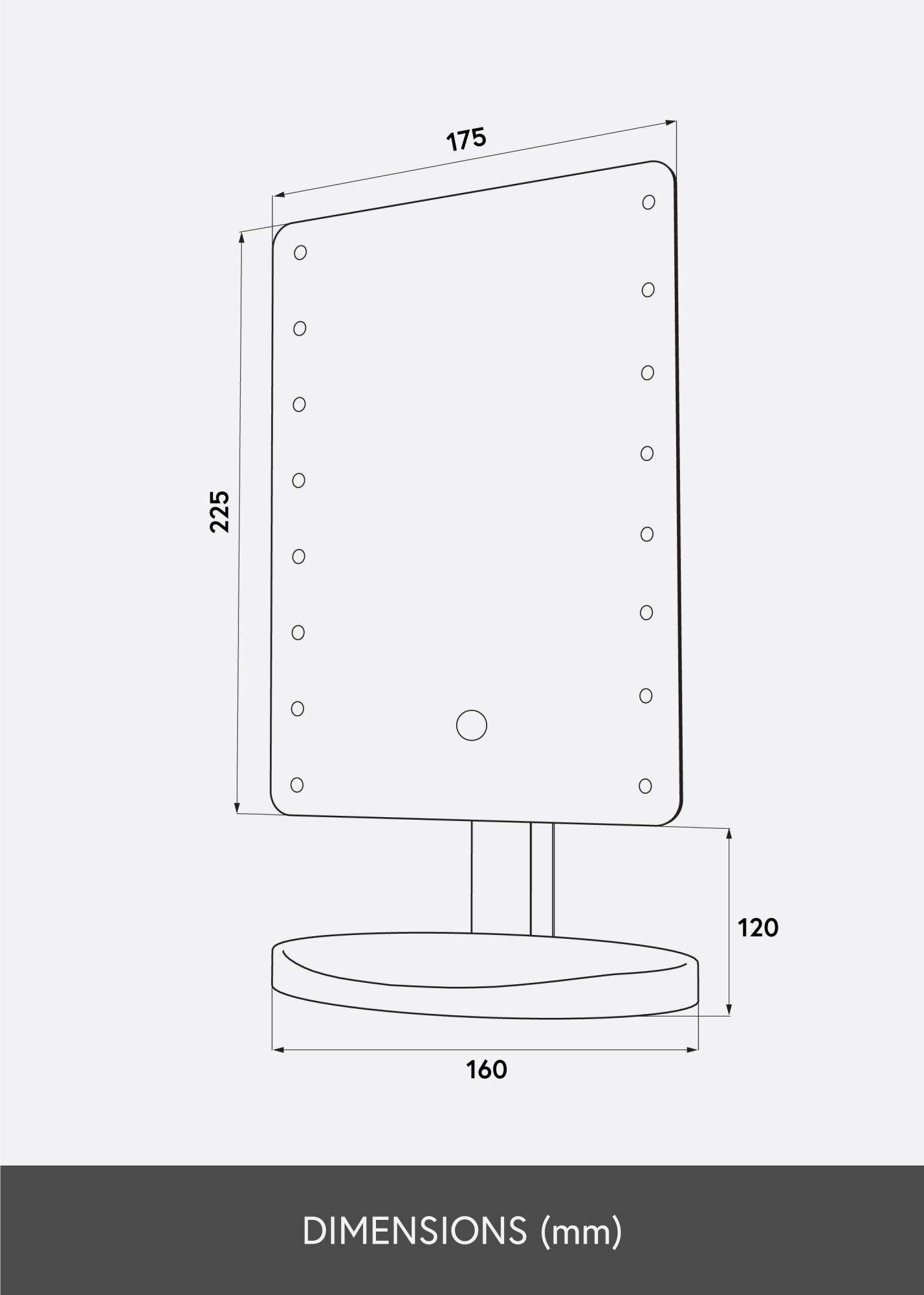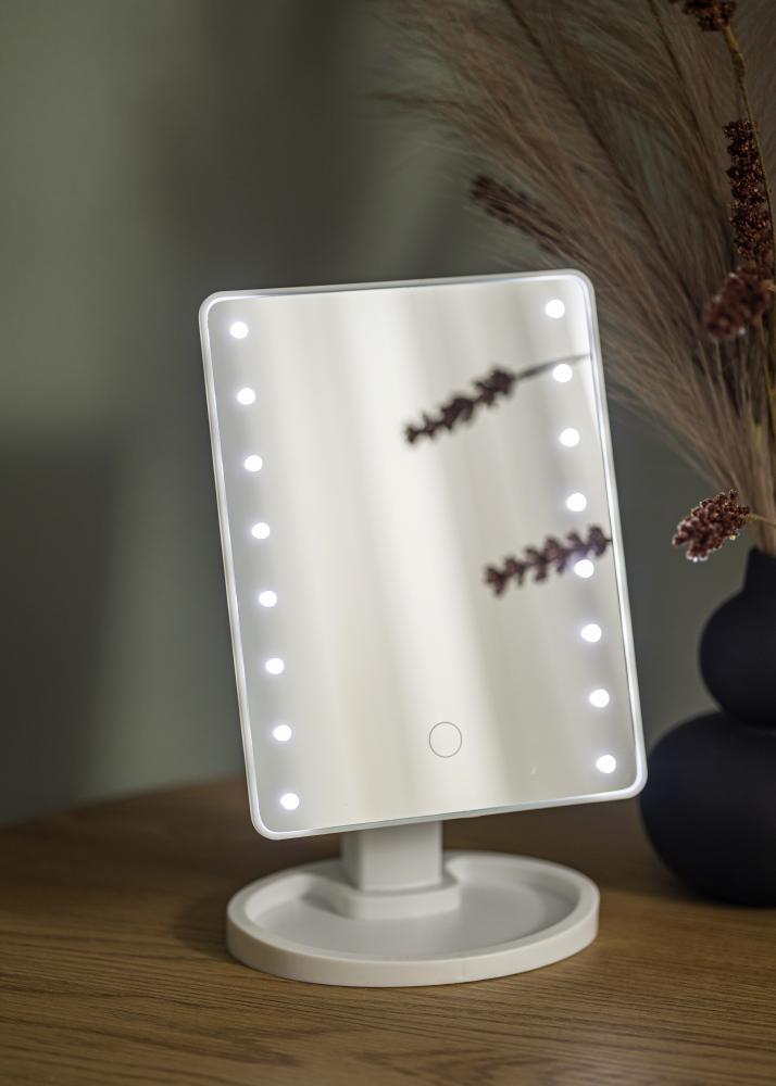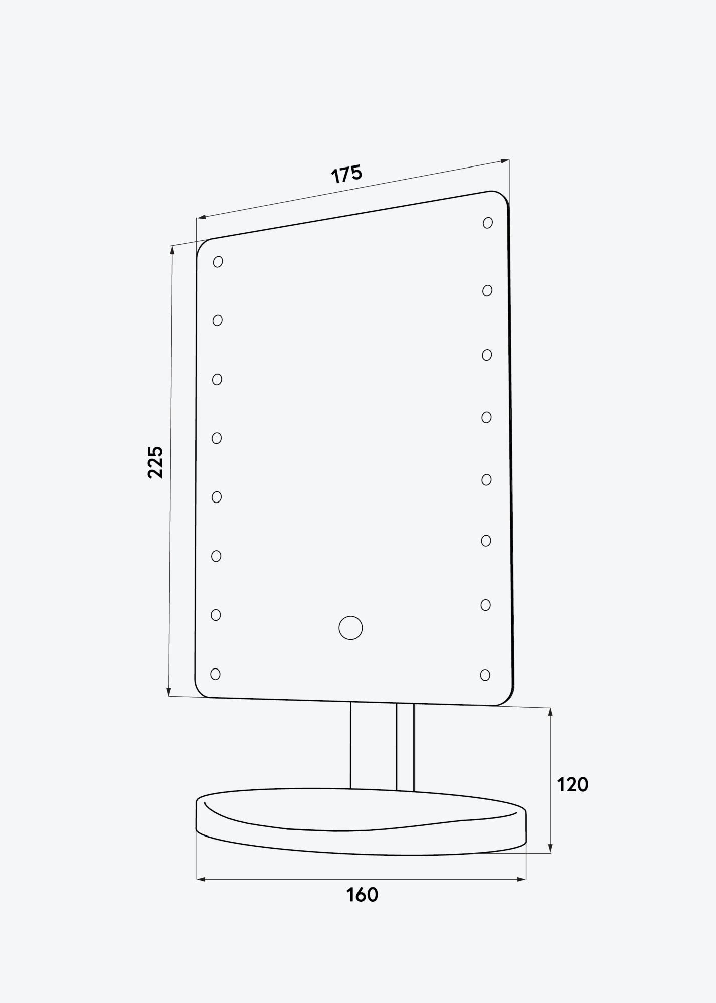Това е стилно огледало за грим, което е перфектно за използване както у дома, така и когато сте на път. То е много преносимо, с материал от лек композит и по-малък формат с огледална повърхност от 17,5x22,5 см. Огледалото може да се накланя и върти до хоризонтално положение.