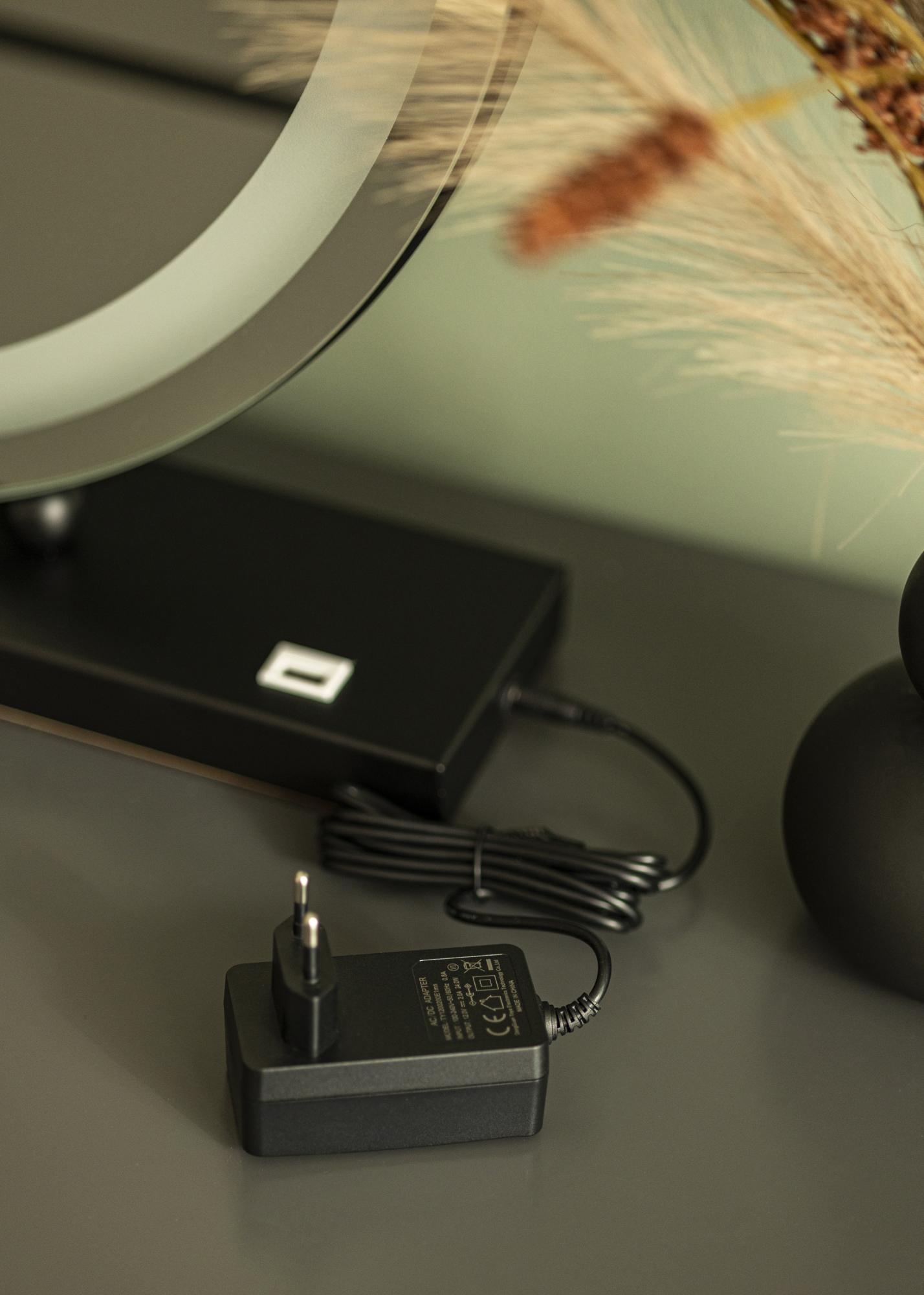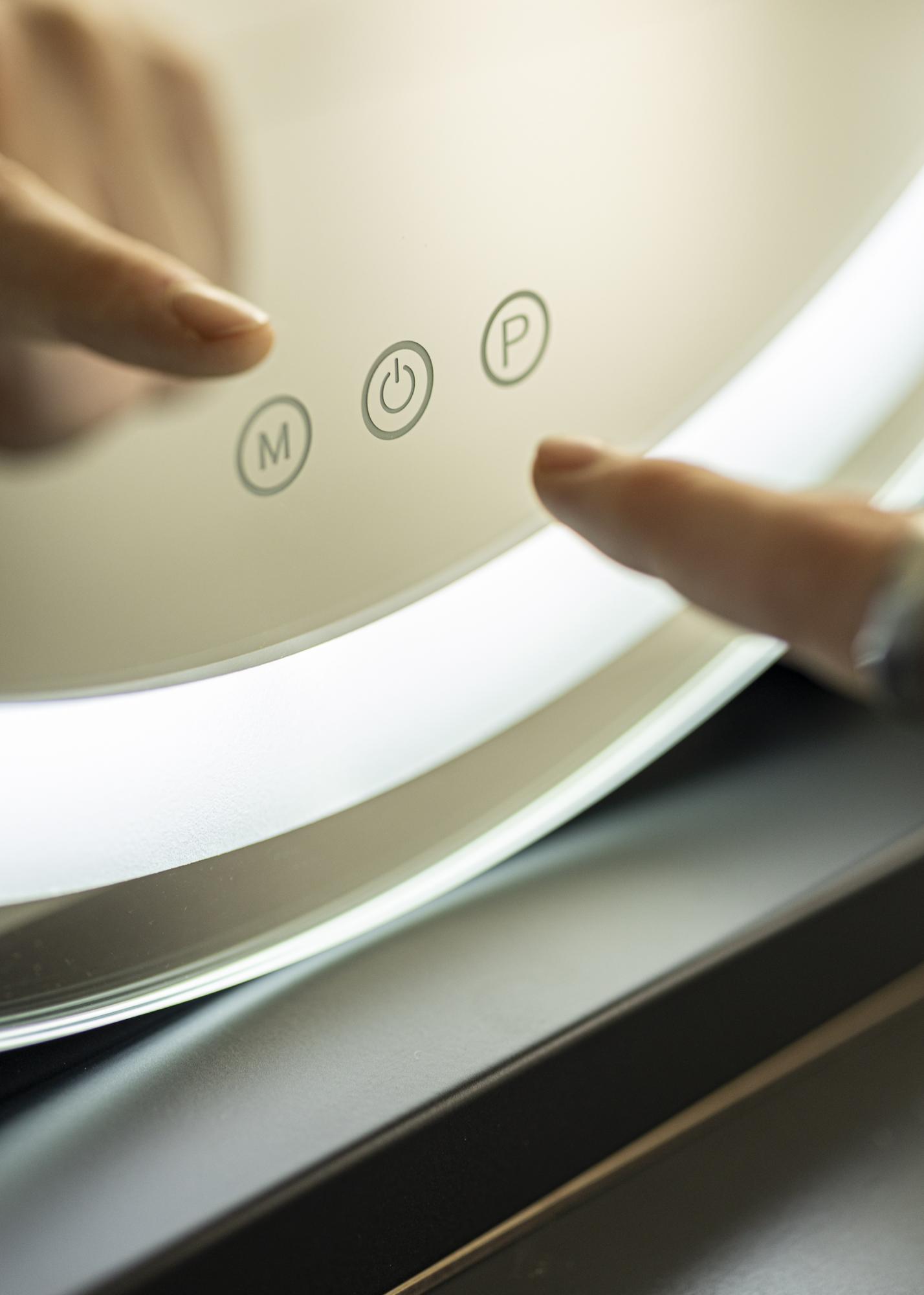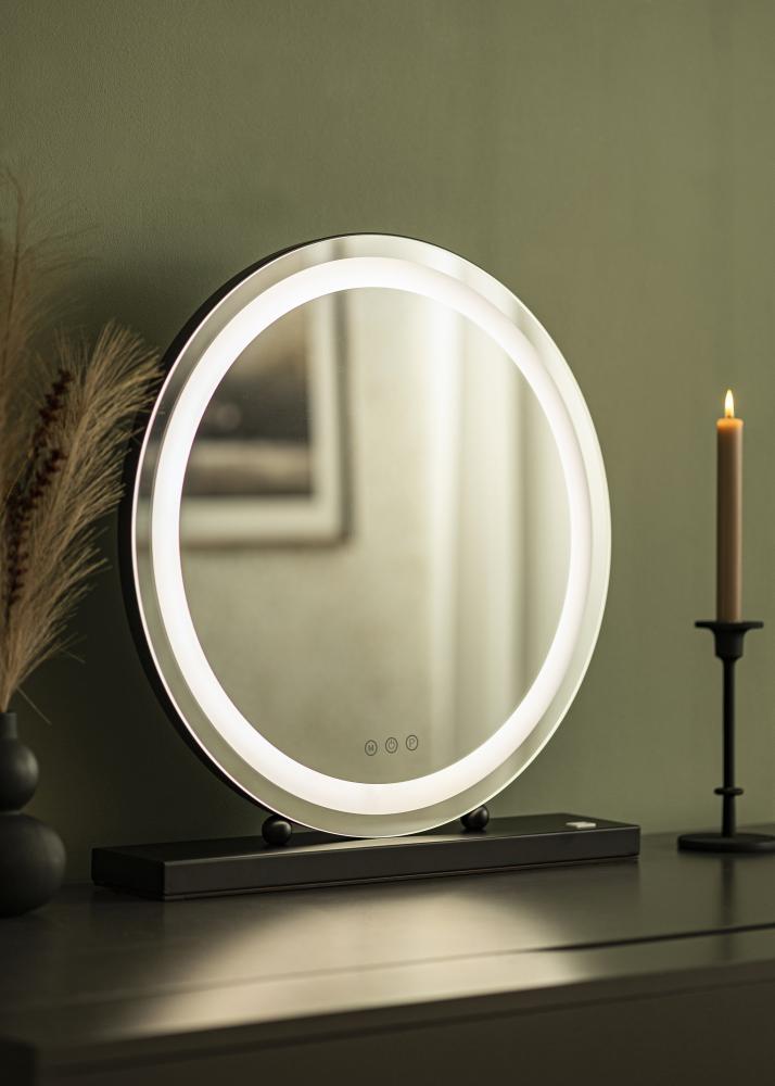 Това е гримьорско огледало в изправен модел, със стойка в неутрален черен цвят, който лесно може да се съчетае с останалата част от интериора. Огледалната повърхност има класическа кръгла форма с диаметър 50 см, която красиво е обрамчена от интегрирана LED лента. Има три сензорни бутона в долния край на огледалната повърхност - бутон за включване/изключване, който запалва и гаси осветлението, бутон "M", който регулира цветната температура на светлината и бутон "P", който ви позволява да затъмните яркостта на осветлението както желаете. Електрическата връзка се осъществява чрез щепсел.