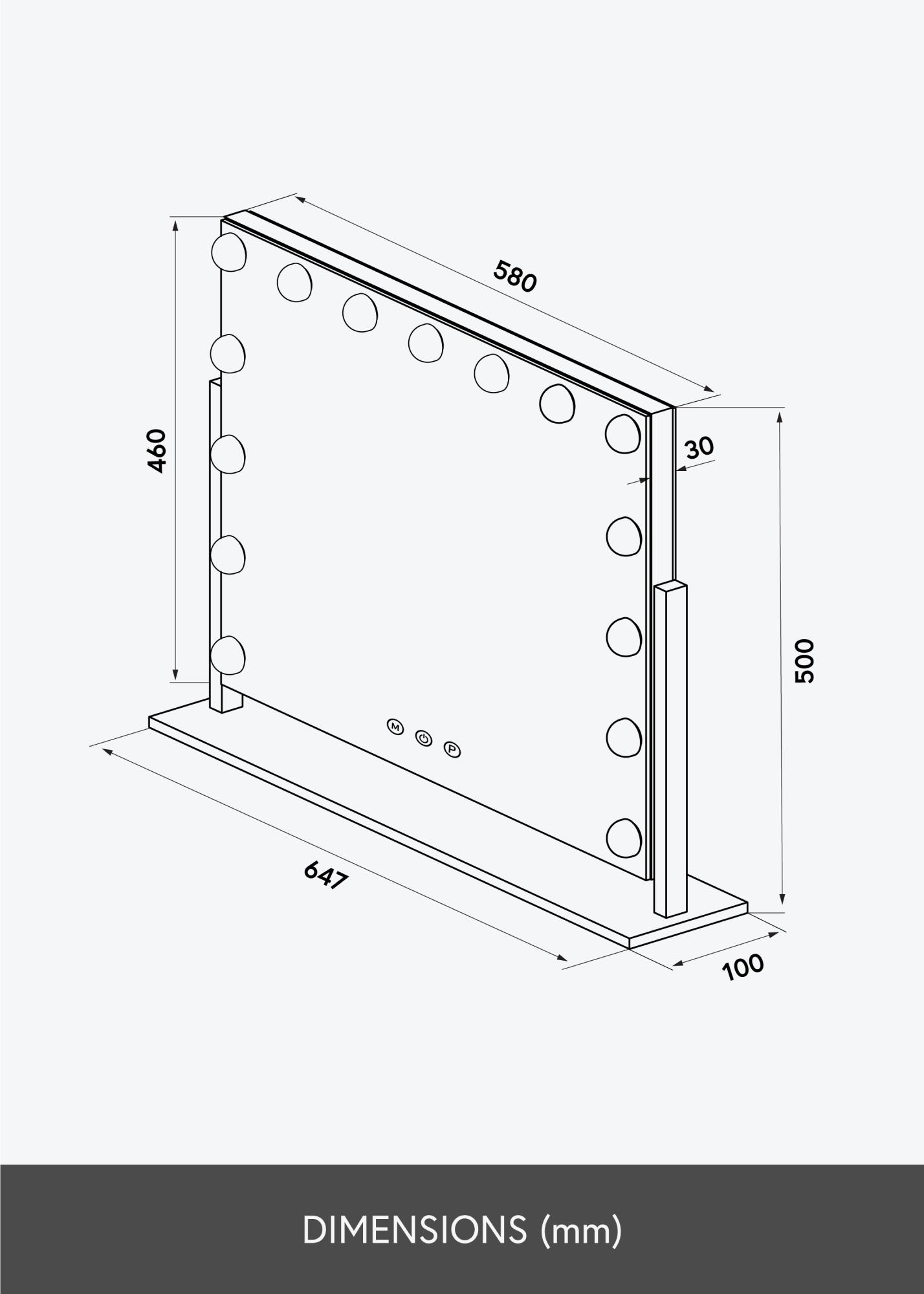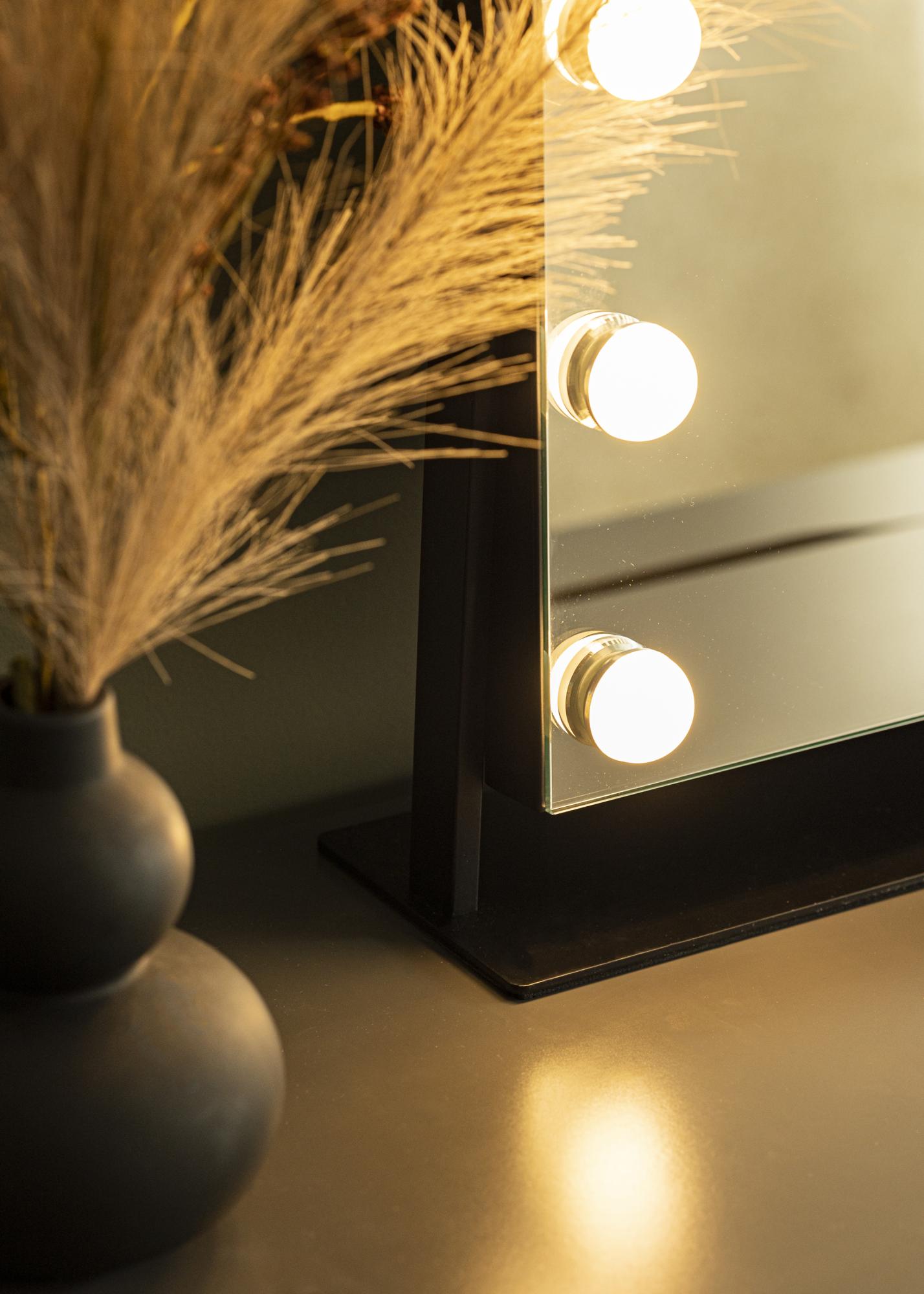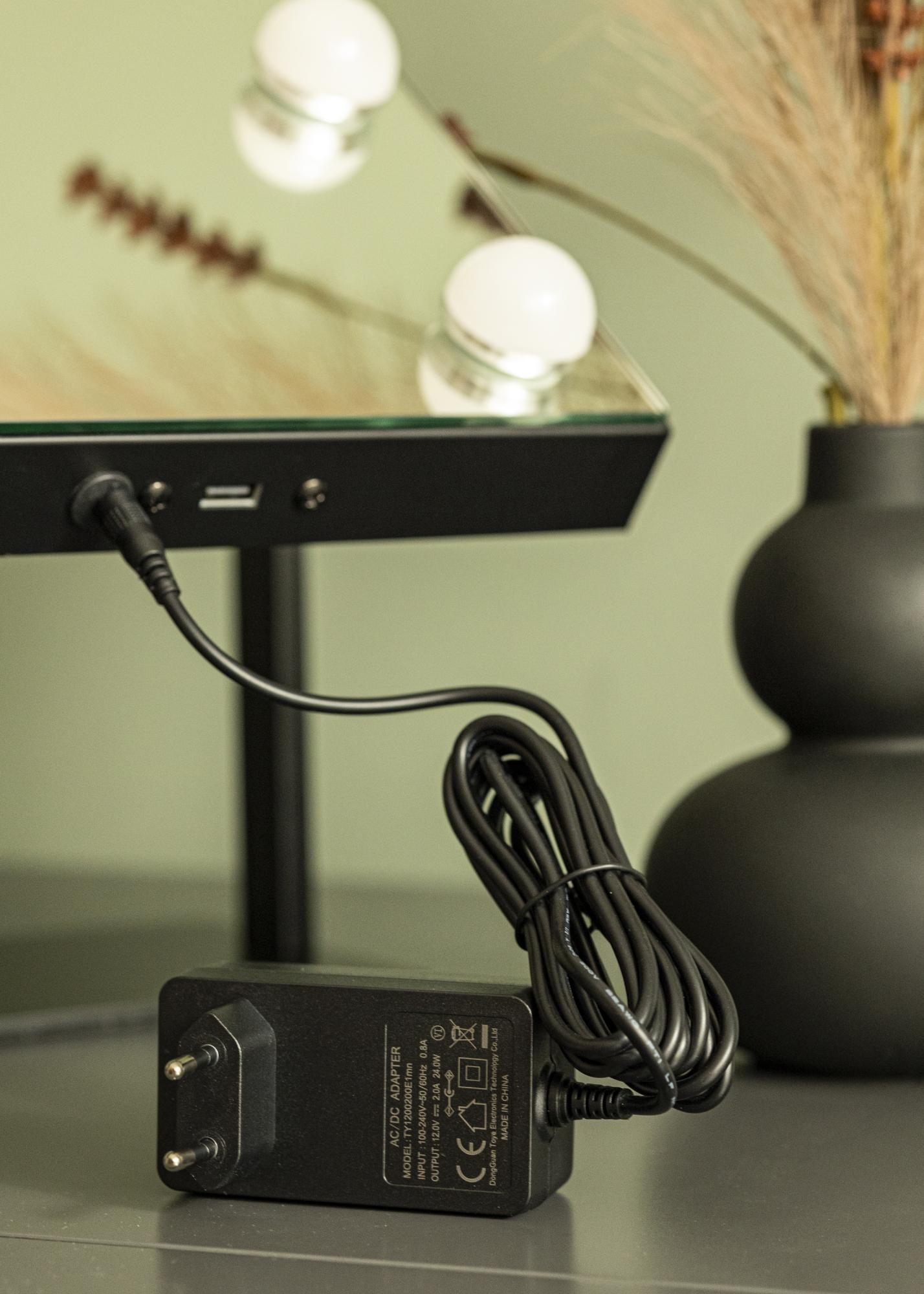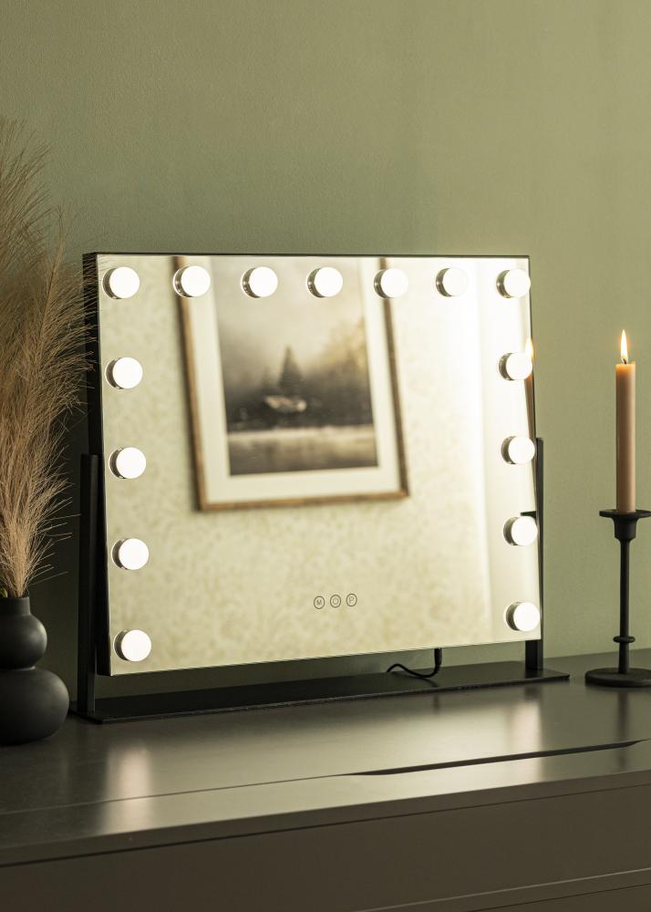 Огледалото за грим е изработено от черна боядисана метал с поставка, която позволява то да бъде поставено стоящо на равна повърхност. Огледалната повърхност с размери 58x46 см може да бъде наклонена в предпочитаната от вас позиция. В долния край на огледалото има USB порт, за да можете да зареждате смартфона си, докато се оглеждате.