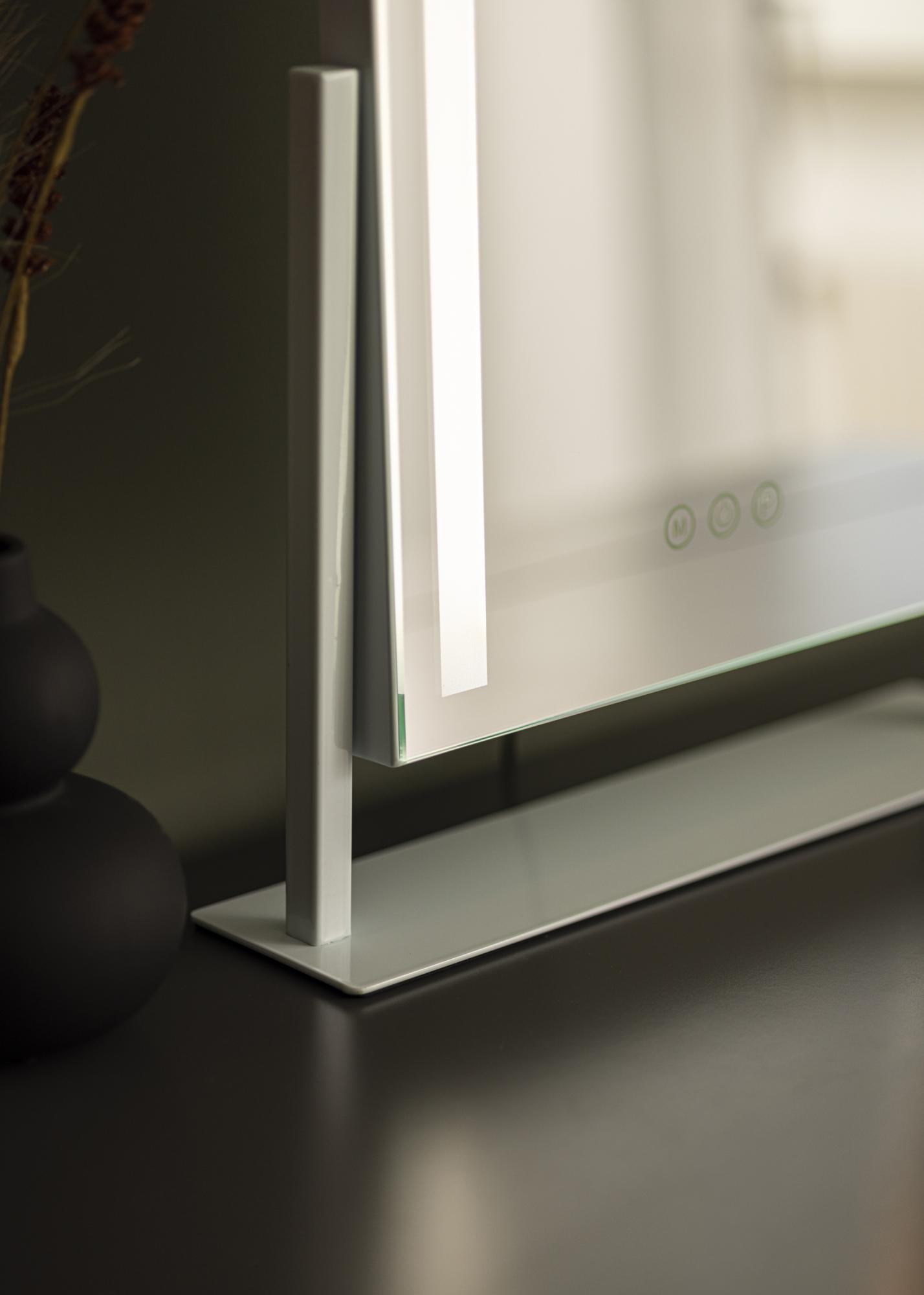 Това е добър избор за вас, ако търсите елегантно огледало за грим с вградена осветление. Осветлението се състои от светлинна лента, която обрамчва огледалната повърхност и осигурява равномерна светлина върху лицето ви, когато се оглеждате. На предната страна на огледалото има три сензорни бутона, с които можете да включвате и изключвате лампата, да регулирате цветната температура и да намалявате светлината. Можете да избирате между три цветни температури – топла, студена и естествена светлина. Така можете да се уверите, че светлината на огледалото е подходяща за всяка ситуация. Натискате бутона "M" за да настроите цветната температура и бутона "P" за да регулирате яркостта.