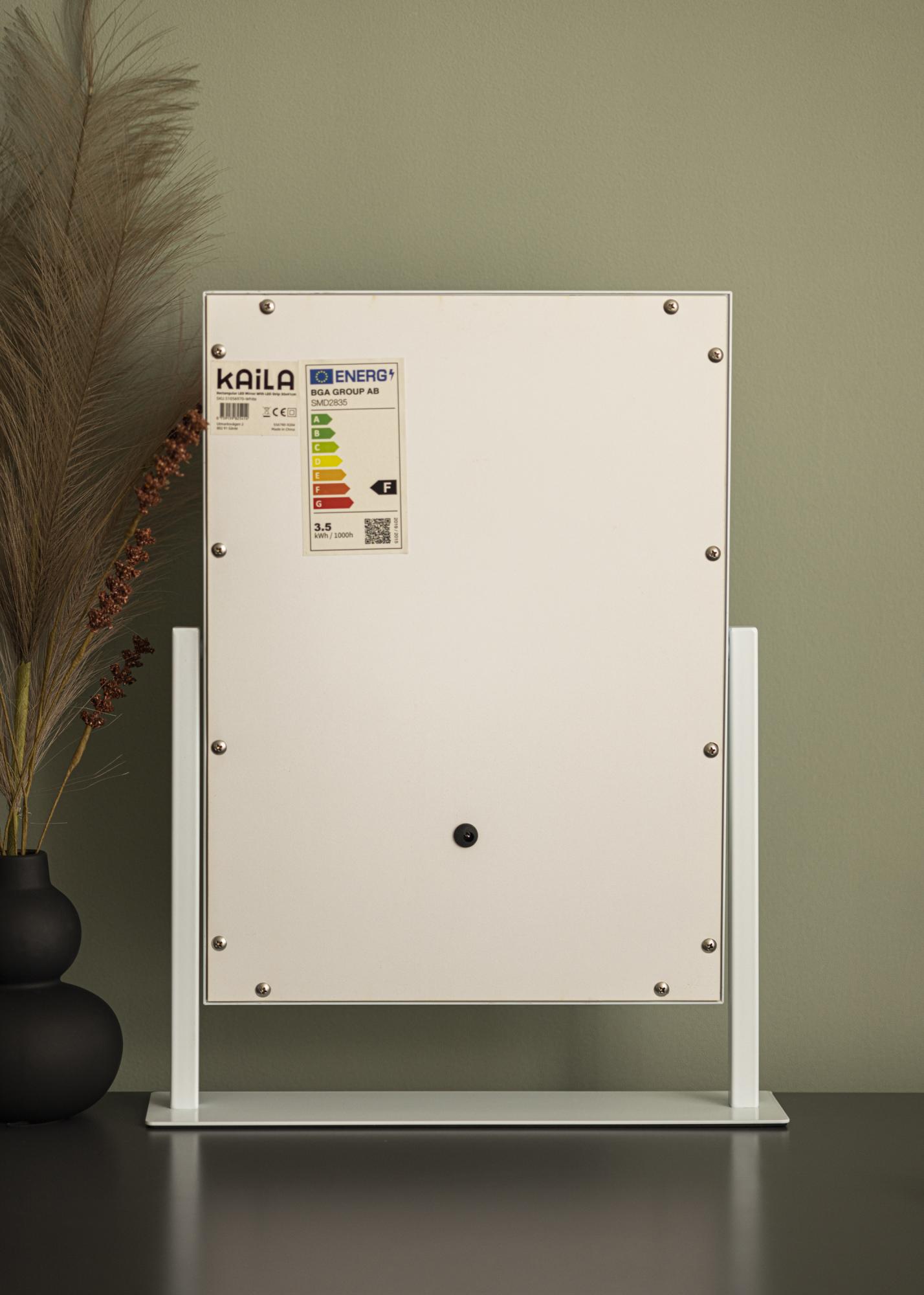 Това огледало има метална стойка и елегантен бял цвят, който осигурява стилен външен вид. Благодарение на компактния формат, с огледална повърхност 30x41 см, то лесно се побира на масата в козметичния ъгъл, както и на скрина в коридора или всекидневната. Умният дизайн ви позволява да накланяте огледалото. Електрическата връзка се осъществява чрез контакт.