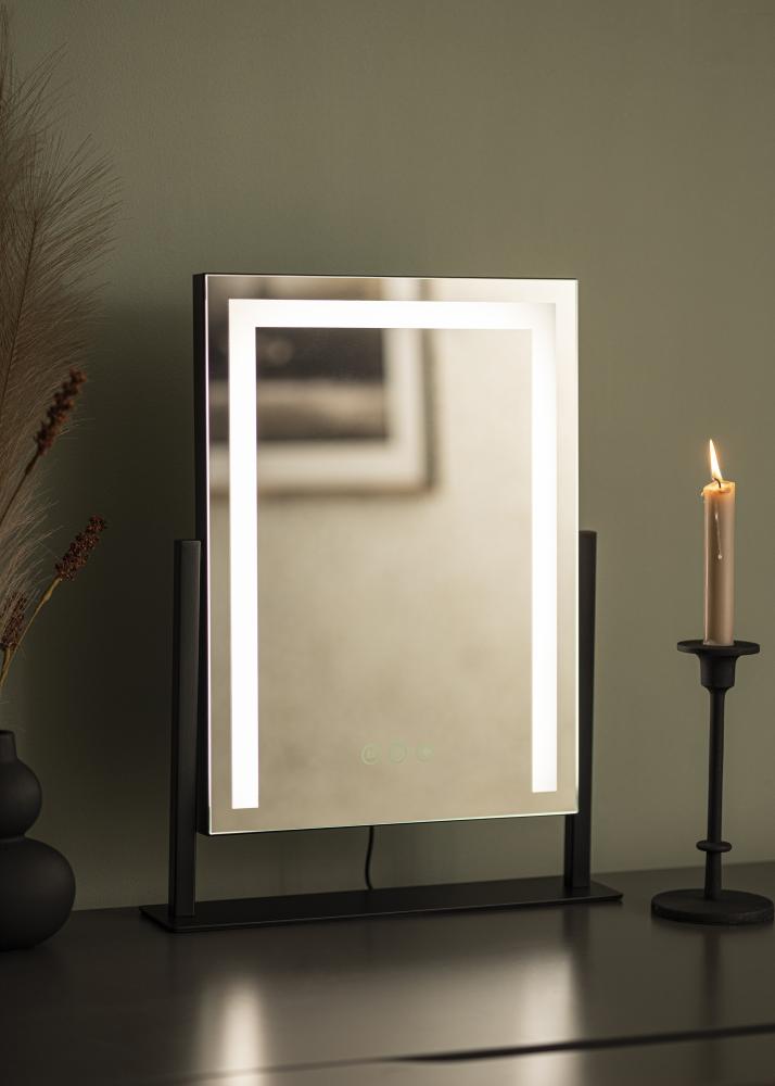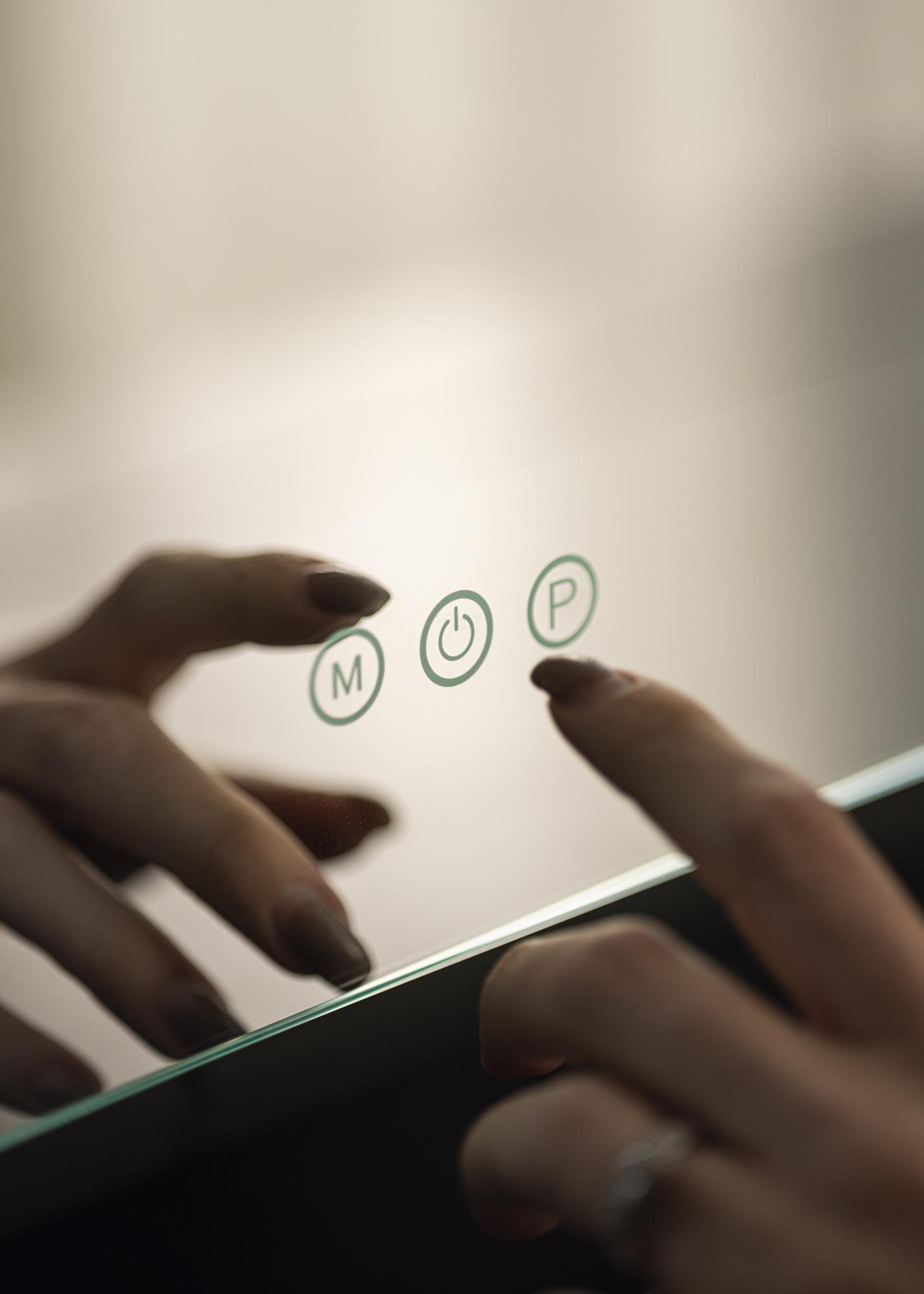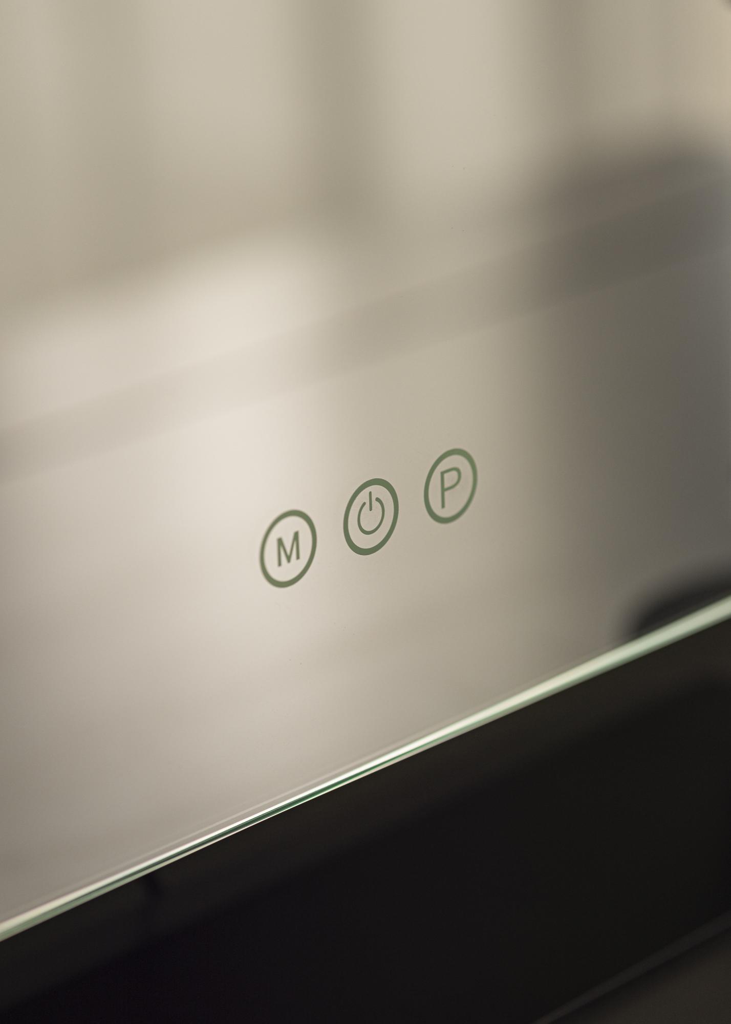 Това огледало има интегрирана LED лента, която рамкира огледалната повърхност. Можеш да регулираш осветлението с помощта на бутон с докосване, маркиран с "P", и да настроиш цветната температура на светлината с бутон с докосване, маркиран с "M". По този начин можеш да променяш настройките на осветлението на огледалото за всеки случай, независимо дали искаш мека фонова светлина или по-ярка светлина, която да ти помага да се фокусираш на огледалния си образ. Има и бутон за включване/изключване, който можеш да използваш, за да включваш и изключваш осветлението на огледалото. Захранването се осъществява чрез щепсел.
