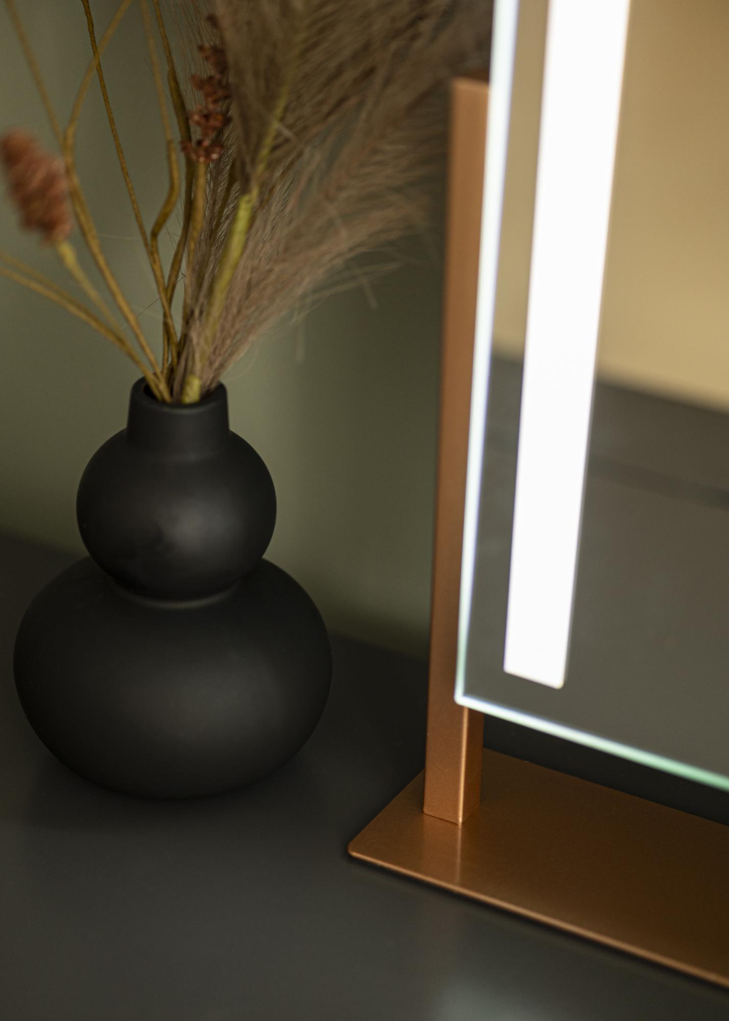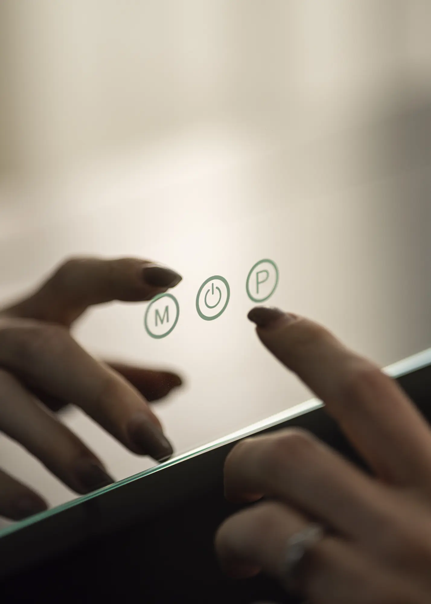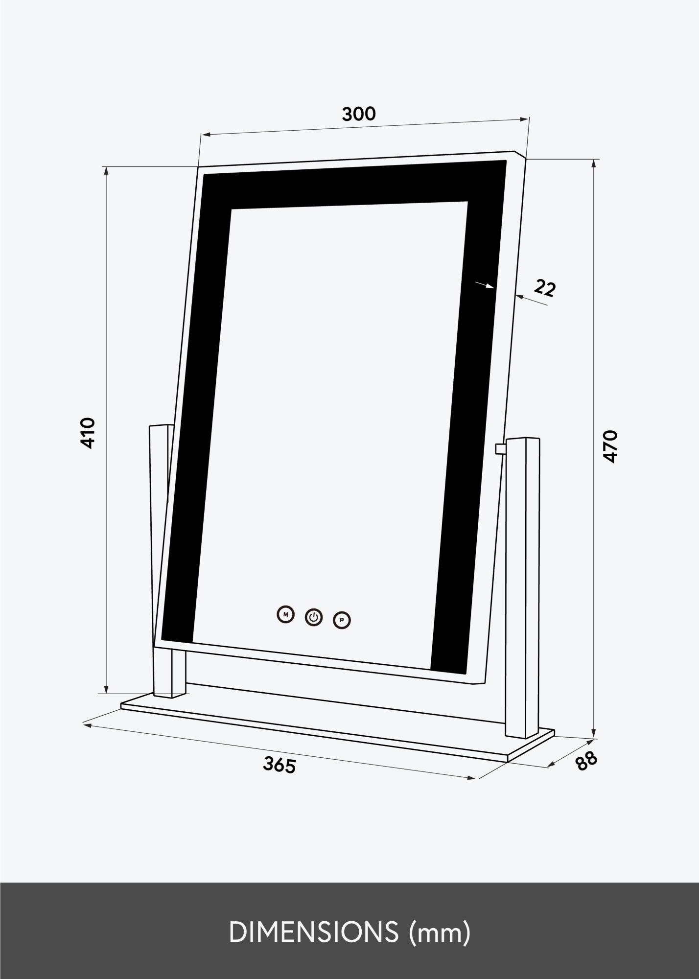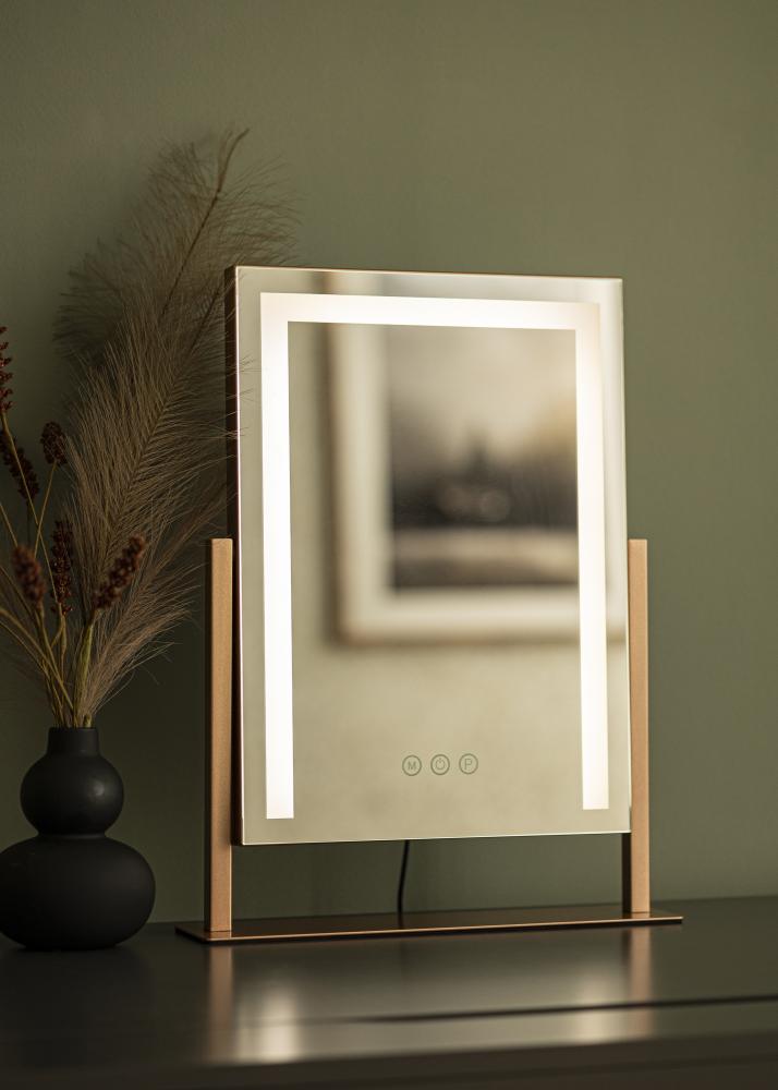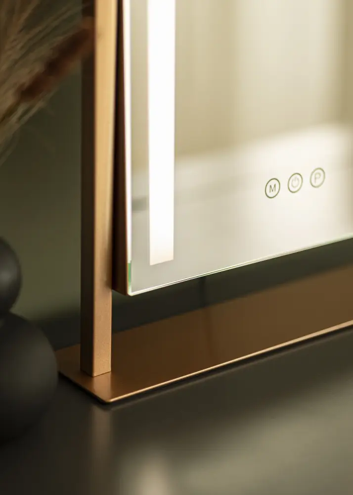 Елегантното огледало с осветление е както модерен интериорен детайл, така и перфектен помощник при нанасянето на грим сутрин. Това е модел със сложна метална конструкция в цвят розово злато и интегрирана LED лента, която рамкира огледалната повърхност. Можете да включвате и изключвате осветлението по желание и да регулирате светлината според личния си вкус – всичко това с помощта на сензорните бутони в долния край на огледалото. Има класически бутон за включване/изключване, както и бутон за регулиране на яркостта (маркиран с "P") и бутон, който използвате, за да настроите цветната температура на светлината (маркиран с "M"). Така можете да избирате между топла, студена и естествена светлина.