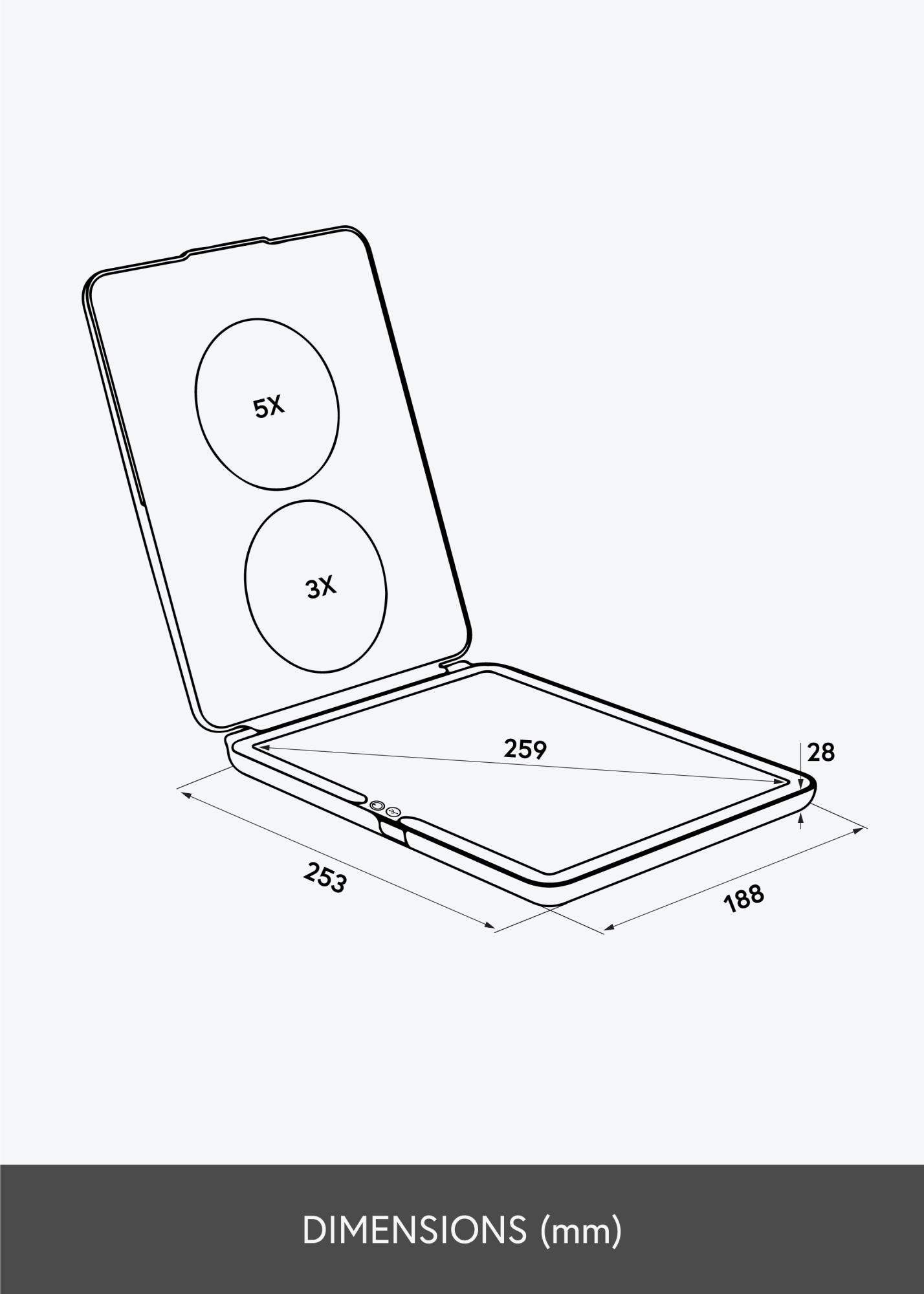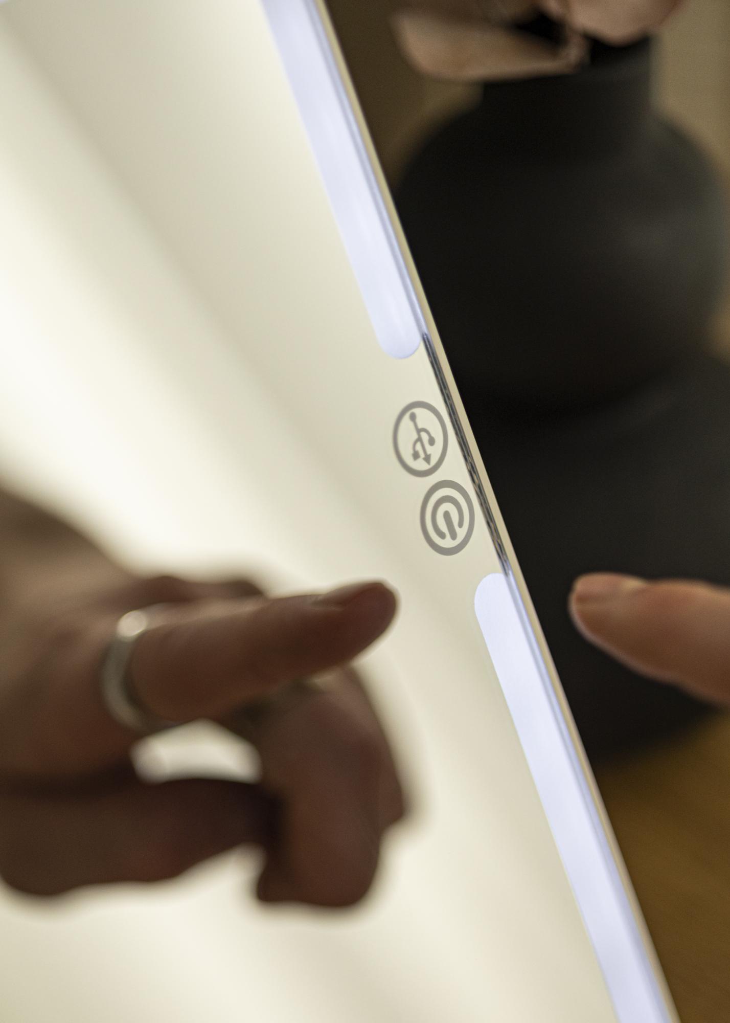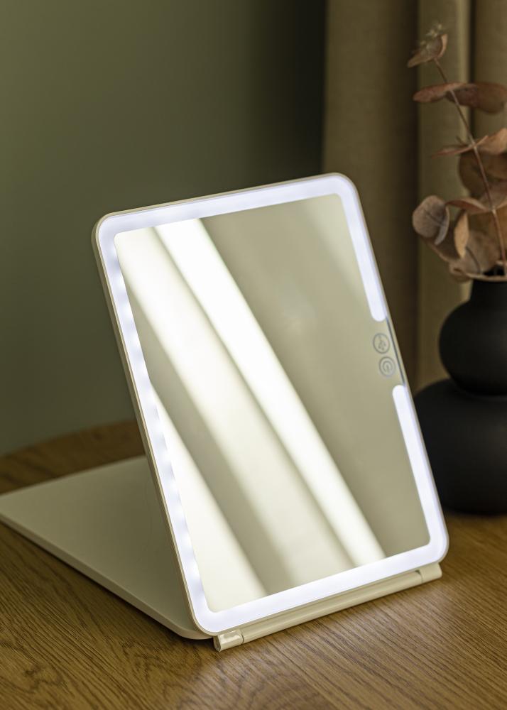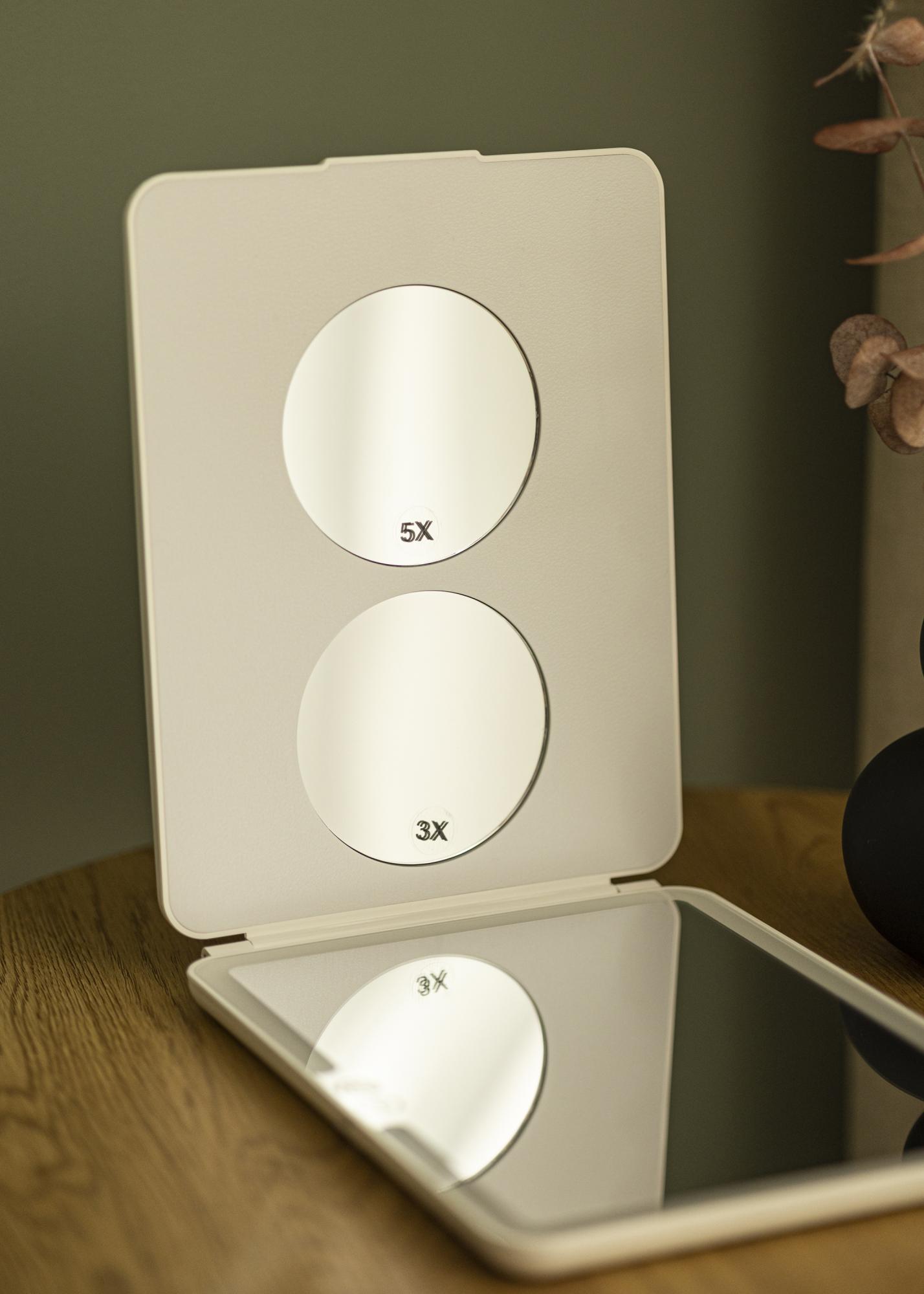 Това е гримово огледало в по-малък размер, с умна сгъваема конструкция, която позволява лесно накланяне на огледалото при използване. Сгъваемият дизайн също спестява място и защитава огледалната повърхност, когато огледалото е в чантата. Това е отлично огледало за носене при пътуване, тъй като е едновременно компактно, леко и има вградено осветление, което осигурява равномерна светлина на лицето ви, когато се гледате. Осветлението се включва и изключва с помощта на тъч-бутон на рамката на огледалото. Ако задържите бутона за няколко секунди, можете да затъмните светлината и да настроите цветната температура.