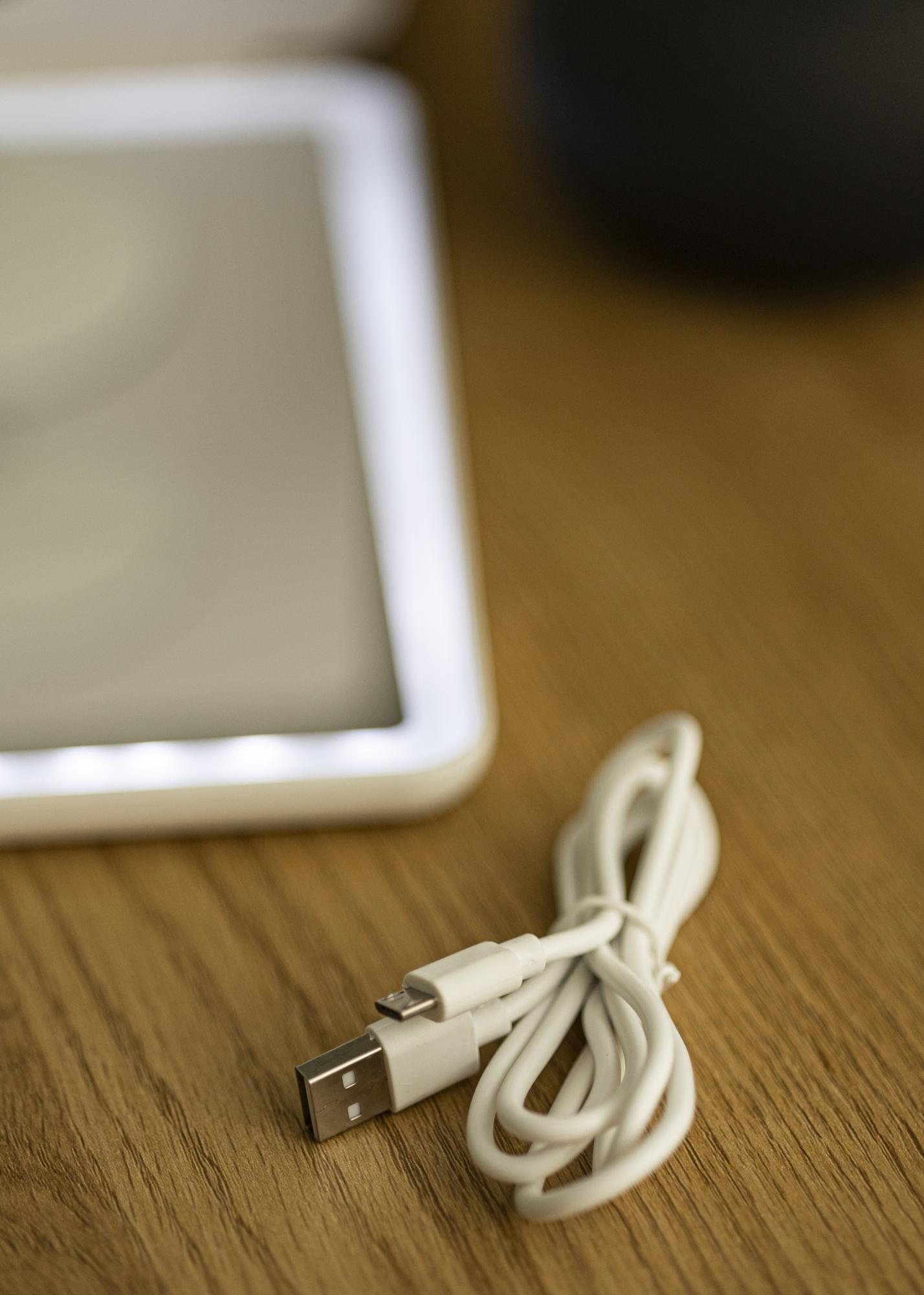 Когато запаленото огледало се сгъне, то автоматично преминава в режим на пестене на енергия, докато не го отворите отново. Това гримово огледало е захранвано от батерия и се зарежда чрез USB връзка.
