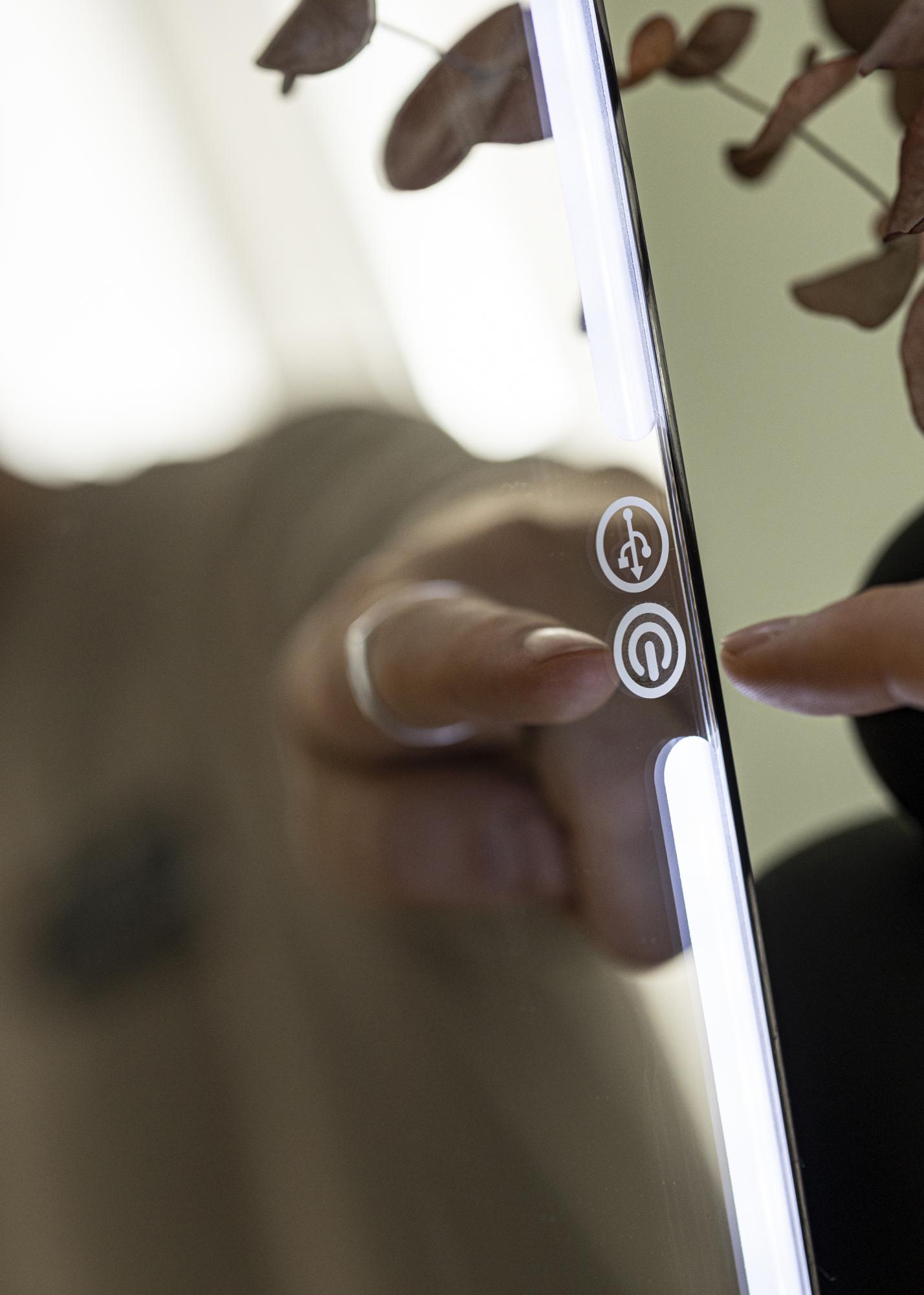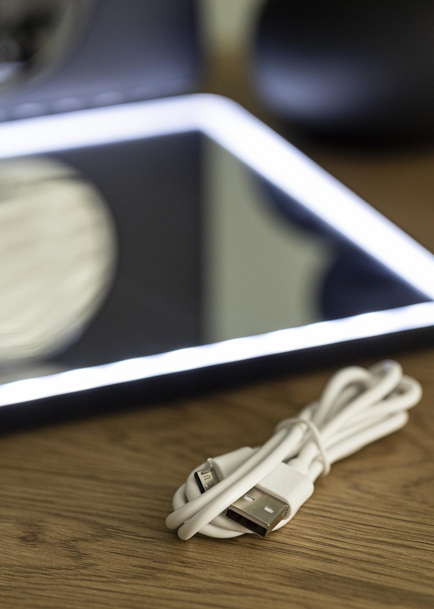Това огледало за грим има стилен черен цвят и вградена LED осветление. Осветлението се регулира с помощта на сензорни бутони при рамката на огледалото, с които също така включвате и изключвате огледалото. Когато затворите огледалото в включено положение, то автоматично преминава в режим на енергоспестяване и след това отново започва да свети, когато го отворите отново. Огледалото се захранва с батерия и се зарежда чрез USB връзка.