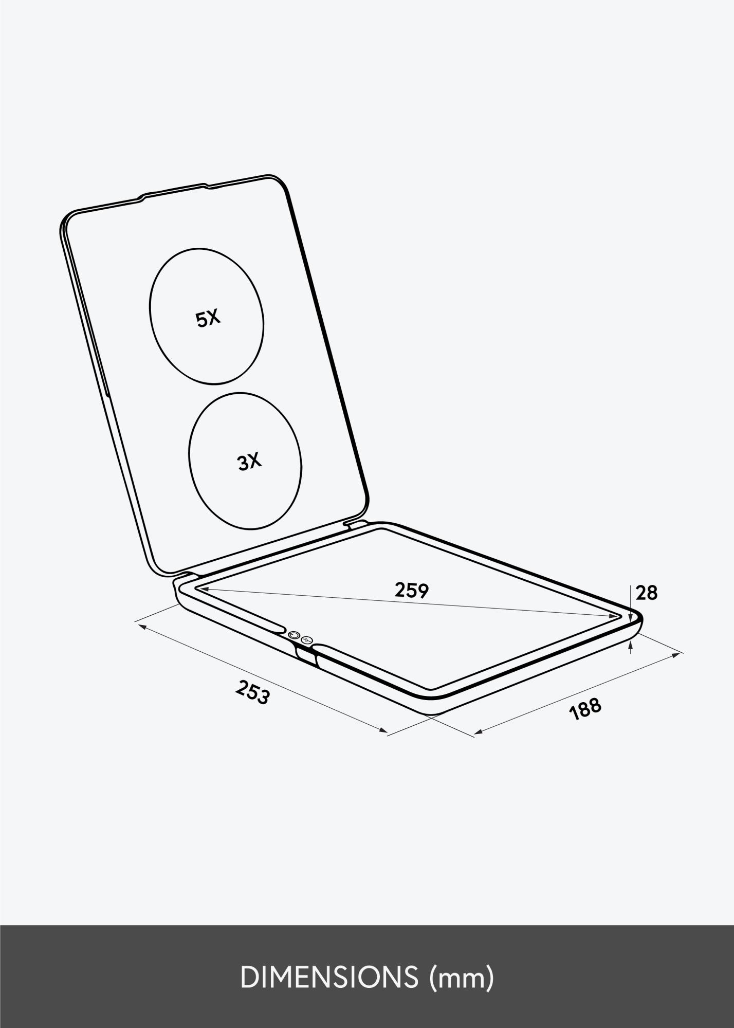 Искате ли огледало за грим в размер за пътуване, което перфектно се побира в чантата ви? Тогава това компактно огледало за грим е добър избор! Огледалото има 18,5x25 см голяма огледална повърхност и сгъваема конструкция, която защитава огледалото от мръсотия и прах. Сгъващият се дизайн също така позволява да наклоните огледалото при използване. Освен обичайното огледално стъкло, огледалото има зона с 5x увеличение и зона с 3x увеличение.