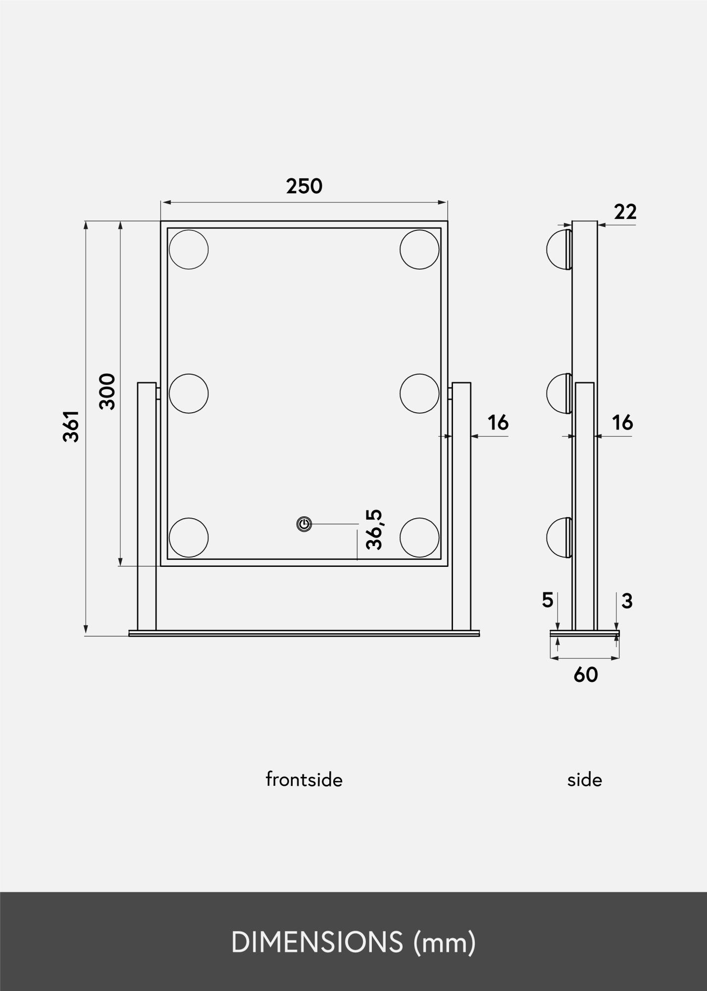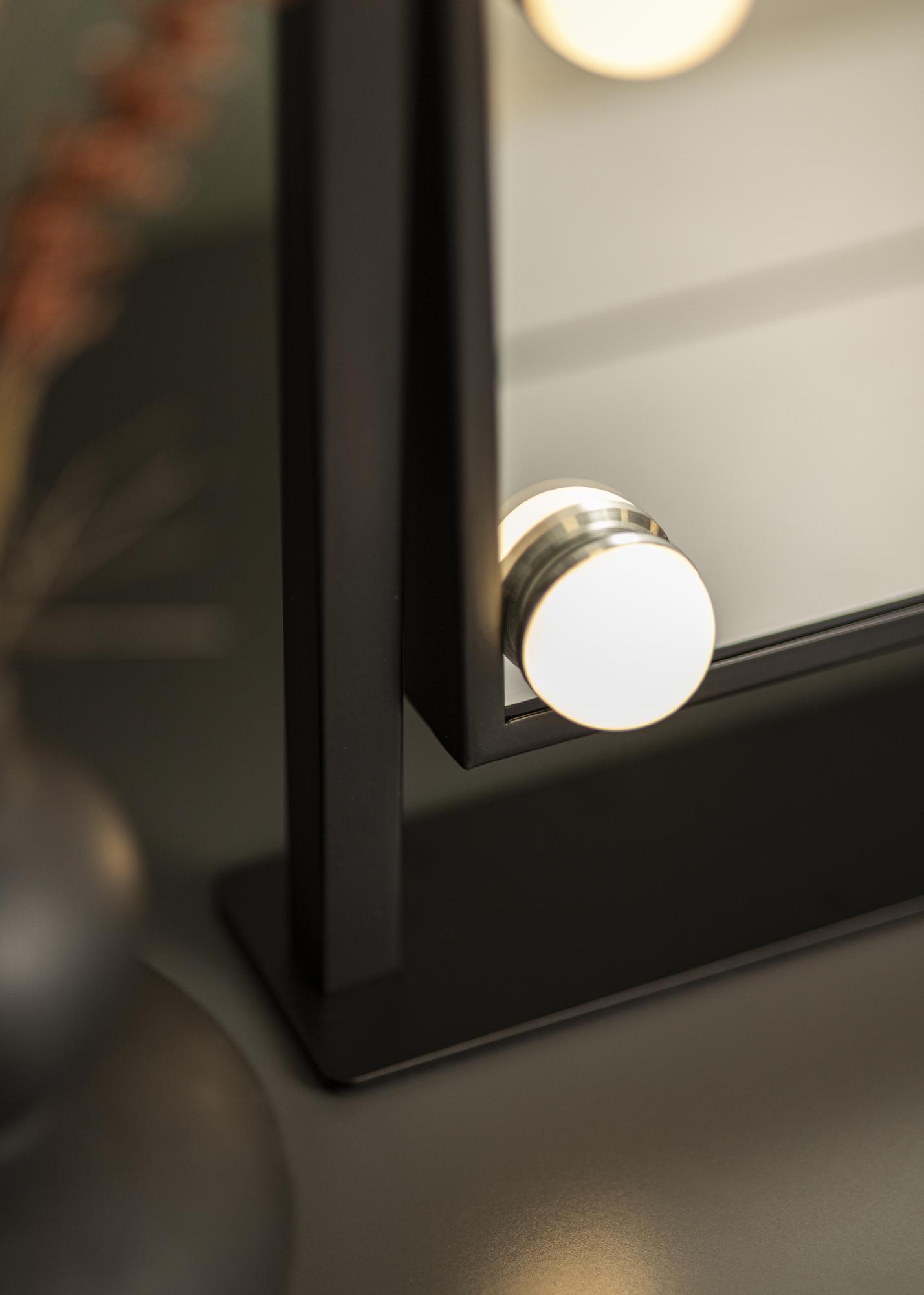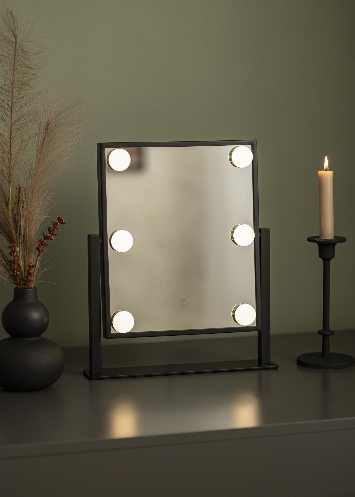 Това е наистина луксозно огледало за грим с шест декоративни и димърни LED крушки в модерен черен нюанс. Осветлението излъчва топла бяла светлина в 3000K и се включва чрез натискане на сензорния бутон. Регулирайте силата на лампите, като задържите бутона за няколко секунди. LED е източник на светлина, който консумира по-малко енергия, има по-дълъг живот и предоставя по-естествена и равномерна светлина. Огледалото за грим може да се накланя, за да можете да нанасяте грима си с повече прецизност. Освен многото си функции, това огледало за грим носи истинско холивудско усещане и е елегантен детайл в дома!