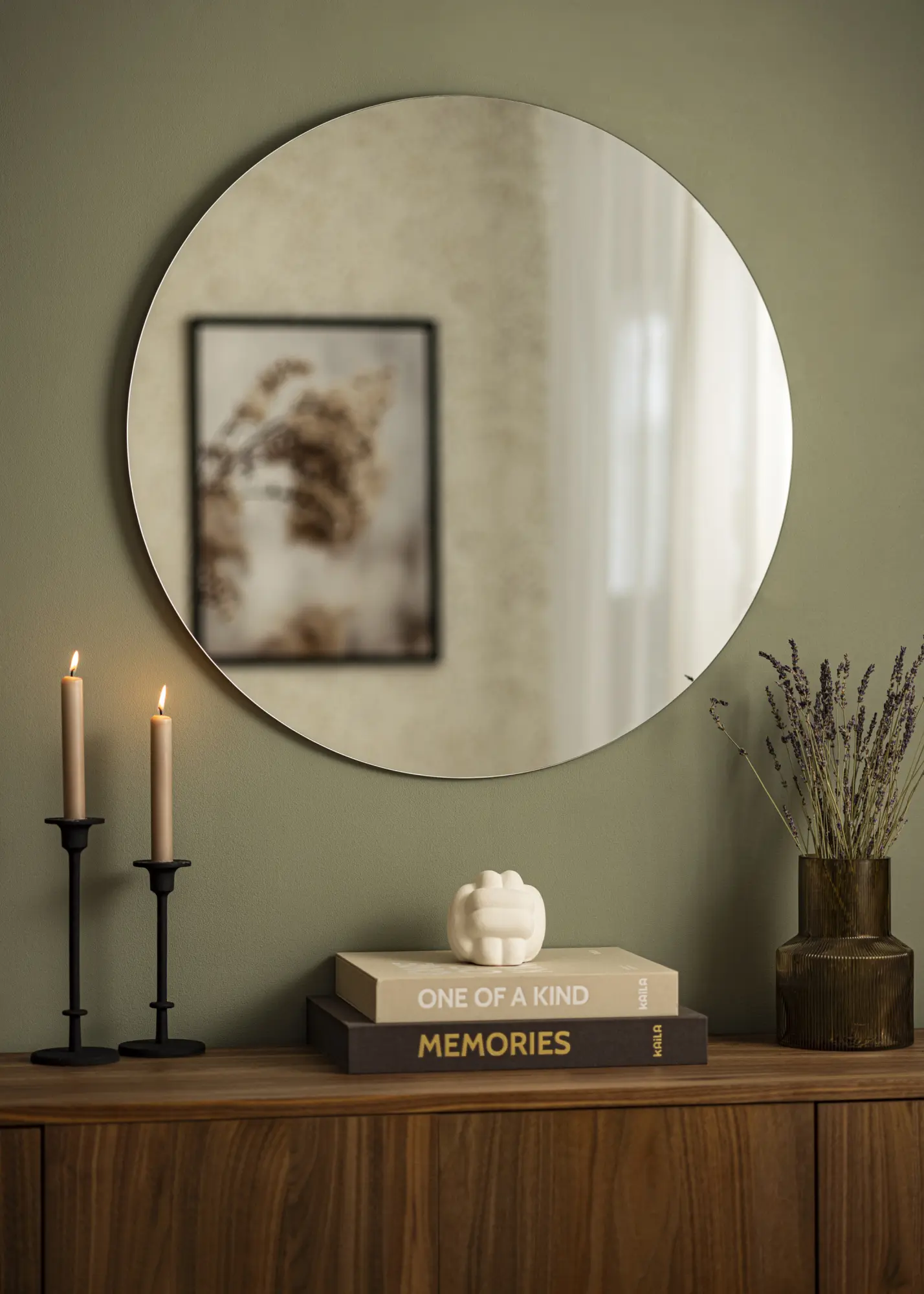 75 см Ø кръгло огледало, което е част от серията кръгли огледала от KAILA. Предлага се в цели 13 размера, така че да намерите размера, който пасва перфектно на вашата стая. Огледалото е изключително тънко и стилно и пасва на всички видове стаи и интериорни стилове.