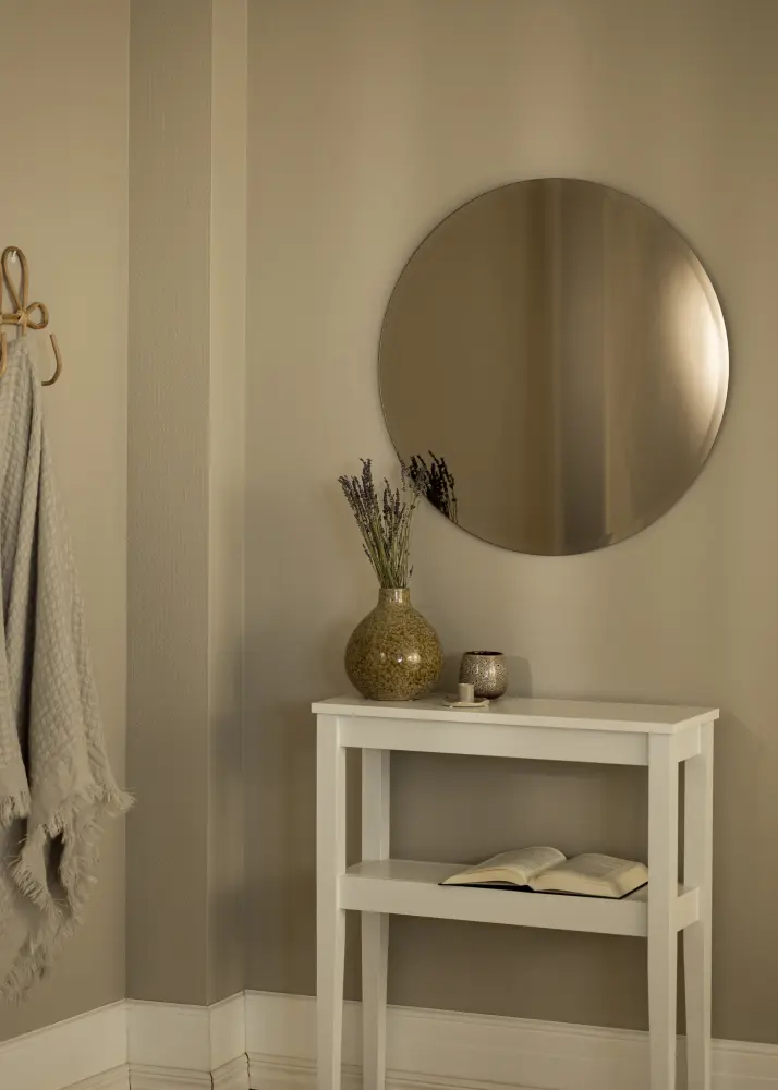 Огледало в по-тъмен бронзов нюанс ще бъде изискан акцент в дома ви. Това стенско огледало има меко закръглена форма и елегантно бронзирано огледално стъкло. Ексклузивната цялостност се допълва от полираната фасетна рамка. Огледалото работи също толкова добре самò по себе си, както и съчетано с други огледала в смесени размери и цветни нюанси.