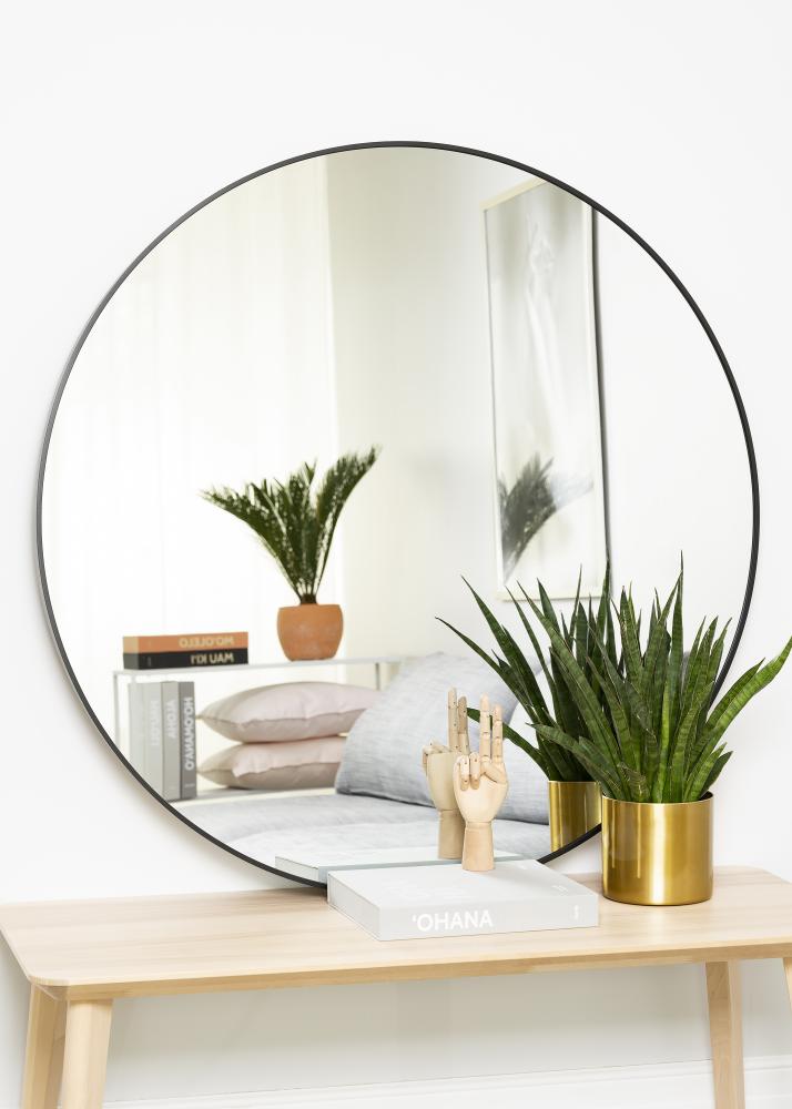 KAILA Кръгло Огледало Edge Черно е кръгло огледало със стилна тънка метална рамка, оцветена в матово черно, което придава индустриален и модерен вид. Рамката има – в зависимост от размера – дълбочина между 30-40 мм, което прави така, че огледалното стъкло излиза малко над стената и създава впечатляващ 3D ефект. Дълбочината на рамката също така прави огледалото да изглежда стабилно, като същевременно запазва минималистичния си вид. Перфектно кръгло огледало, което можете да поставите във всяка стая, в която искате да добавите функционалност и стилен шведски дизайн!