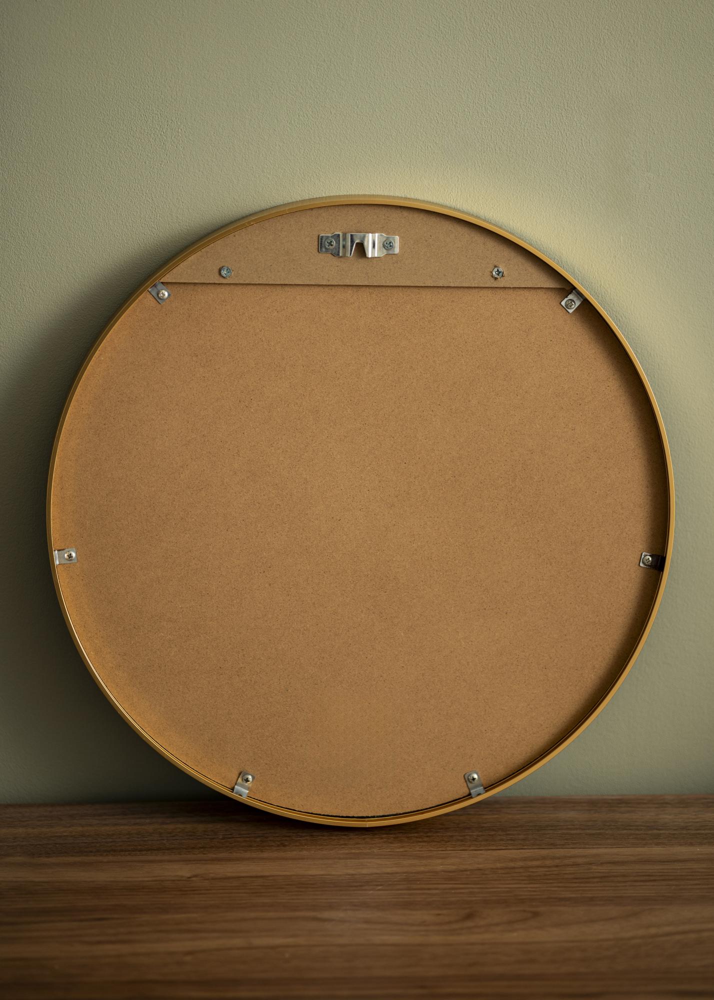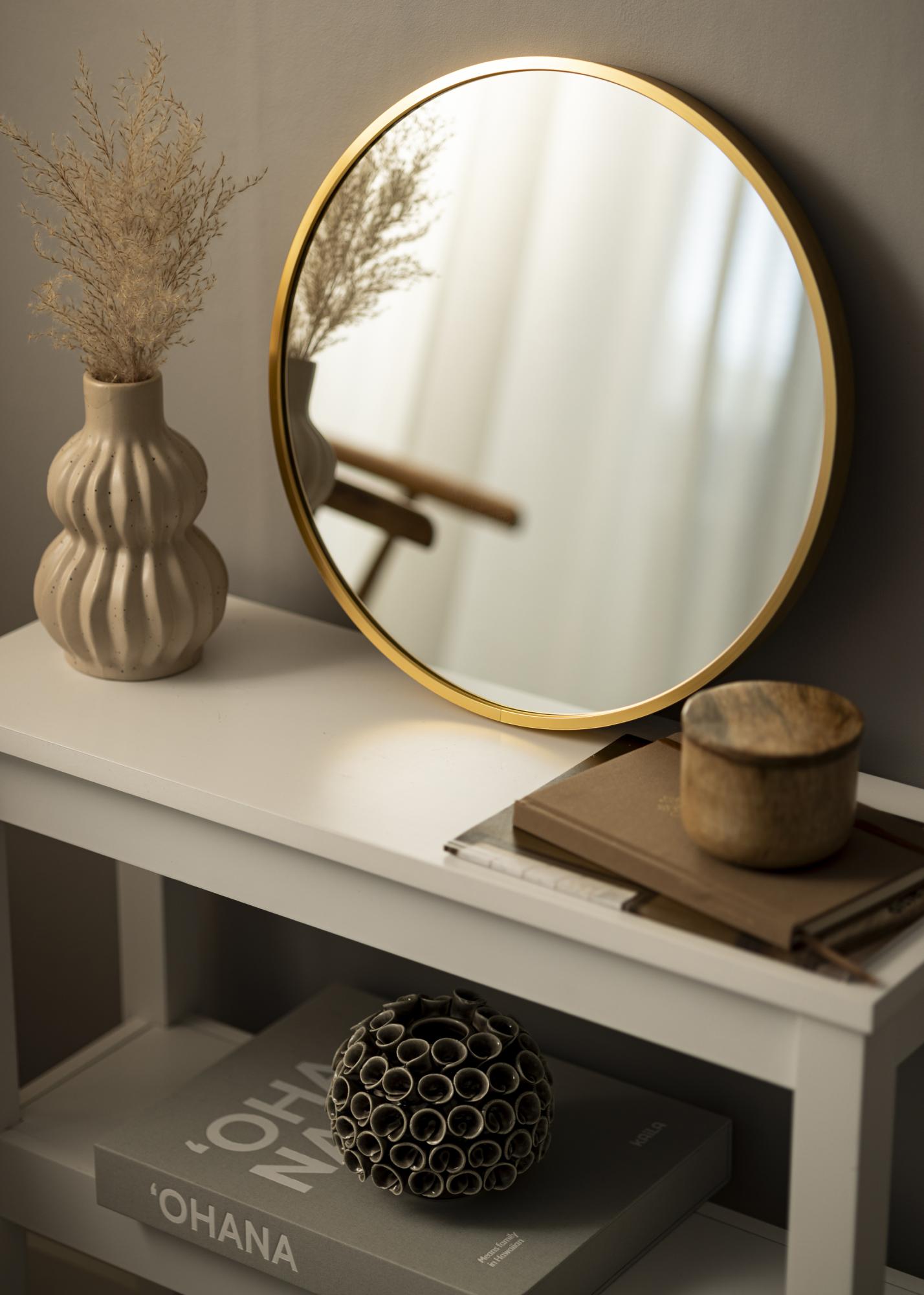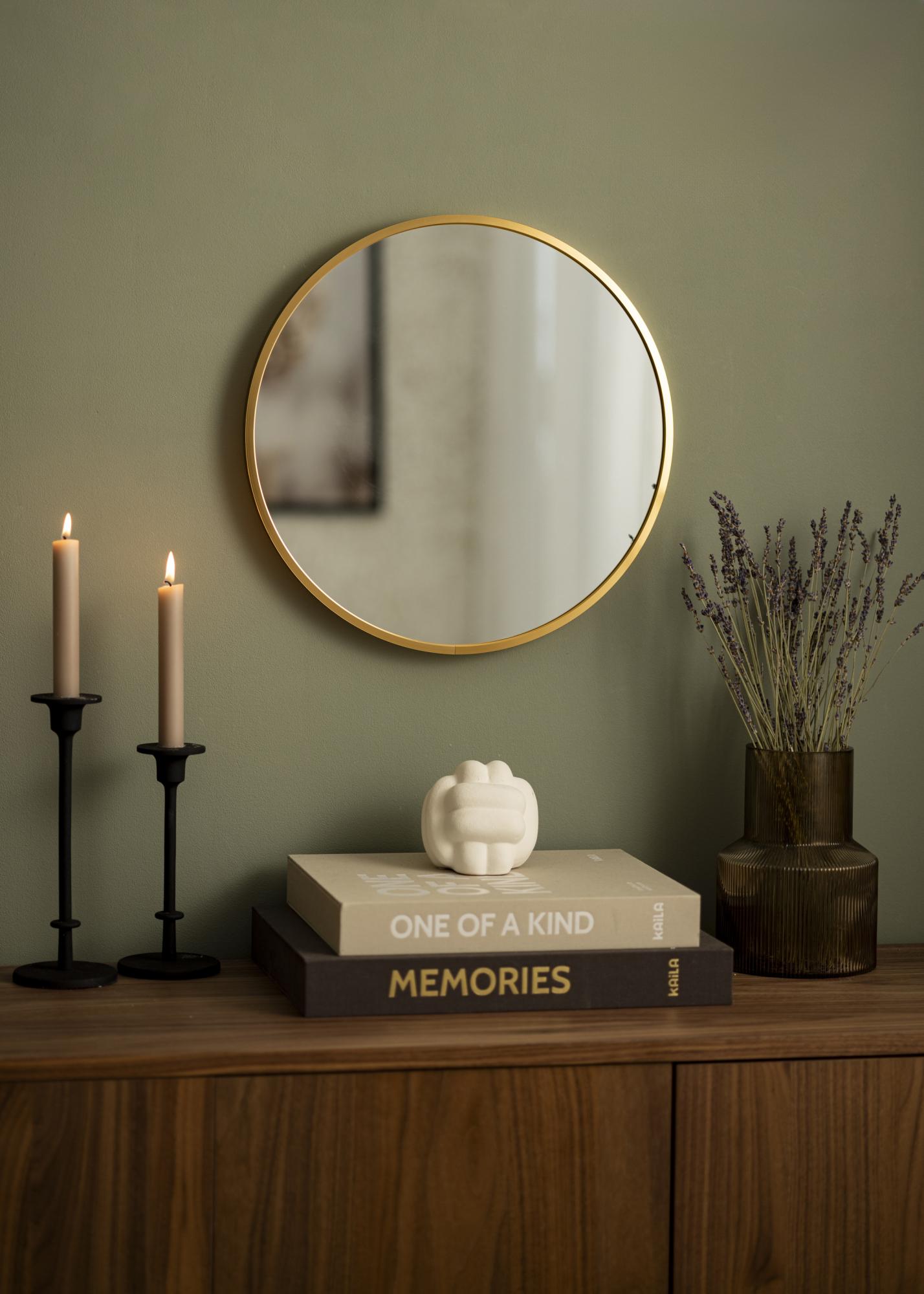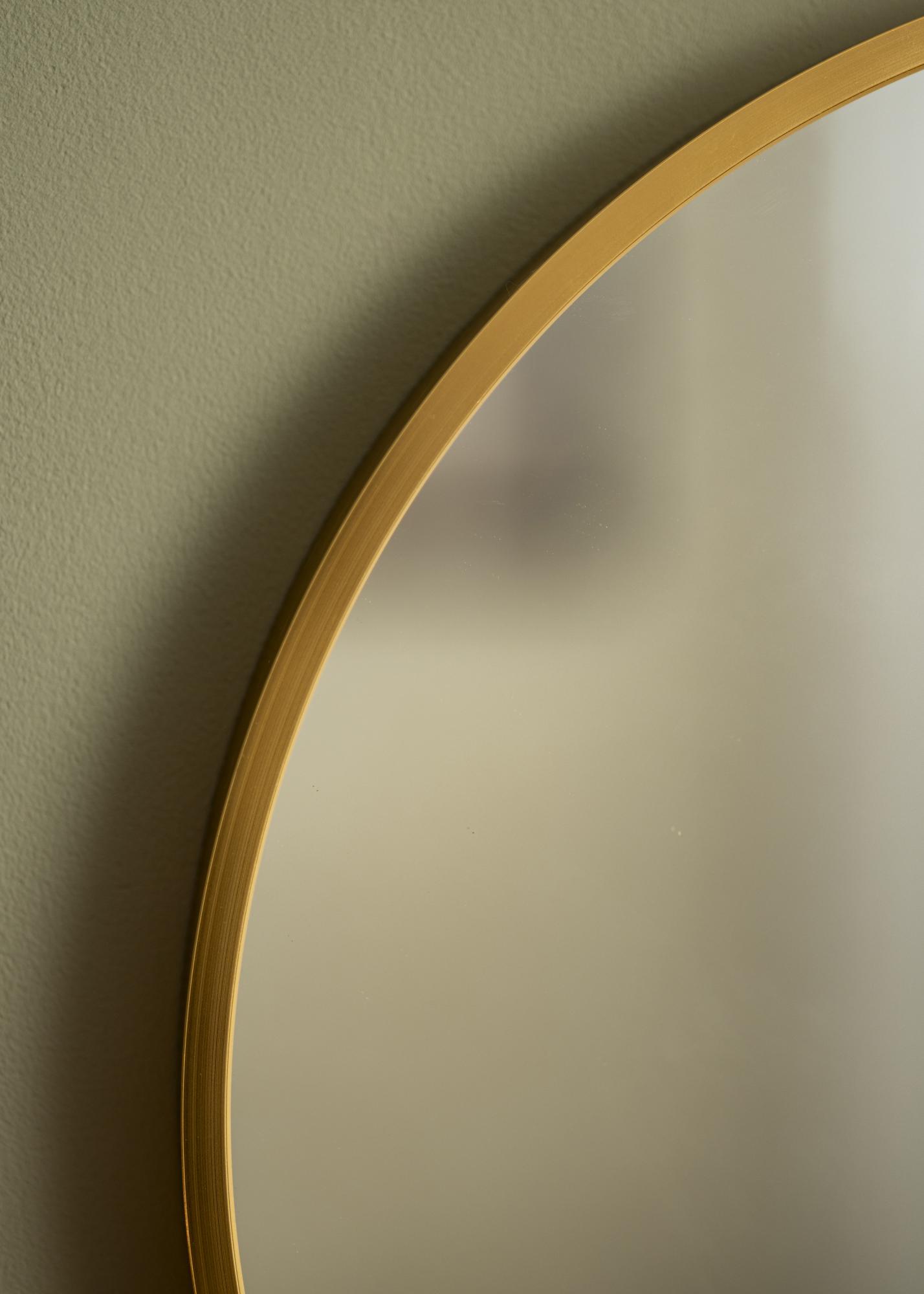 Кръгло огледало в изчистен шведски дизайн с метална рамка в красива златна завършек. Рамката има четка повърхност, което придава на красивия златен цвят леко матиран вид. Рамката е също така модерно тънка, но същевременно – в зависимост от размера – има дълбочина от между 30-40 мм, което прави така, че тя излиза малко от стената и създава впечатляващ 3D-ефект. Дълбочината на рамката също така кара огледалото да се усеща солидно и здраво, без да премахва минималистичното усещане на огледалото.