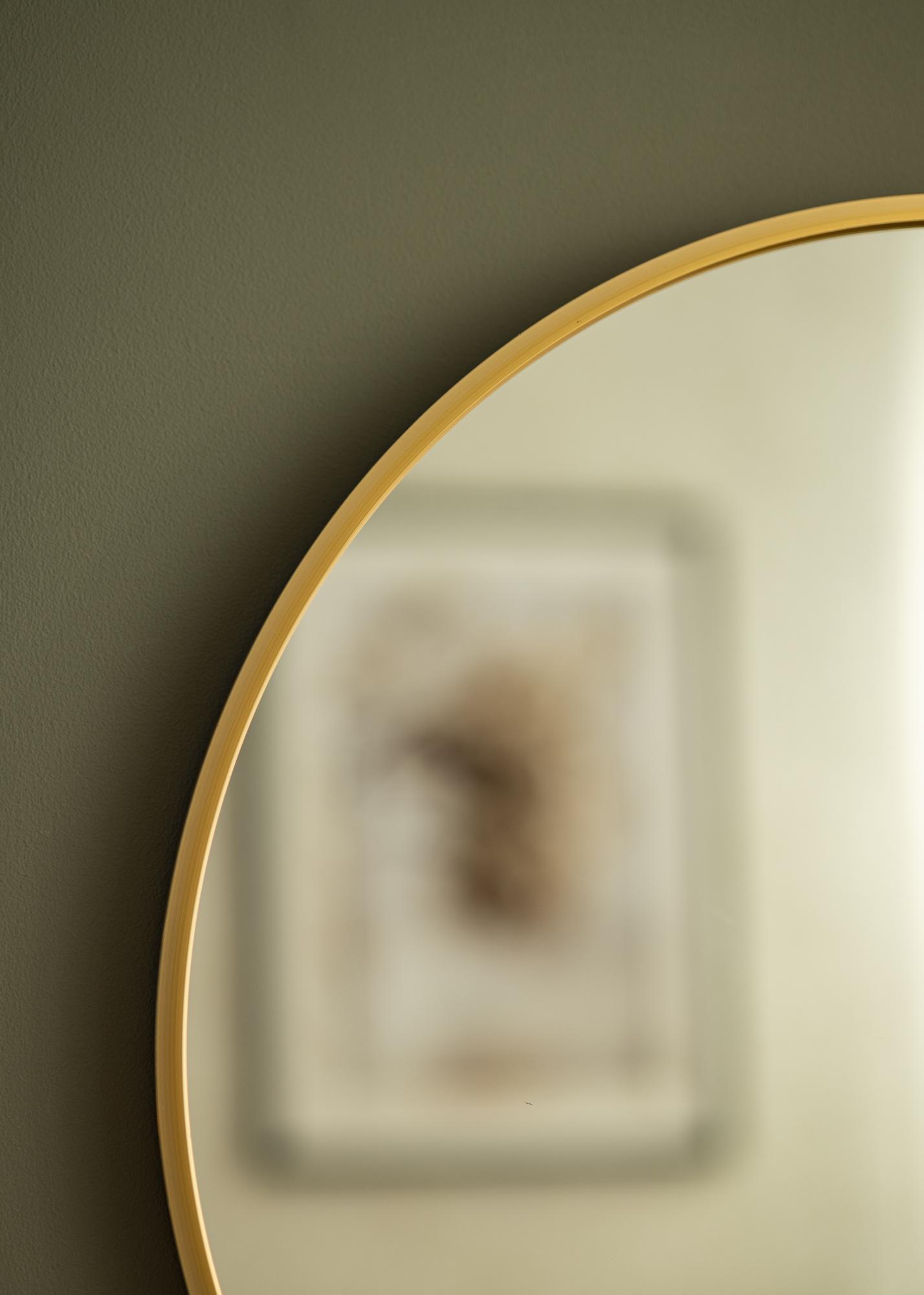 Кръгло огледало в изчистен шведски дизайн с метална рамка в красива златиста завършек. Рамката има матова повърхност, което придава на златистия цвят леко по-матов вид. Рамката е също така стилно тънка, но в същото време – в зависимост от размера – има дълбочина между 30-40 мм, което прави така, че огледалото да излиза малко от стената и създава интересен 3D ефект. Дълбочината на рамката също така придава на огледалото усещане за стабилност и здравина, без да отнема от неговата минималистична излъчване.