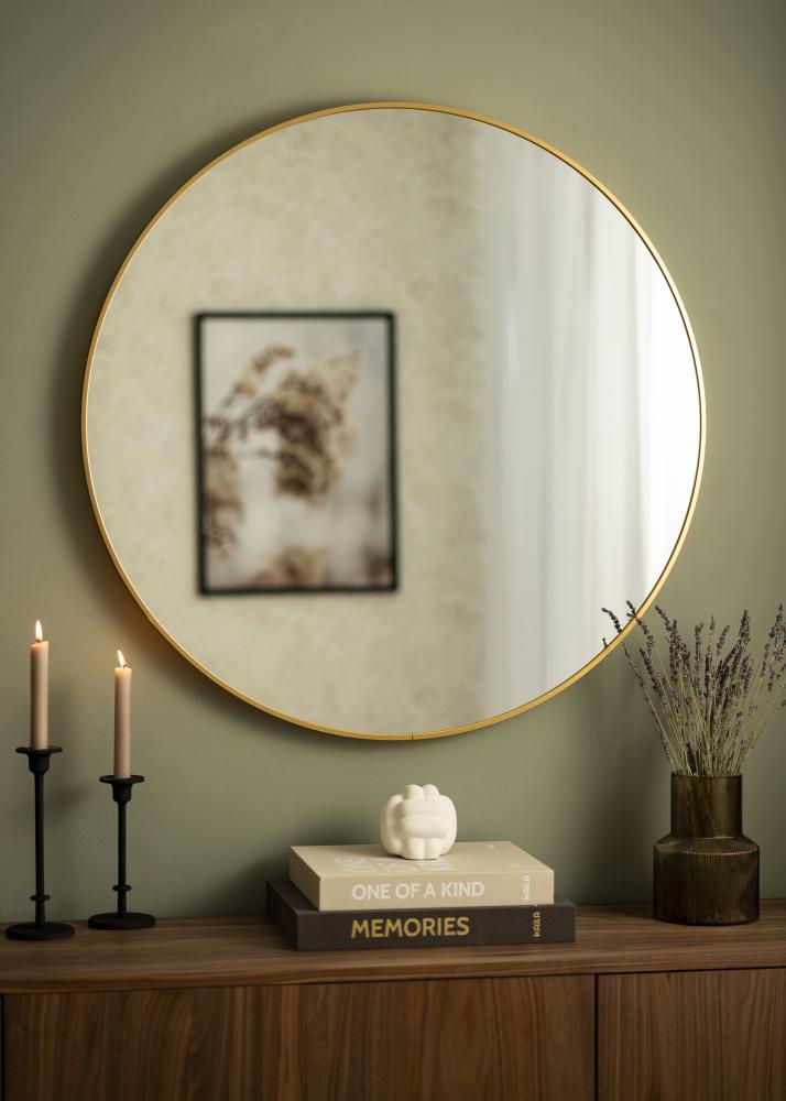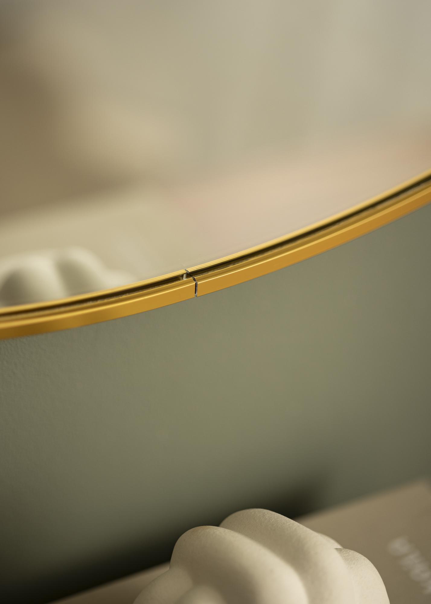 Кръгло огледало в изчистен шведски дизайн с метална рамка с красива златна повърхност. Рамката има матова текстура, което придава на красивия златен цвят леко матиран вид. Рамката е също така модерно тънка, но едновременно с това – в зависимост от размера – има дълбочина между 30-40 мм, което прави така, че да изпъква малко от стената и създава впечатляващ 3D ефект. Дълбочината на рамката също така прави огледалото да се чувства стабилно и здраво, без да отнема от минималистичния му усет.