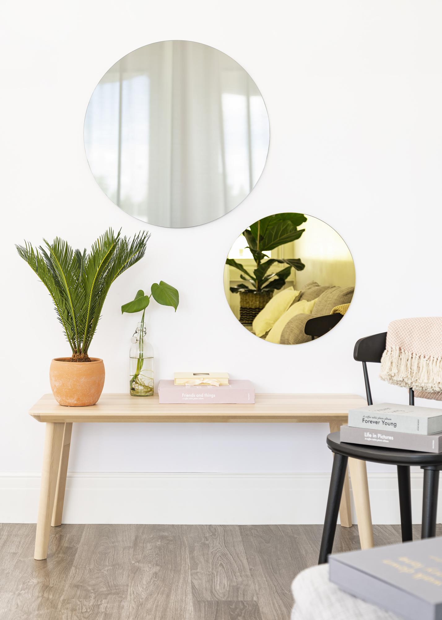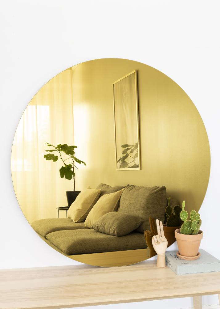 KAILA Кръгло Огледало Gold е елегантен дизайн в най-добрия си вид! Кръглото огледало е тънко и няма рамка, а тази стилна форма в комбинация със златистото огледално стъкло придава на това огледало изключителен вид. Кръгло огледало като това създава мека и привлекателна атмосфера във вашия дом, докато модерният елемент със златистото стъкло свидетелства за усет към стил и детайли.