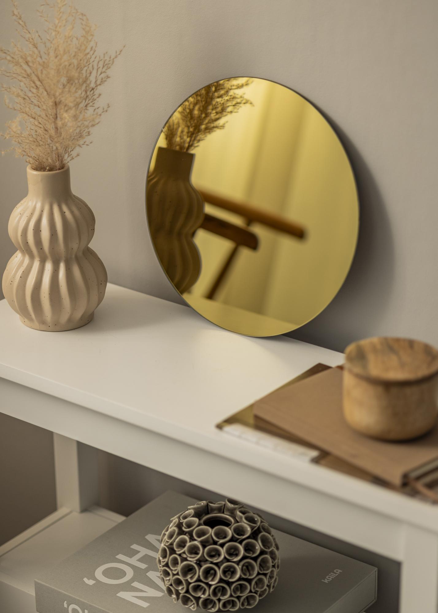 Това кръгло огледало е елегантно и стилно – докато същевременно създава усещане за лукс и изключителност. Това се дължи на щастливата комбинация от ефектни детайли и изчистена форма. Огледалото е тънко и без рамка, което допринася за стилния вид. Златният оттенък на огледалното стъкло допълнително подчертава цялостния облик и придава усещане за изключителност.