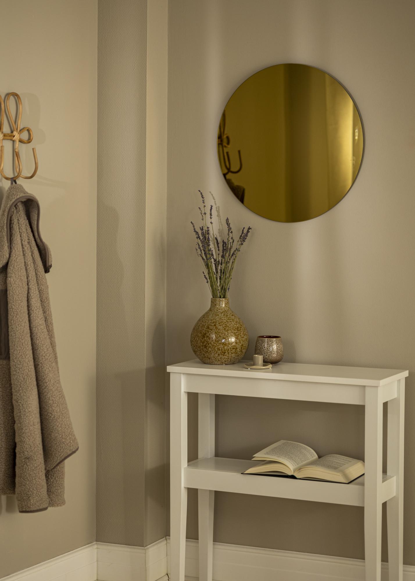KAILA Кръгло огледало Gold е перфектен пример за това колко добре може да бъде, когато изчистената форма среща ефектните детайли. Това кръгло огледало е тънко и няма рамка, което му придава модерен и изчистен вид. Това се комбинира с красивото огледално стъкло в златен тон, което подчертава цялостната визия и прави огледалото елегантно и привличащо вниманието.