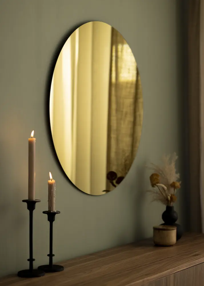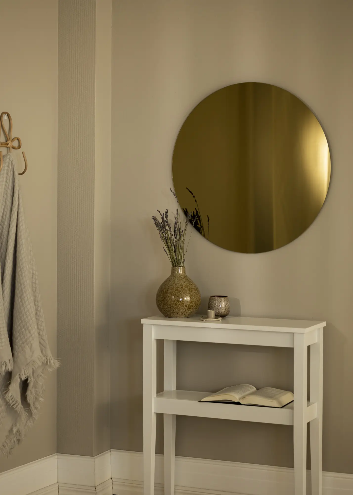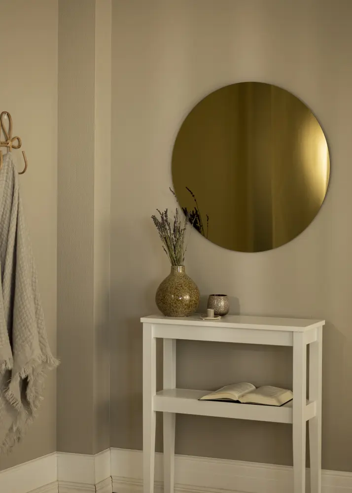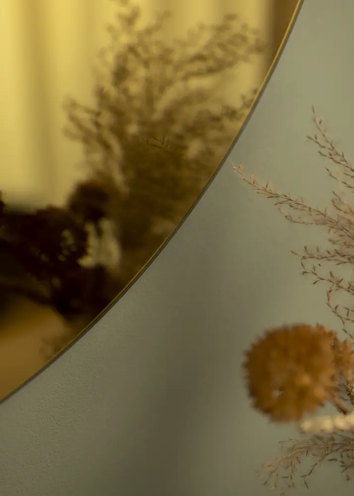 Това кръгло огледало има стилен дизайн с ефектен детайл; елегантно златисто огледално стъкло. Този детайл придава на огледалото луксозен вид, като в същото време в комбинация с изчистената форма – тънка и без рамка – създава модерно и изискано цяло.