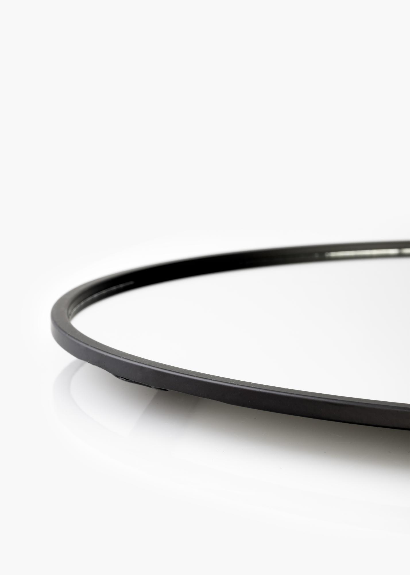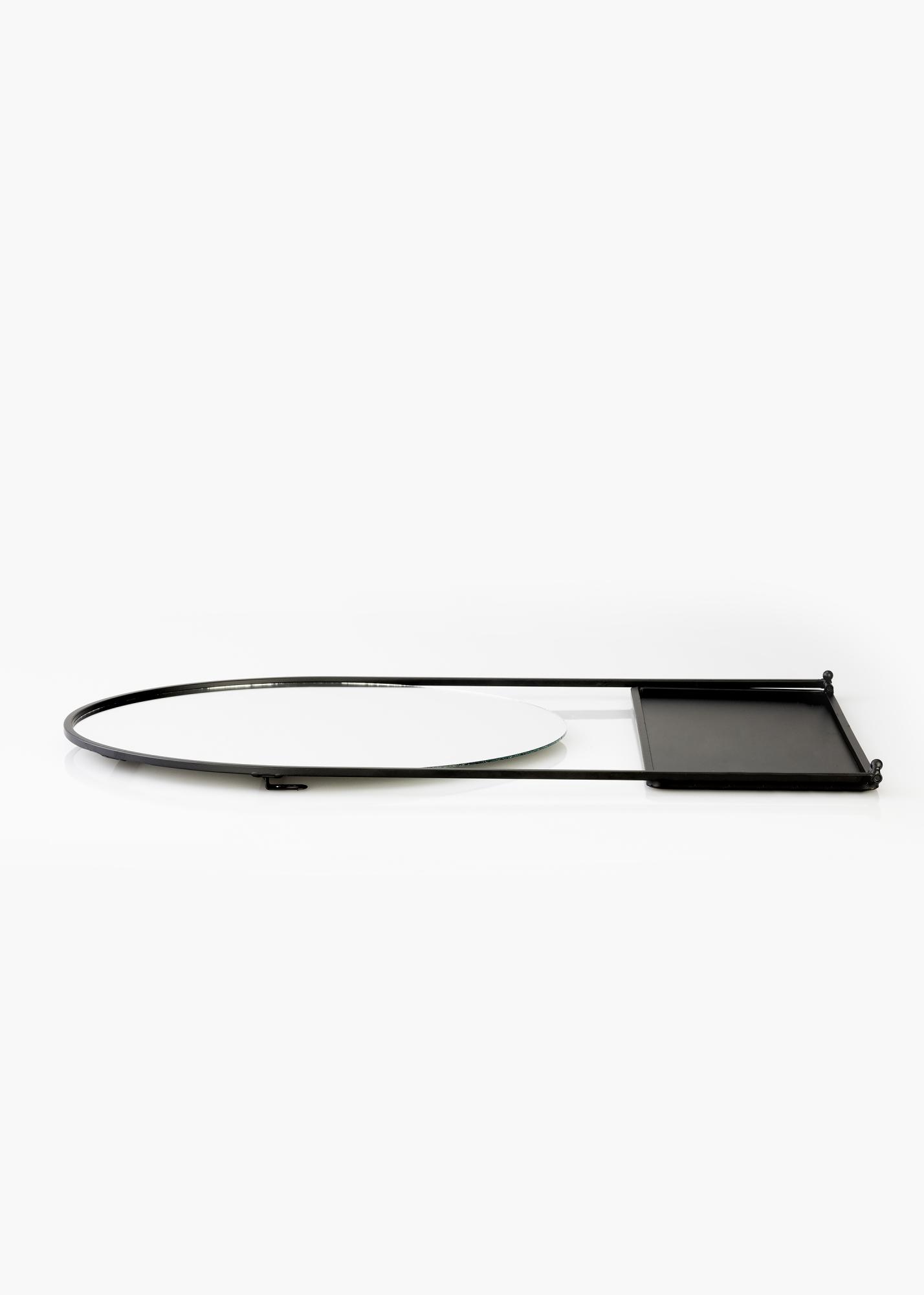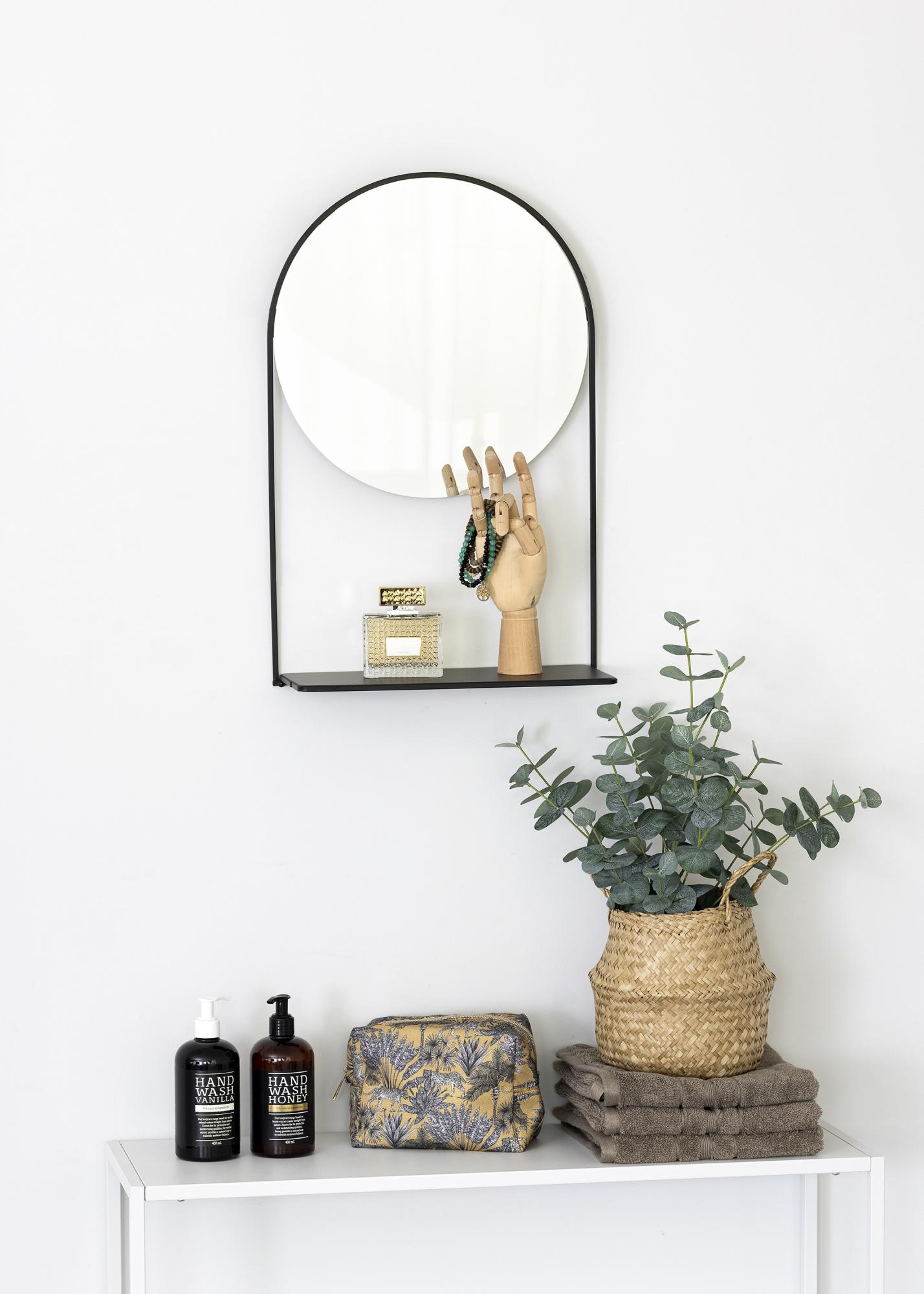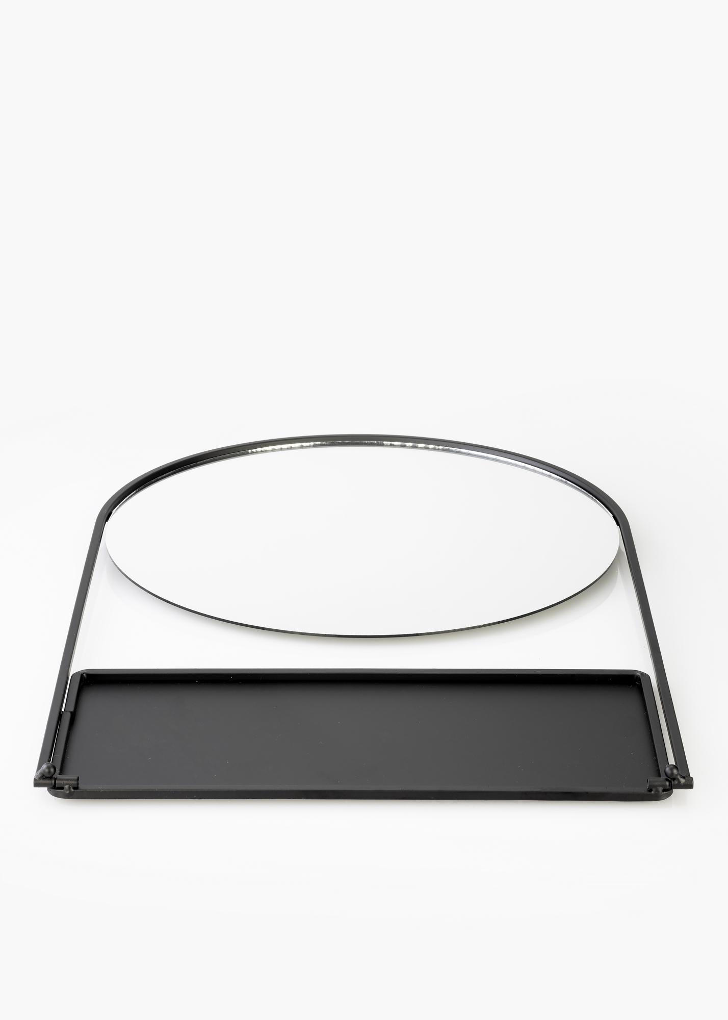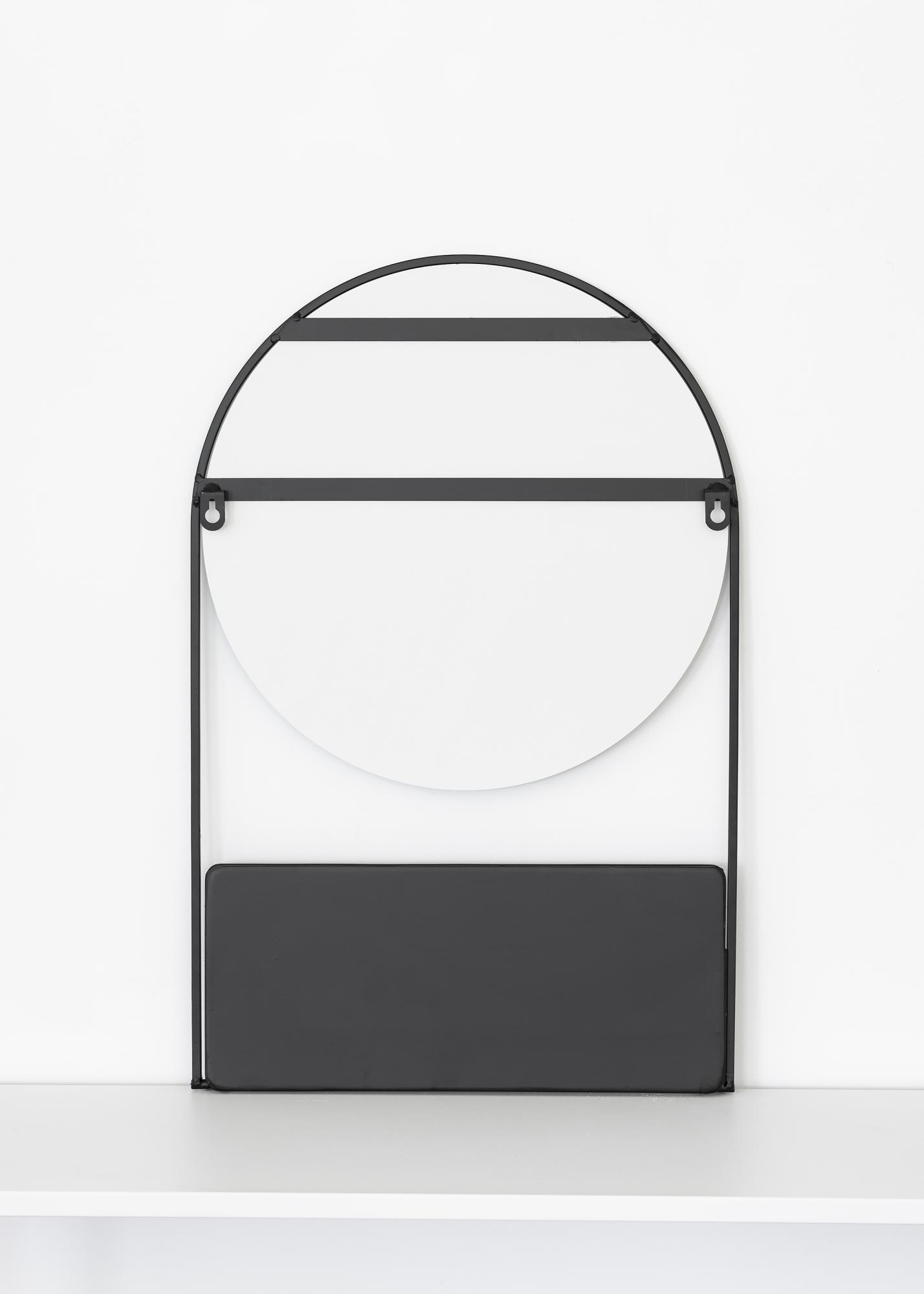 Това стилно стеннo огледало с рафт е шведски дизайн от KAILA. Огледалото е в черен нюанс и е изработено от метал. Самата огледална повърхност е кръгла и е с диаметър 35 см. Около огледалната повърхност има черен метален ръб и най-долу рафт - идеален за поставяне на красива декорация или малко съхранение на гримове! Огледалото е с размери 35x55 см и има стенен монтаж.