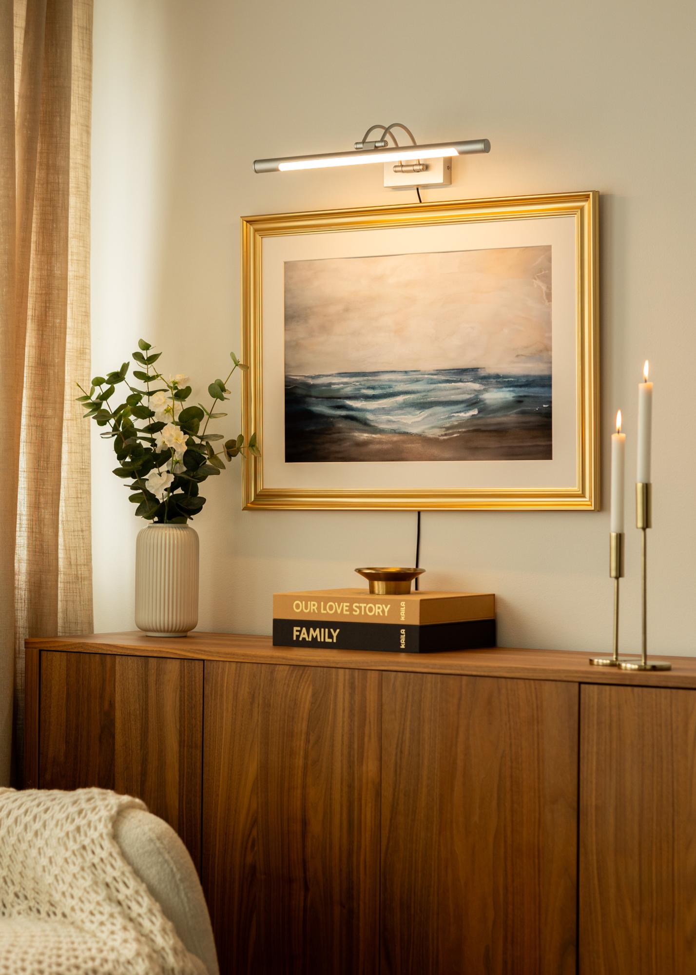 Осветлението е оборудвано с димер, който ви позволява да регулирате яркостта според различни нужди и настроения. Това прави лесно изтъкването на вашето изкуство по най-добрия възможен начин, независимо дали предпочитате меко сияние за вечерно време или по-светла презентация през деня. С яркост от 520 лумена, осветлението осигурява балансирано светене върху цялата повърхност, без да бъде натрапчиво.