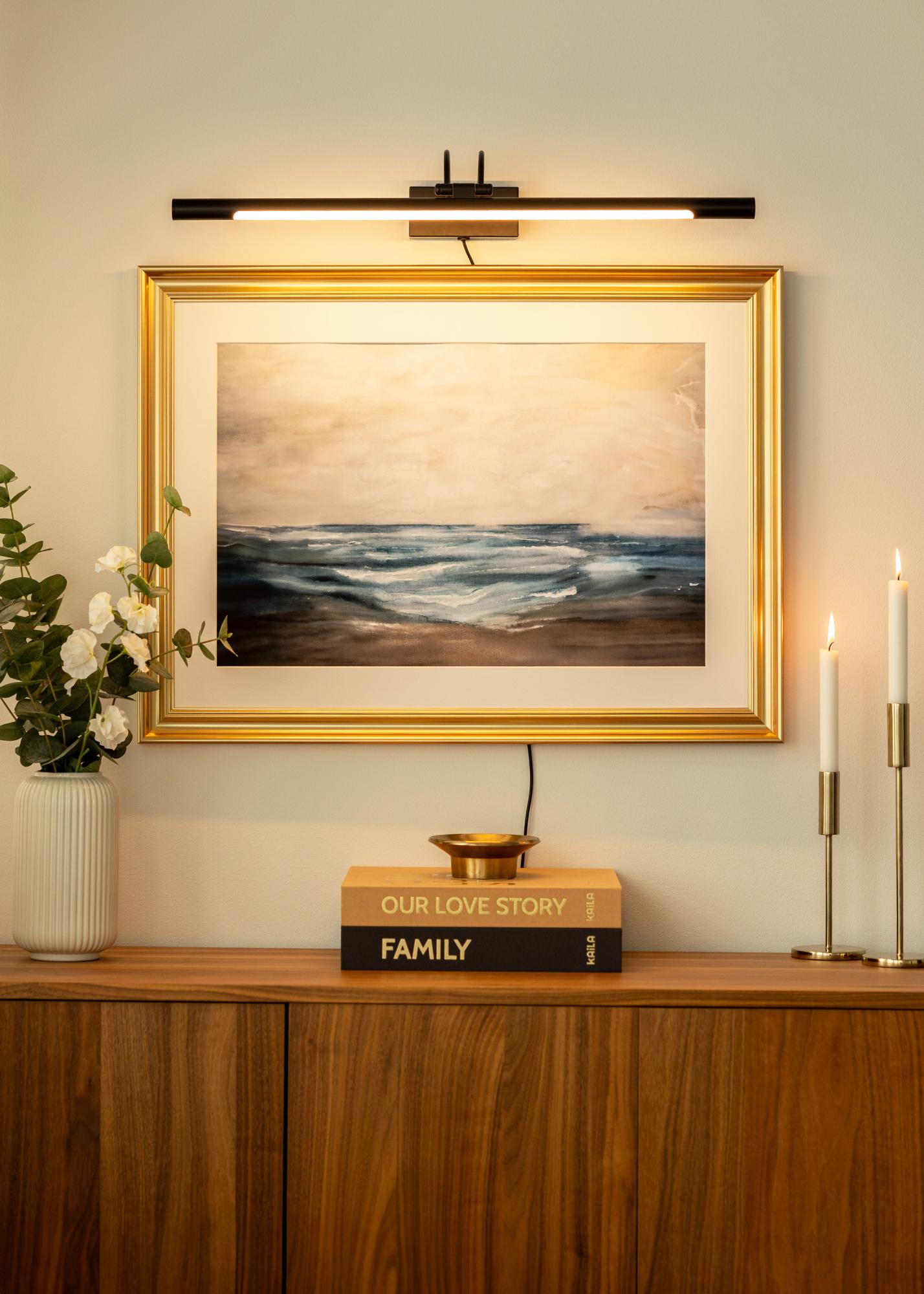 Функцията за димиране е ценна характеристика, тъй като позволява да регулирате яркостта според вашите предпочитания и нужди. Това осигурява възможността за създаване на подходящо осветление, независимо дали искате по-заглушена обстановка или по-ясно осветление на вашето произведение. Със своя матово черен завършек, това осветление за картини пасва както в модерни, така и в по-класически интериори, където придава стилно и дискретно впечатление.