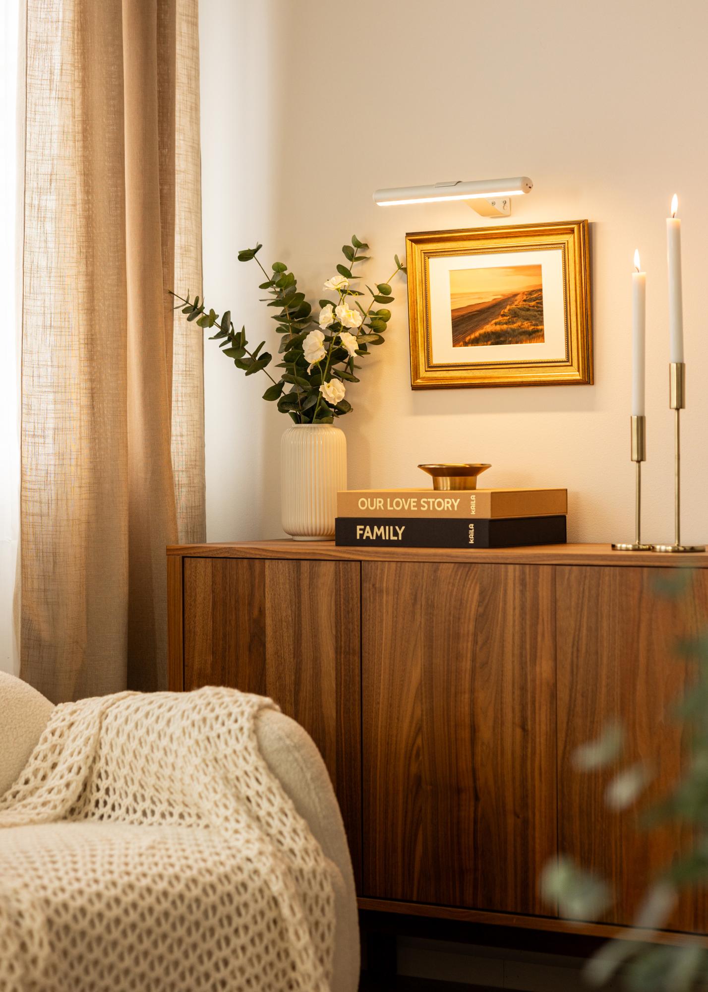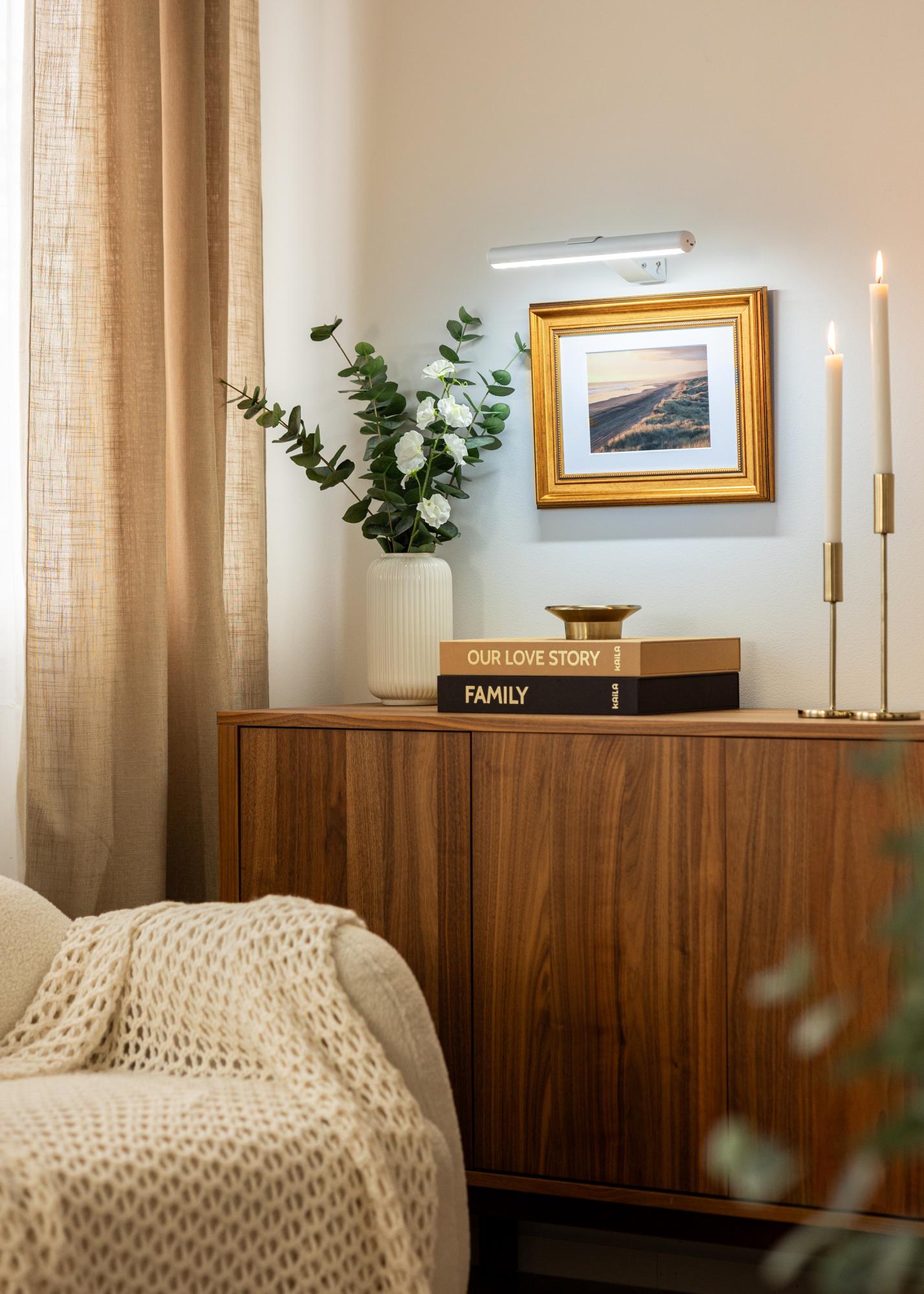 Това захранвано с батерии осветление за картини в бял дизайн предлага удобно решение за осветяване на вашите произведения на изкуството без нужда от прокарване на кабели. Благодарение на това, че се захранва с батерии, може да бъде поставено на избрано място без да мислите за електрически контакти, което го прави много гъвкаво. С дълбочина от 15 см и дължина от 33 см, осветлението е компактно и лесно за инсталиране, като същевременно може да осветява произведения на изкуството с ширина до 60 см.