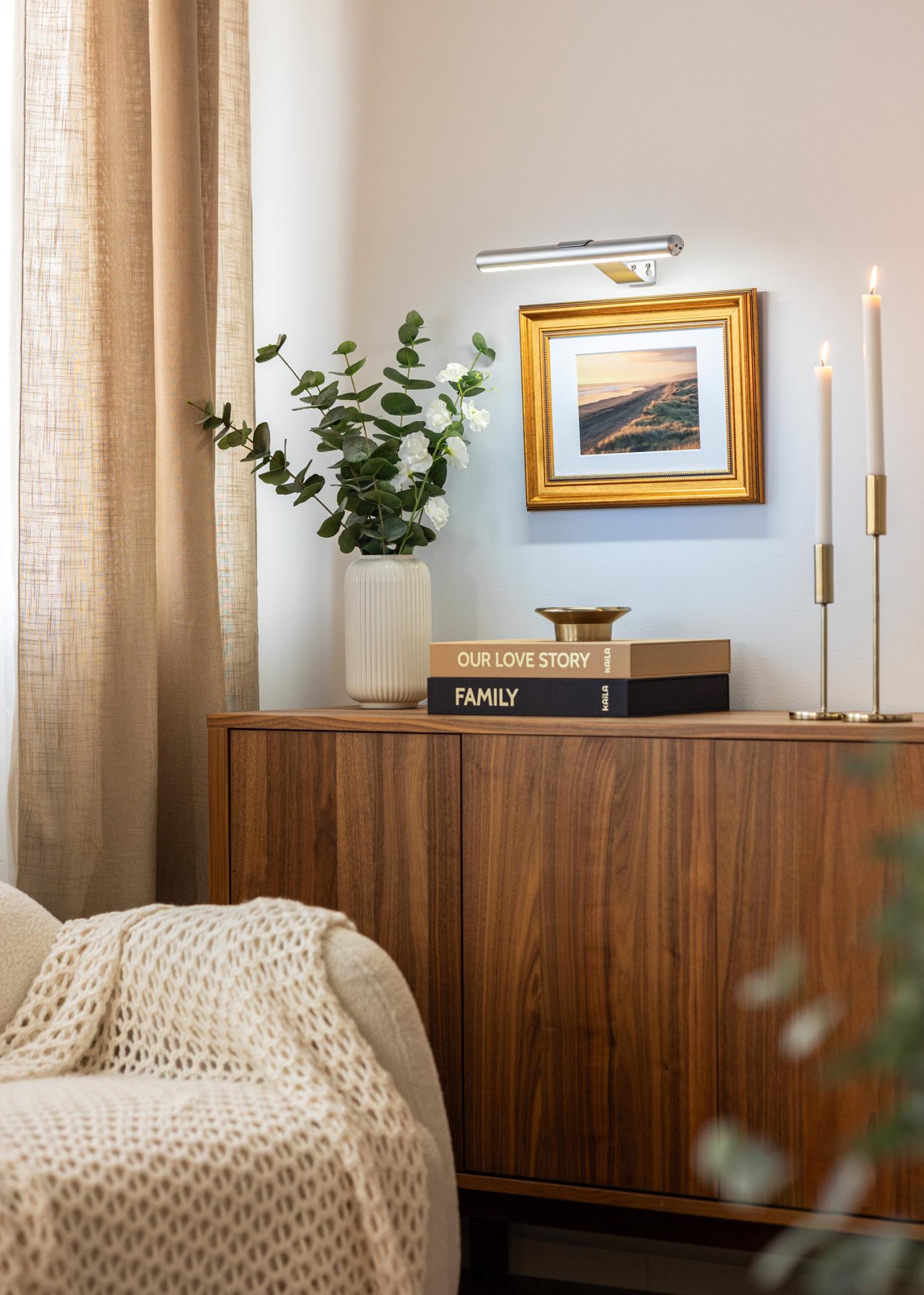 Това батерийно захранвано осветление за картини в сребрист цвят е практично и естетически привлекателно решение за осветяване на вашите произведения на изкуството без неудобствата на кабели. Благодарение на неговия дизайн, захранван от батерии, можете да го поставите където пожелаете, независимо от електрическите контакти. С дълбочина от 15 см и дължина от 33 см той е както дискретен, така и ефективен за подчертание на произведения с максимална ширина до 60 см.