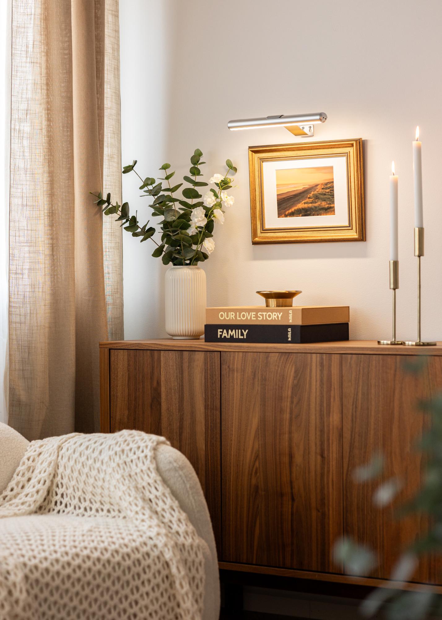 Със своя елегантен сребрист финиш и минималистичен дизайн това осветление за картини пасва в различни видове интериори и подобрява външния вид на вашите произведения на изкуството. Лесно е за инсталиране и монтажните винтове са включени, което прави инсталацията гладка и бърза. Това е отлично решение за тези, които искат гъвкаво и практично осветление за своите произведения на изкуството.