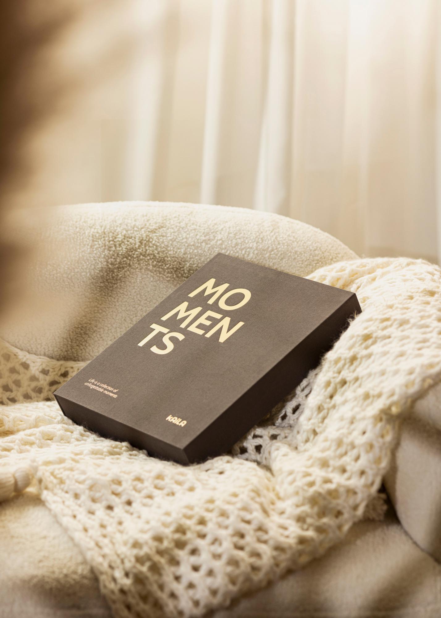 Фотоалбумът е проектиран като кутия, която можете да отворите, за да достигнете до вашите снимки. Корицата е облечена в черен текстил, което придава луксозно усещане. На предната страна и късата страна е текстът "MOMENTS". В левия ъгъл на горната страна се вижда красивото подзаглавие "Life is a collection of unforgettable moments".