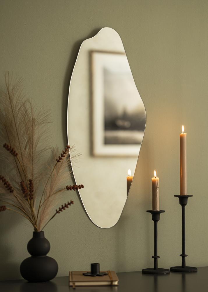 Това е продълговато огледало с красива асиметрична форма, което го прави вълнуващ детайл за интериора, подходящо съвършено за модерния дом. Огледалото има практични стенни крепежи на задната страна и се окачва на стената в стаята, която предпочитате – дори е подходящо за използване в банята!