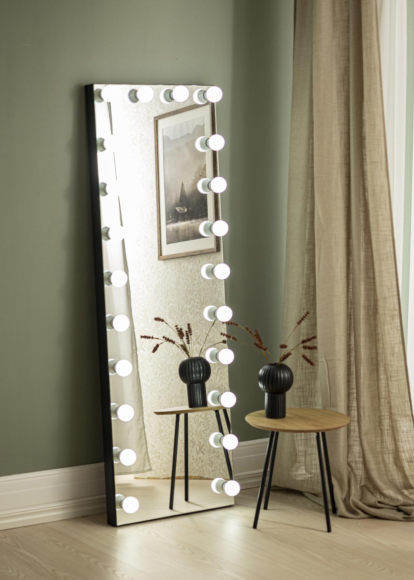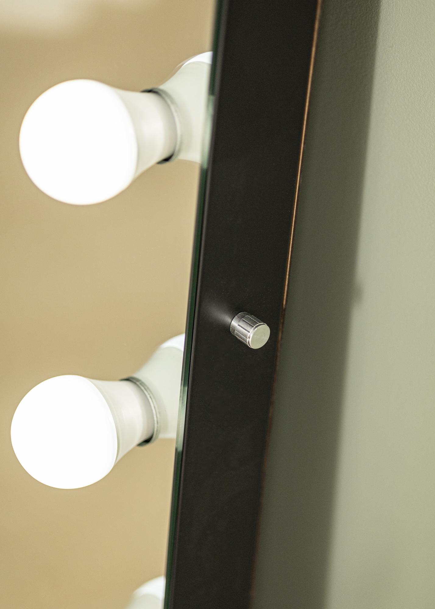 Стенният огледало има 22 големи LED лампи, които красиво обрамчват огледалната повърхност и допринасят за неговия бляскав вид. С помощта на по-малък потенциометър на едната дълга страна на огледалото можете да регулирате яркостта според собствения си вкус и предпочитания. Електрическото свързване се извършва с щепсел.