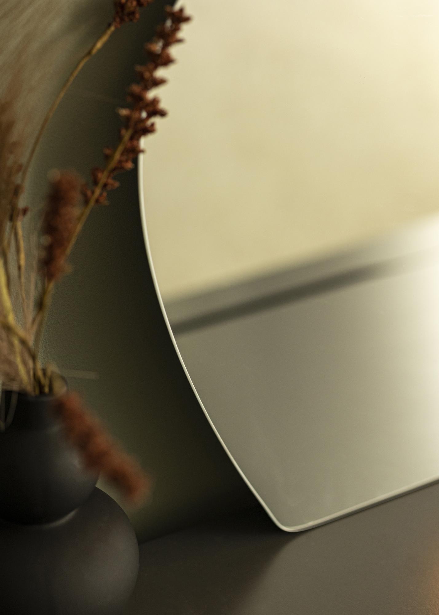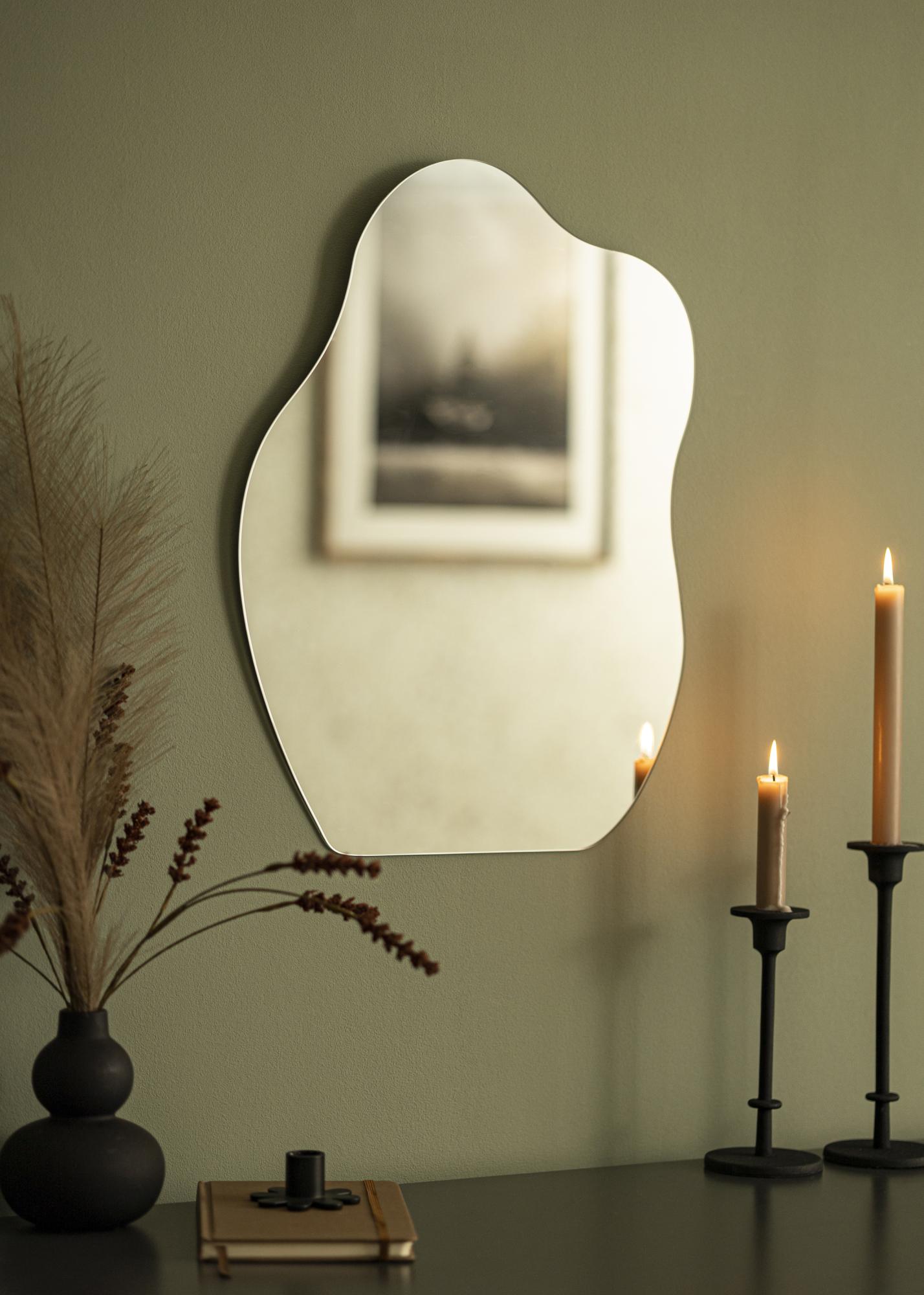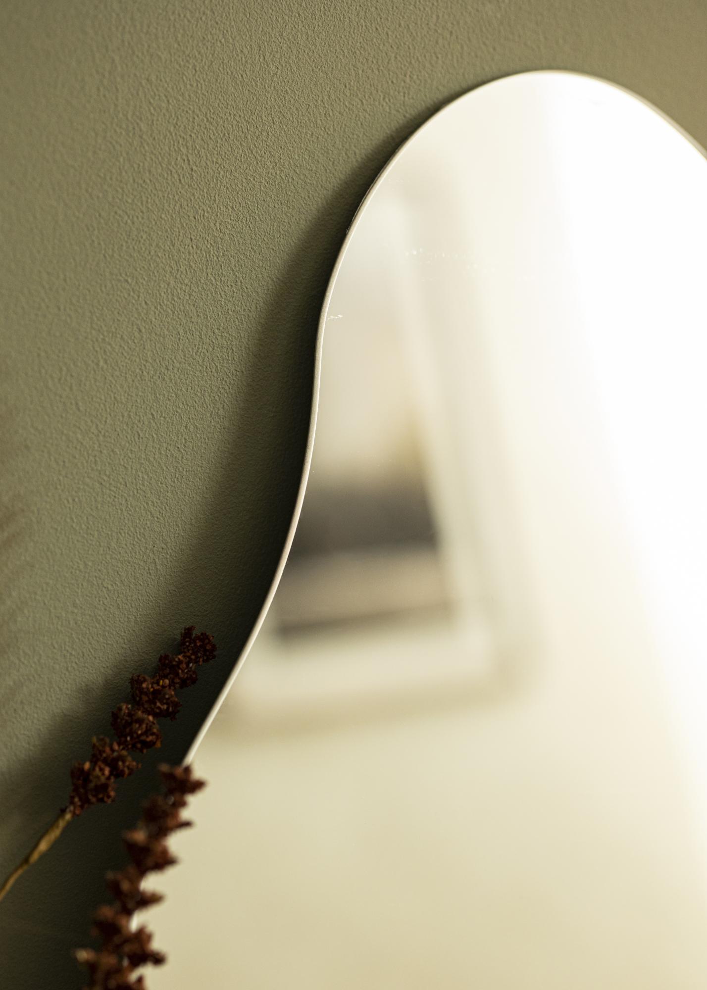Това стенни огледало предлага елегантност и игривост, с вълнообразна форма, която придава на огледалото уникалния му вид. Долният ръб е прав, което прави огледалото подходящо за поставяне изправено върху мебел, наклонено срещу стената. Разбира се, можете също така да монтирате огледалото на стената!