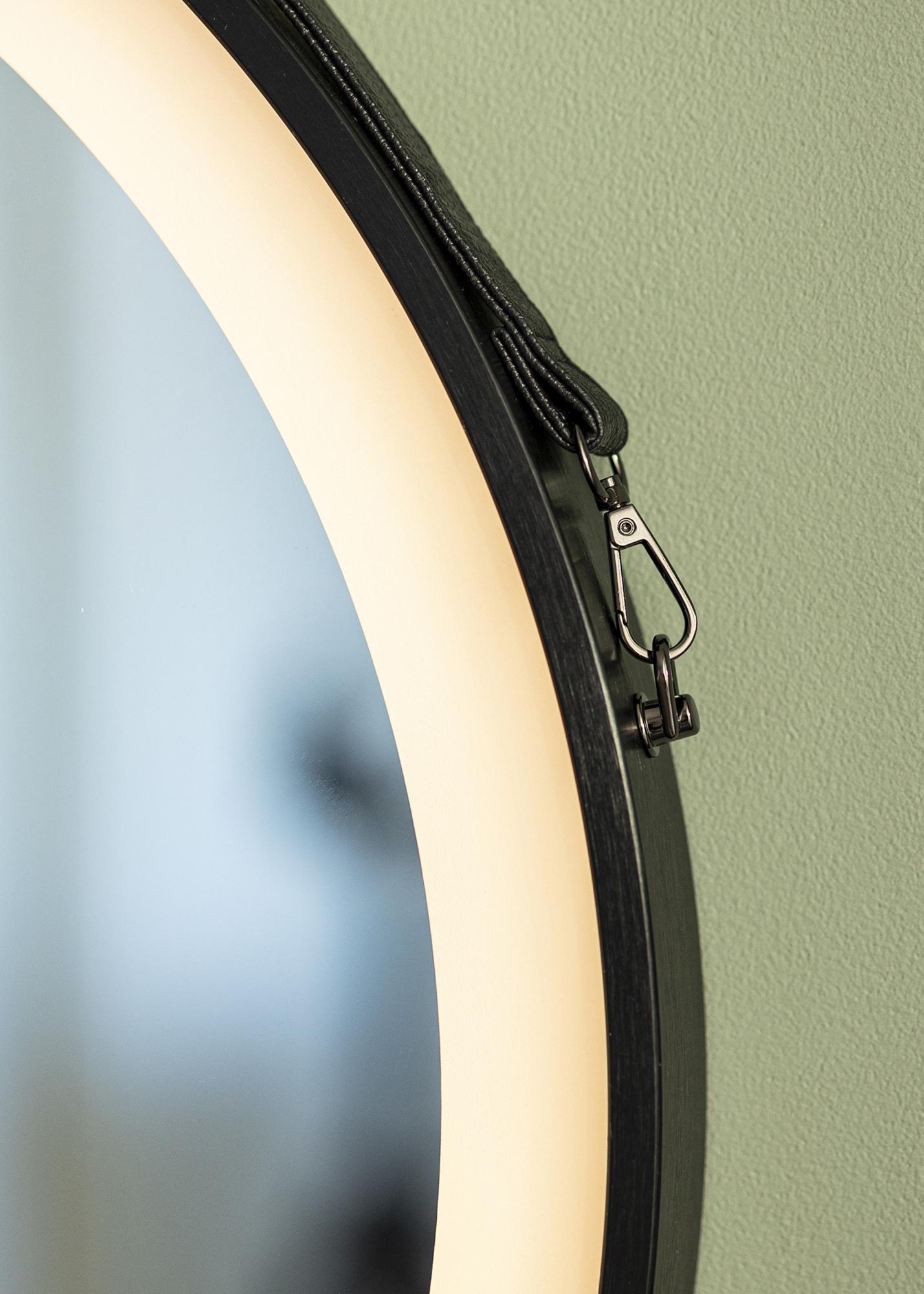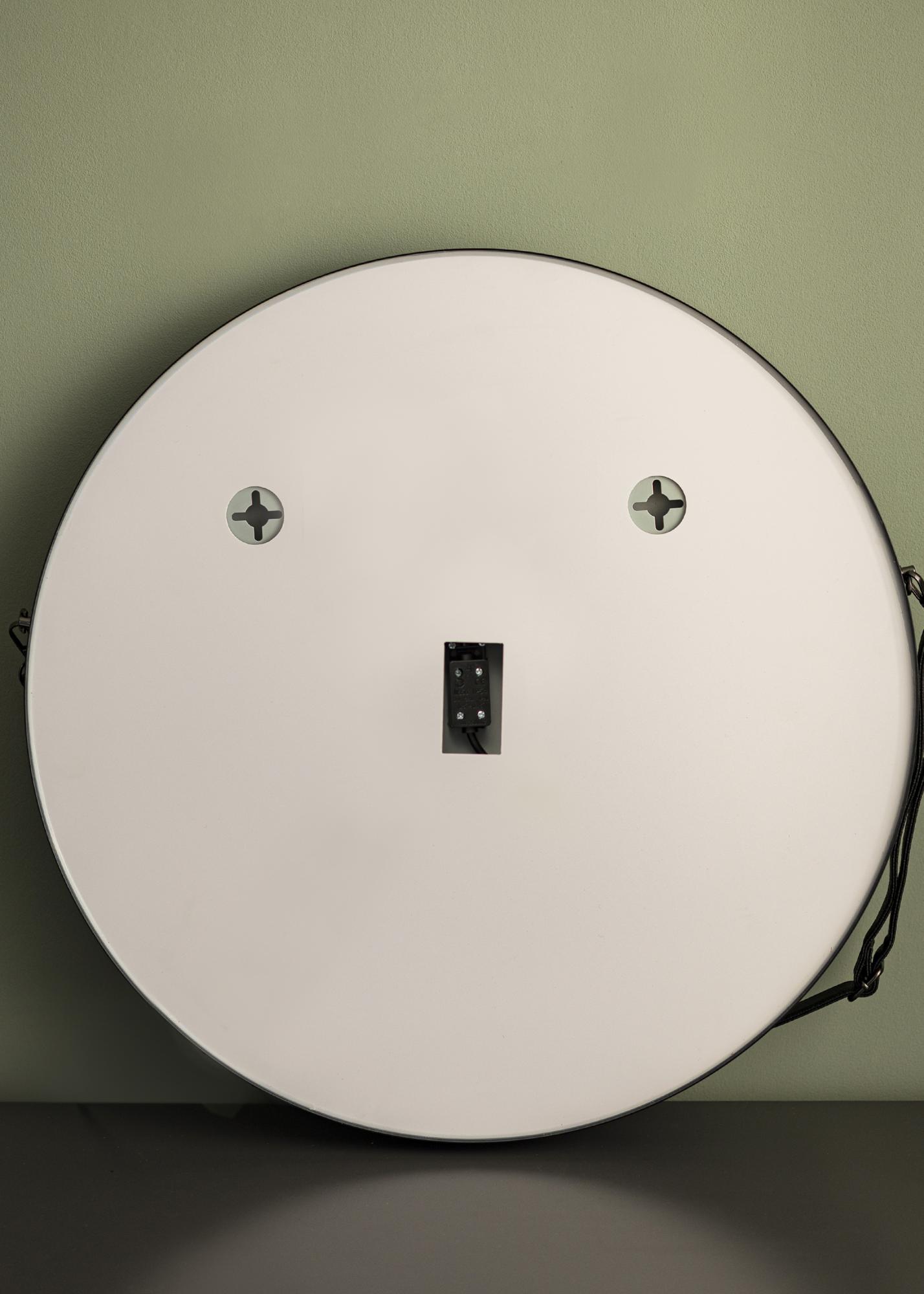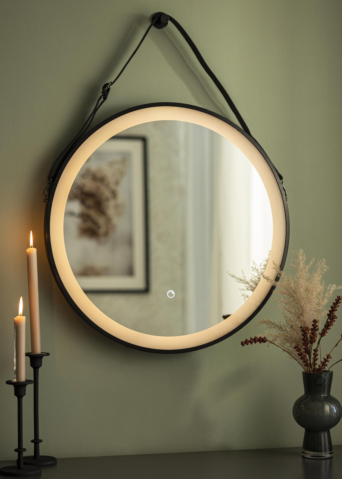 Това огледало за баня е в индустриален дизайн със своя черен нюанс и модерен кръгъл дизайн. Огледалото е с диаметър 60 см и има прилежаща кожена каишка в кафявочерен цвят за окачване. Около огледалното стъкло е интегрирано LED осветление, което дава топло бял блясък в 3000К. Осветлението е димируемо и лесно регулирате силата, като задържите бутона за докосване на екрана за няколко секунди. Огледалото запомня последната светлинна настройка следващия път, когато го включите. Това ви дава възможност винаги да се оглеждате в добра светлина! Огледалото е одобрено за баня, но също така е стилен интериорен детайл на останалите стени в дома! Огледалото е предназначено за постоянна инсталация и се свързва към ключ. За да работи правилно, огледалото трябва да бъде свързано към обикновен ключ, а не към димиращ ключ.