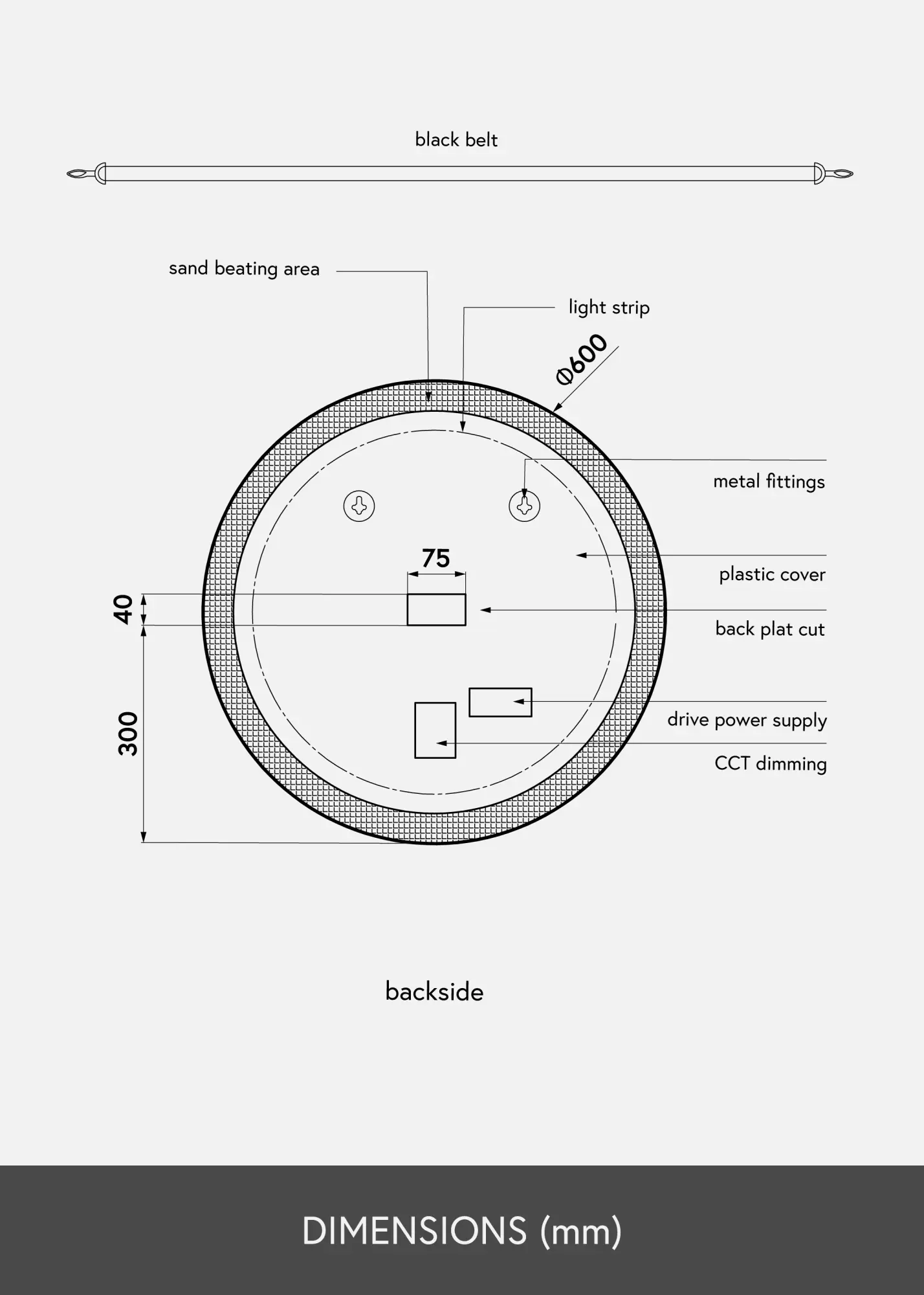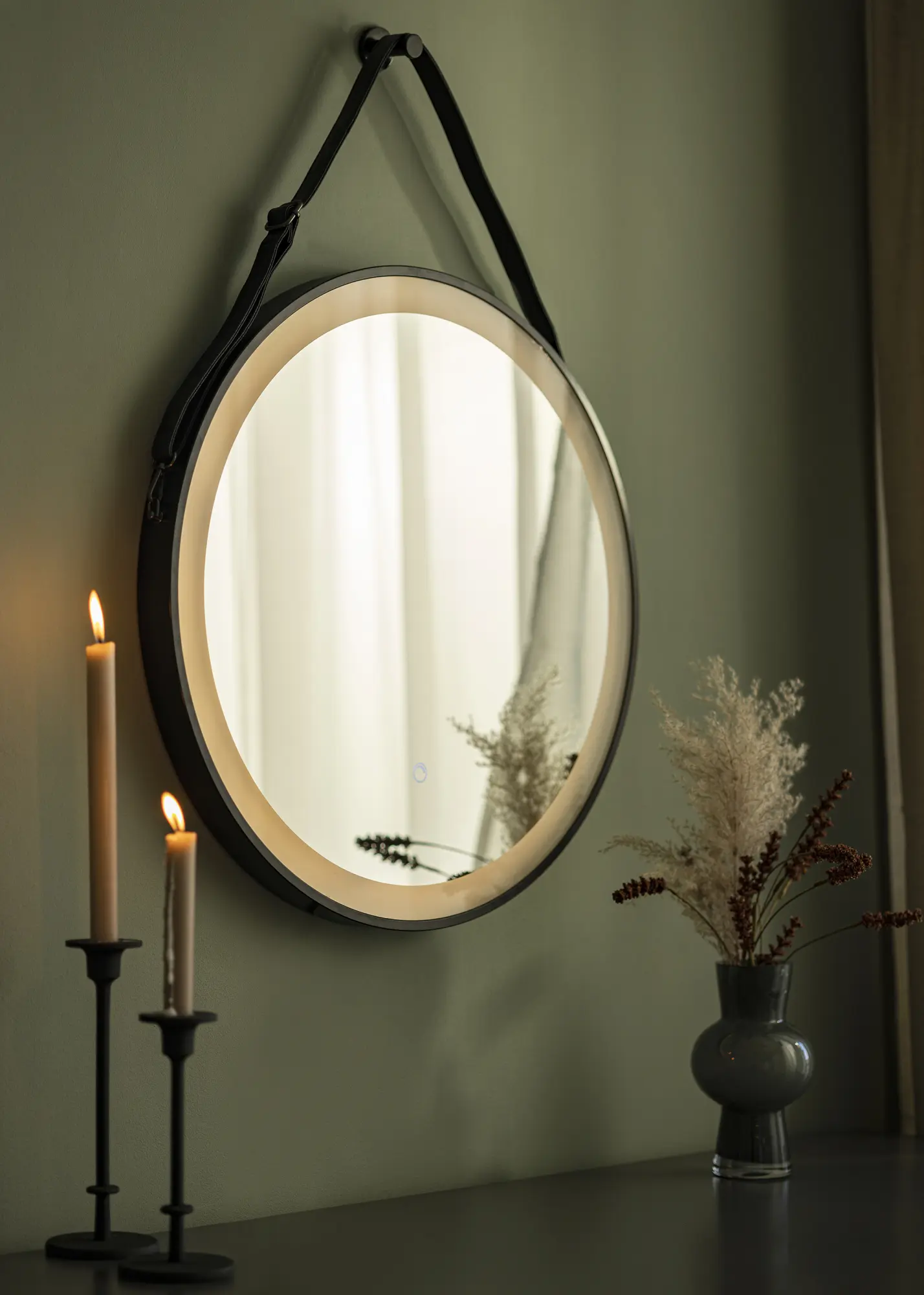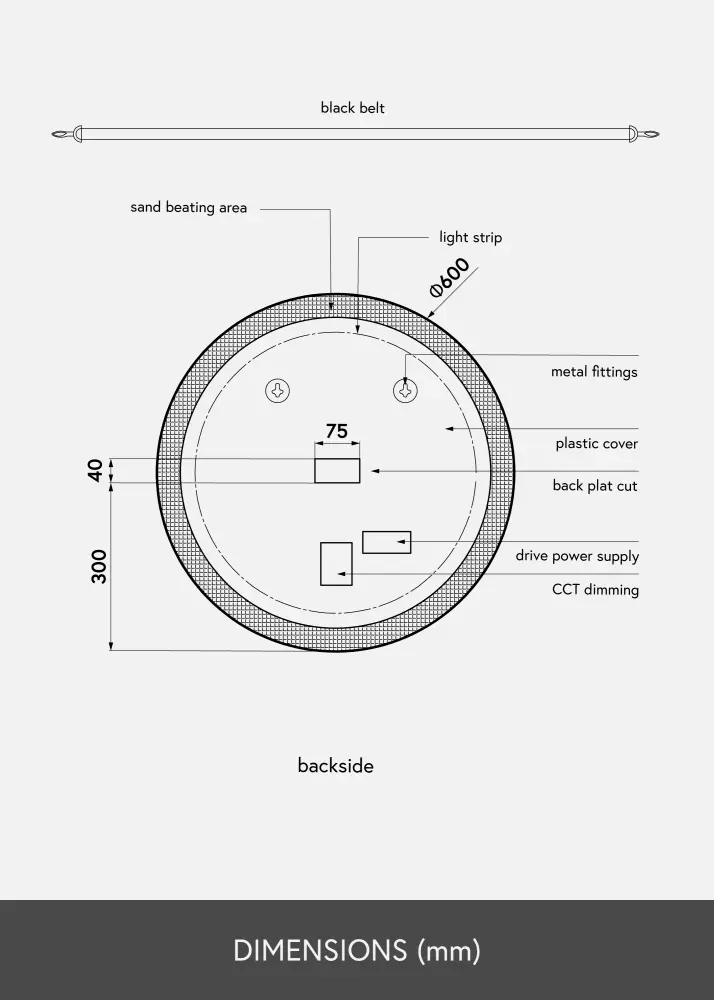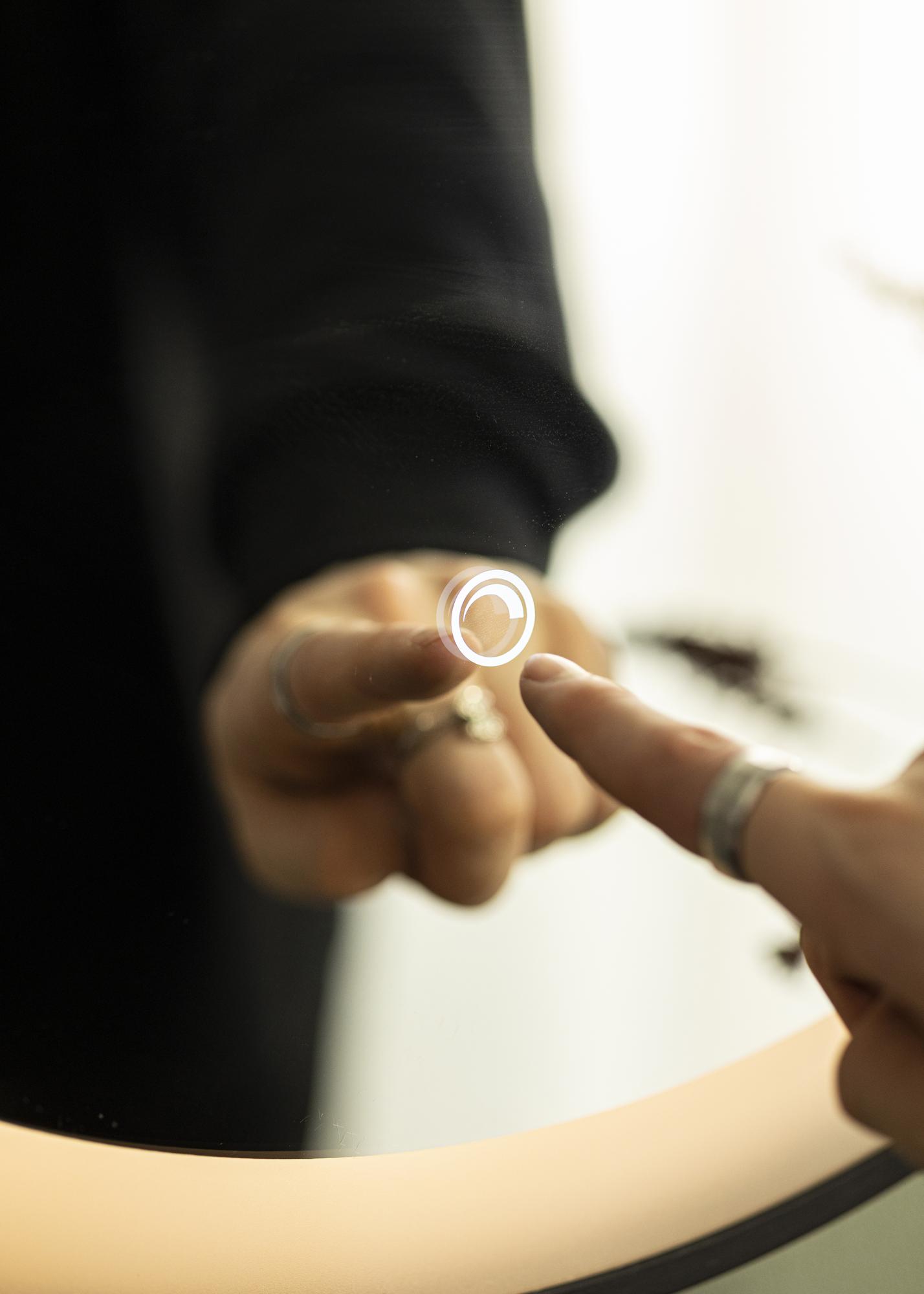 Това огледало за баня е в индустриален дизайн със своя черен нюанс и модерен кръгъл дизайн. Огледалото е с диаметър 60 см и има прилежаща кожена каишка в кафявочерен цвят за окачване. Около огледалното стъкло е интегрирано LED осветление, което дава топло бял блясък в 3000К. Осветлението е димируемо и лесно регулирате силата, като задържите бутона за докосване на екрана за няколко секунди. Огледалото запомня последната светлинна настройка следващия път, когато го включите. Това ви дава възможност винаги да се оглеждате в добра светлина! Огледалото е одобрено за баня, но също така е стилен интериорен детайл на останалите стени в дома! Огледалото е предназначено за постоянна инсталация и се свързва към ключ. За да работи правилно, огледалото трябва да бъде свързано към обикновен ключ, а не към димиращ ключ.
