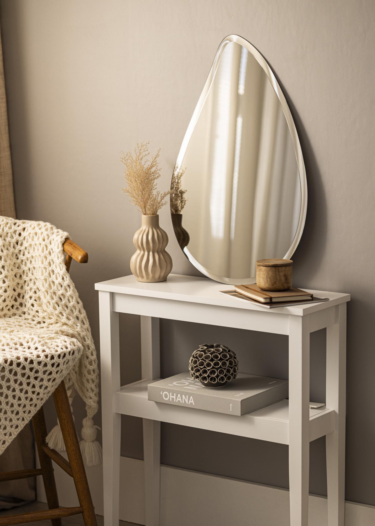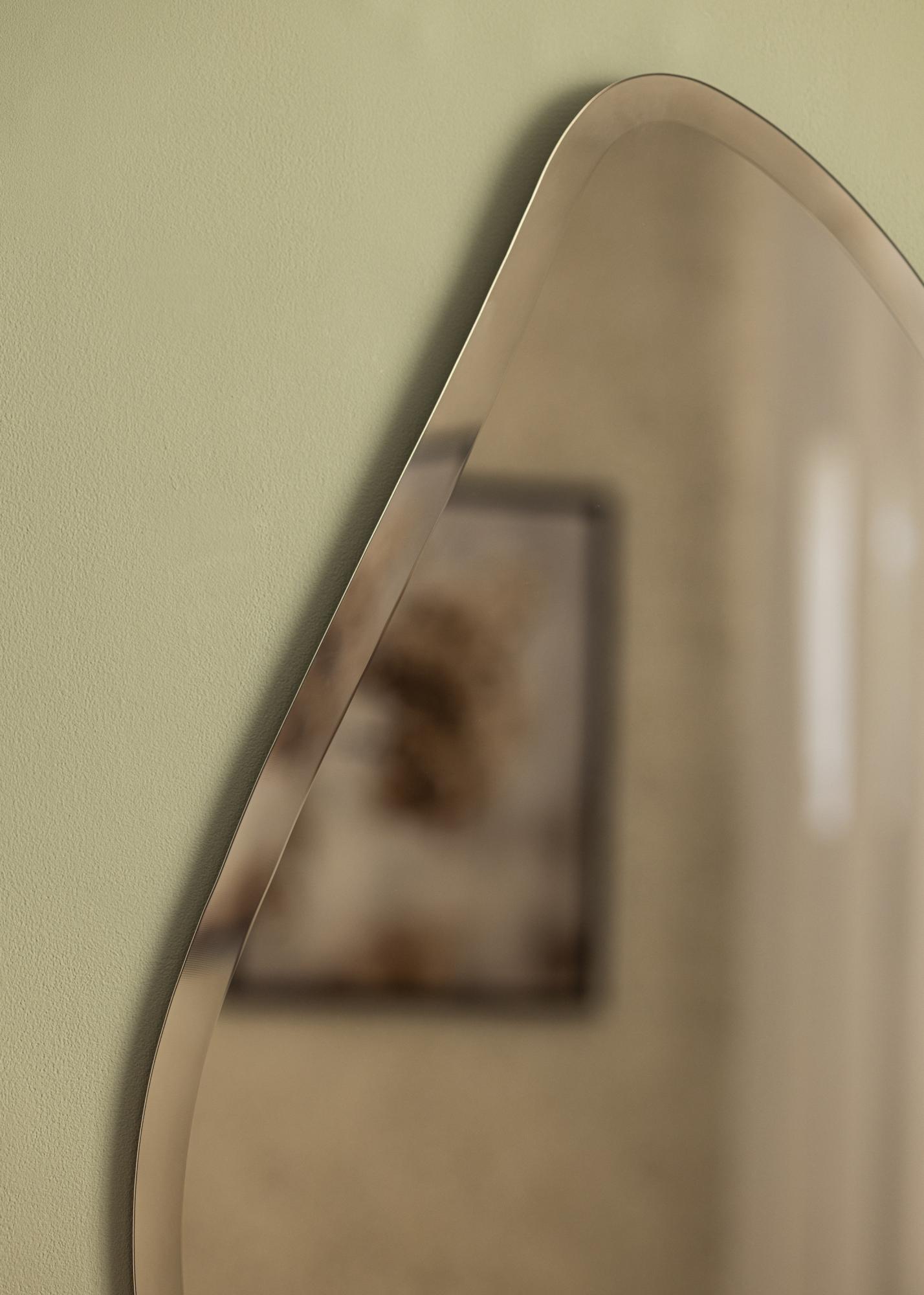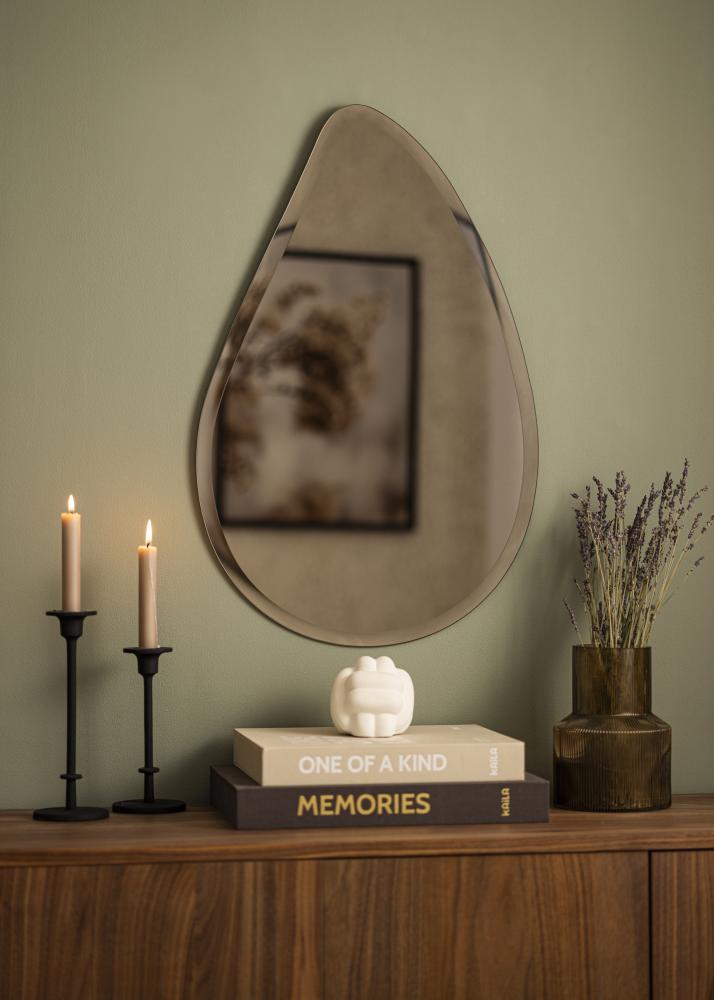 Това е модерно капковидно огледало с още по-модерно огледално стъкло, тонирано в елегантен нюанс на тъмна бронз. Тонираното огледално стъкло придава голям ефект и красивият бронзов цвят е лесен за съчетаване с много различни цветови схеми на интериора. Огледалото е много тънко и няма рамка, което в комбинация с луксозно фасетираната му повърхност, допълнително подсилва елегантния и модерен вид. Това е много декоративно стеново огледало, което гарантирано привлича погледите, независимо в кое помещение е поставено – в хола както и в коридора или спалнята.