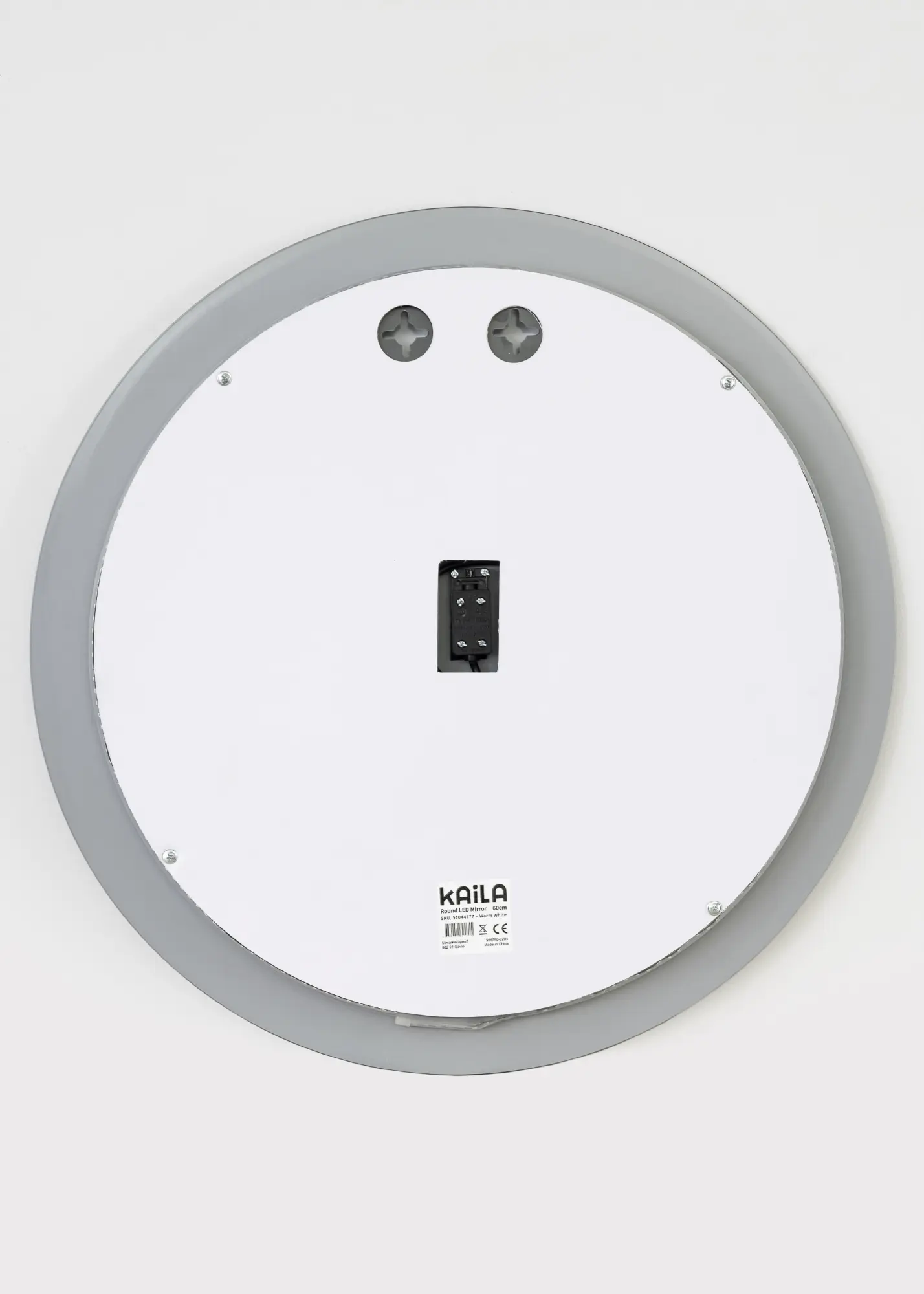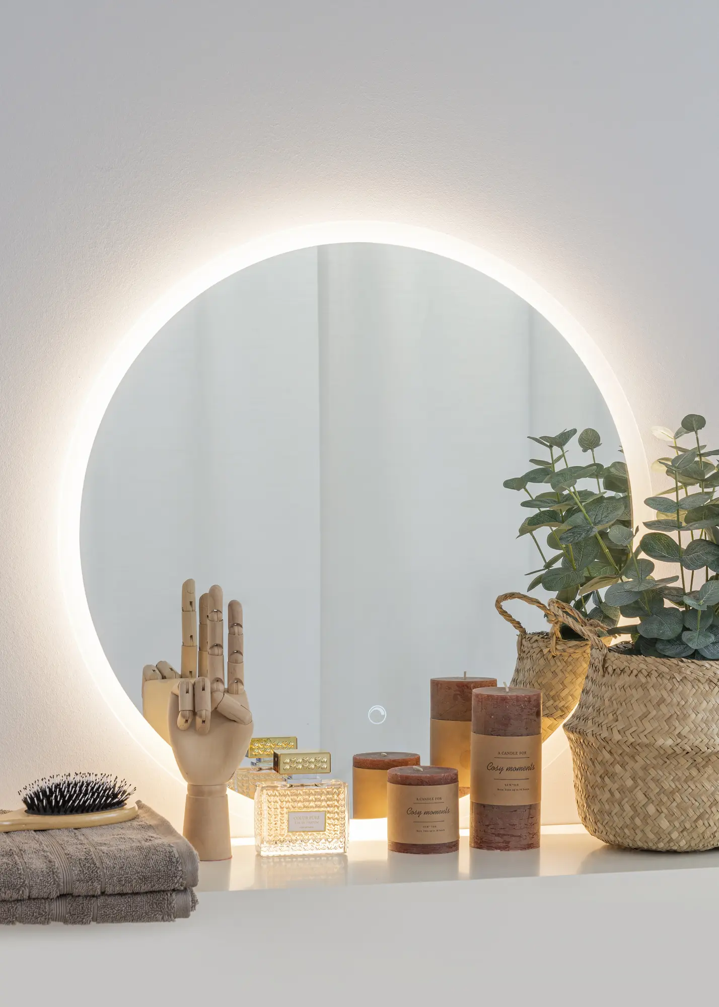 Това е класическо и стилно кръгло огледало за баня. Огледалото е с рамка от матова ивица с интегрирано LED осветление. Осветлението се излъчва зад огледалото и дава приятно топла бяла светлина, насочена напред при 3000K. Осветлението е димиращо и можете лесно да регулирате неговата сила, като задържите бутона за няколко секунди. Следващия път, когато включите осветлението, огледалото ще запомни на каква сила е било настроено. Огледалото разполага с включени стенни крепежи и е одобрено за баня. Огледалото за баня е предназначено за стационарен монтаж и се свързва към електрически ключ.