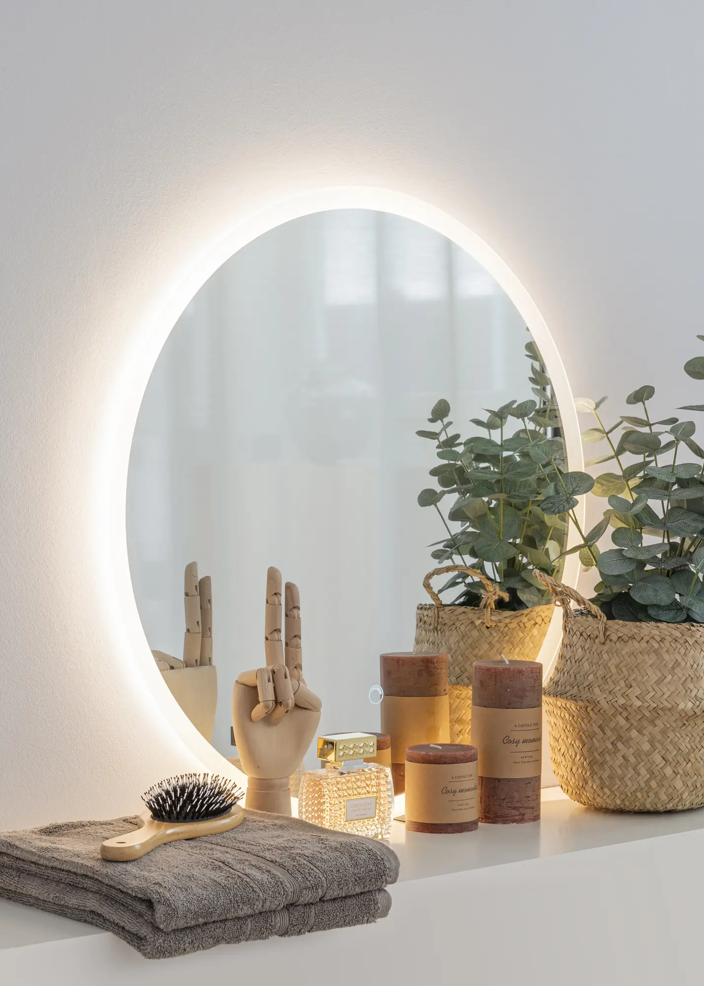 LED е източник на светлина, който пести енергия и осигурява равномерна и естествена светлина - което прави това огледало перфектно за баня и като огледало за грим, а защо не и като огледало за входа! Елегантното огледало е с диаметър 100 см и е само 3 см тънко.