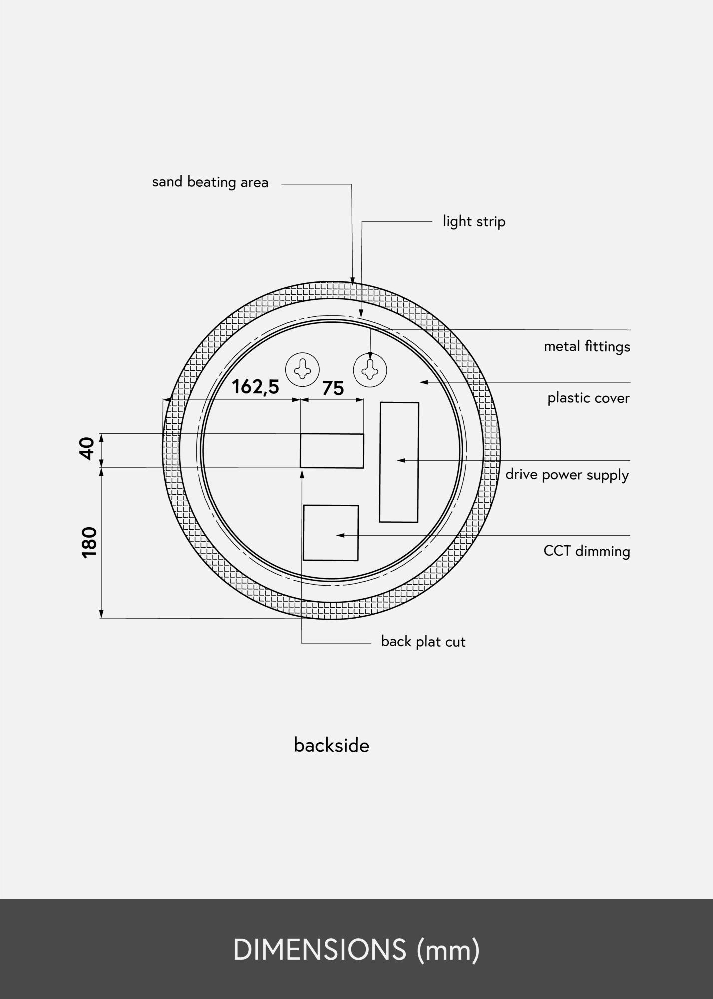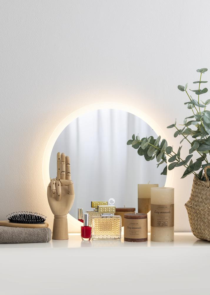 Това е класическо и стилно кръгло огледало за баня. Огледалото е обрамчено с матов кант с интегрирано LED осветление. Осветлението свети зад огледалото и осигурява приятна топло-бяла светлина в 3000K. Осветлението е димируемо и лесно можете да регулирате яркостта му, като задържите бутона за няколко секунди. Следващия път, когато включите осветлението, огледалото ще запомни коя е била зададената яркост. Огледалото има съответстващи стенни крепежи и е одобрено за баня. Огледалото за баня е предназначено за постоянен монтаж и се свързва към ключ. За да функционира правилно, огледалото трябва да бъде свързано към обикновен ключ, а не към димер.