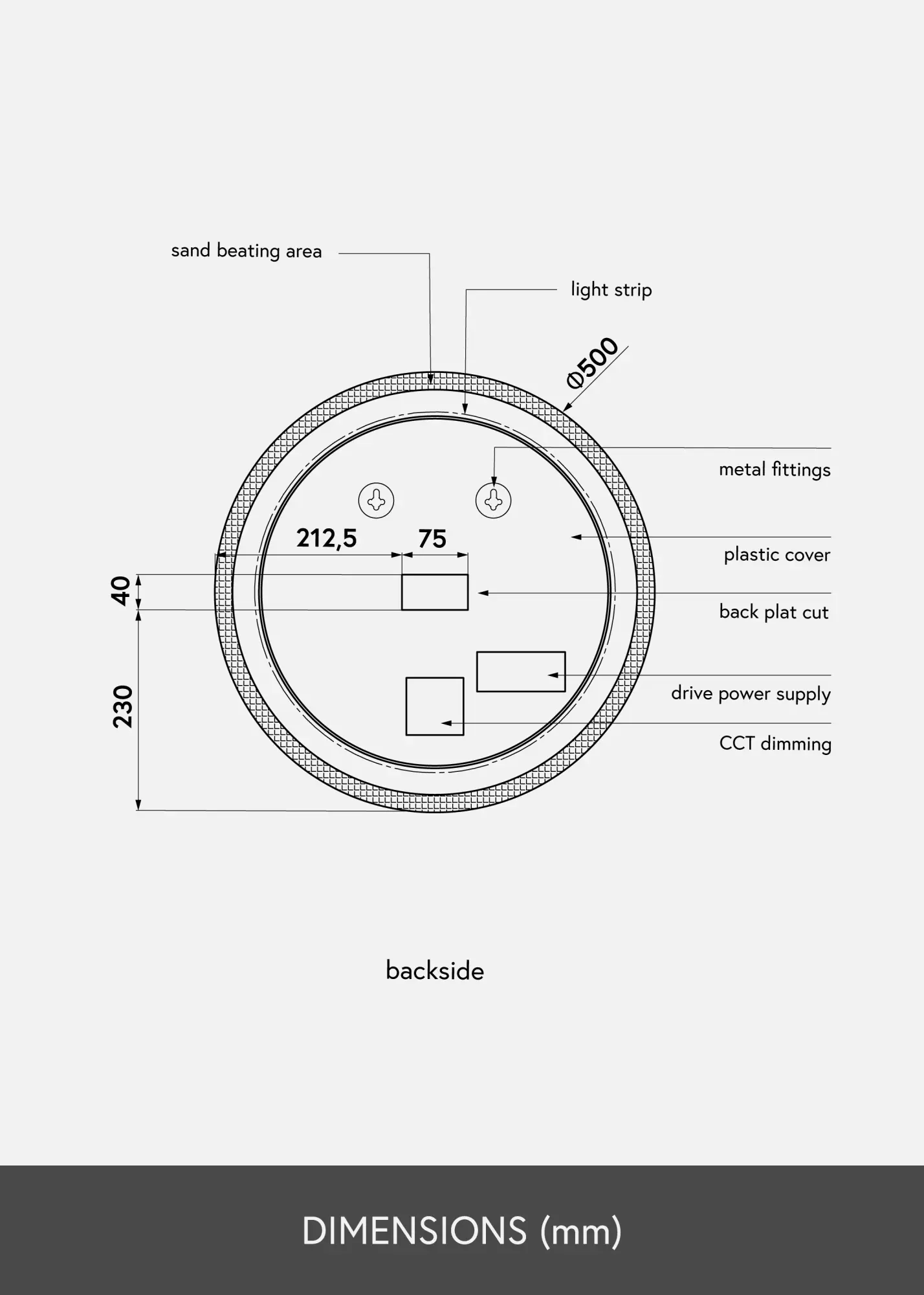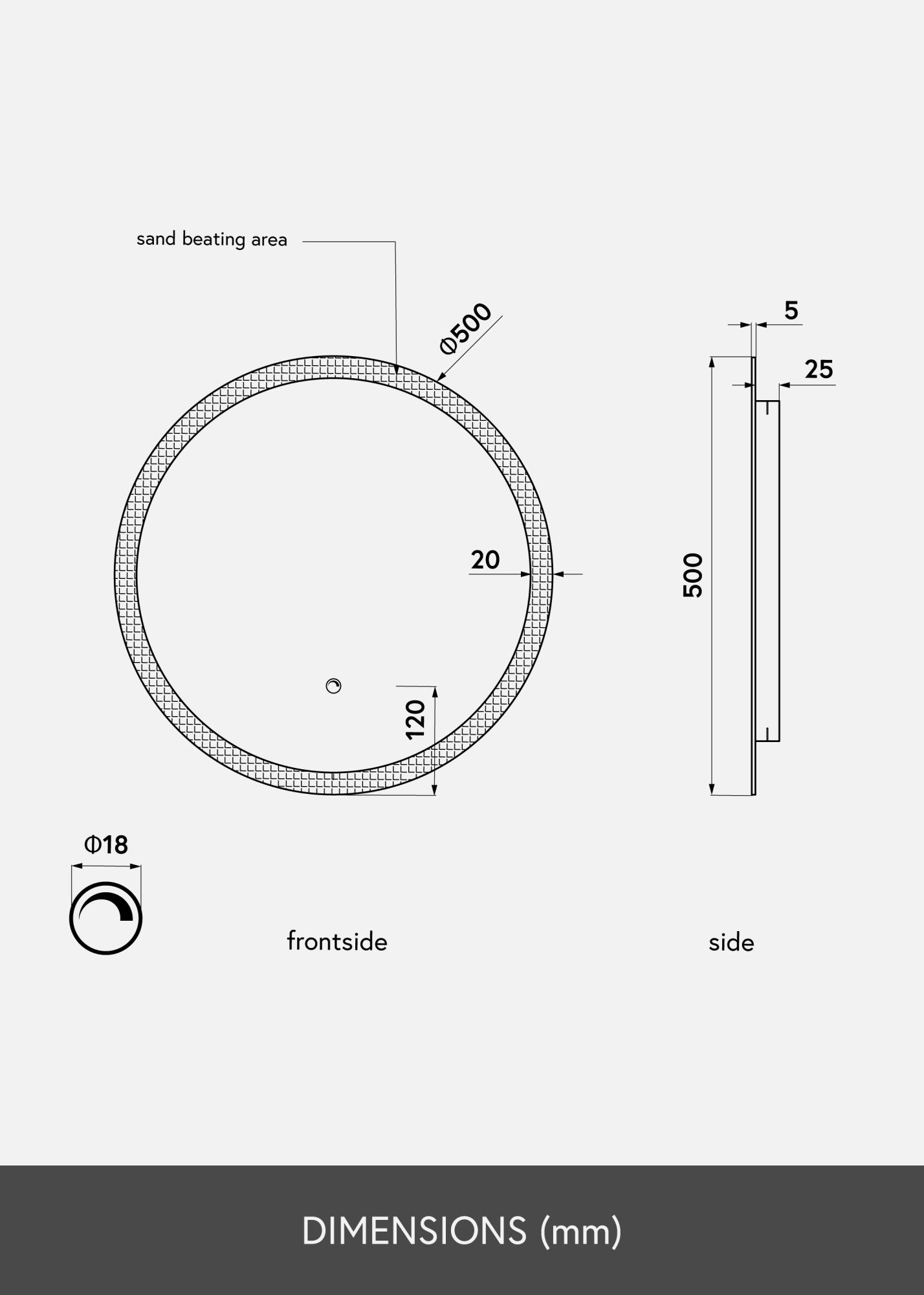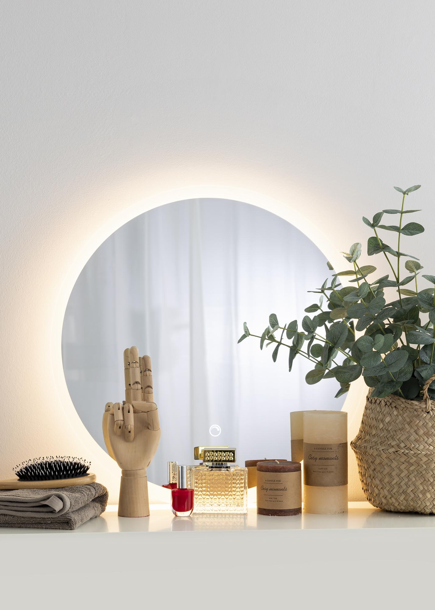 Това е класическо и стилно кръгло огледало за баня. Огледалото е обградено от матиран край с интегрирано LED осветление. Осветлението свети зад огледалото и дава приятно топло бяла светлина напред в 3000K. Осветлението е димируемо и можете лесно да регулирате неговата сила, като задържите бутона за няколко секунди. Следващият път, когато включите осветлението, огледалото ще запомни установената сила на светлината. Огледалото има съответните стенни скоби и е одобрено за баня. Огледалото за баня е предназначено за фиксирана инсталация и се свързва със светлинен превключвател. За правилното функциониране на огледалото, то трябва да бъде свързано към обикновен светлинен превключвател, а не към превключвател за димиране.