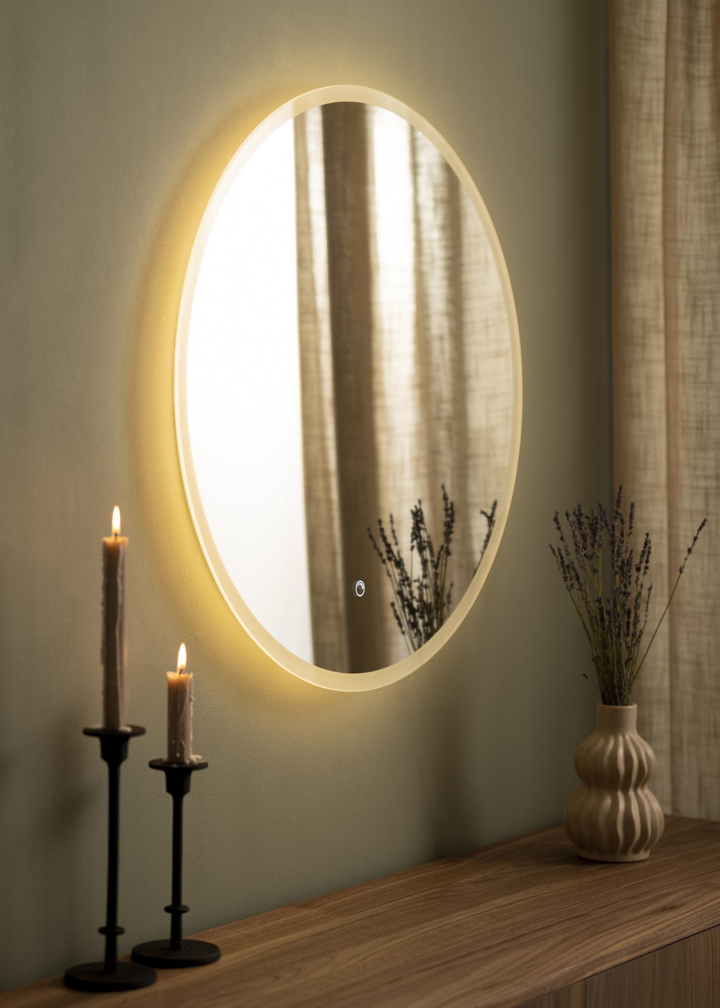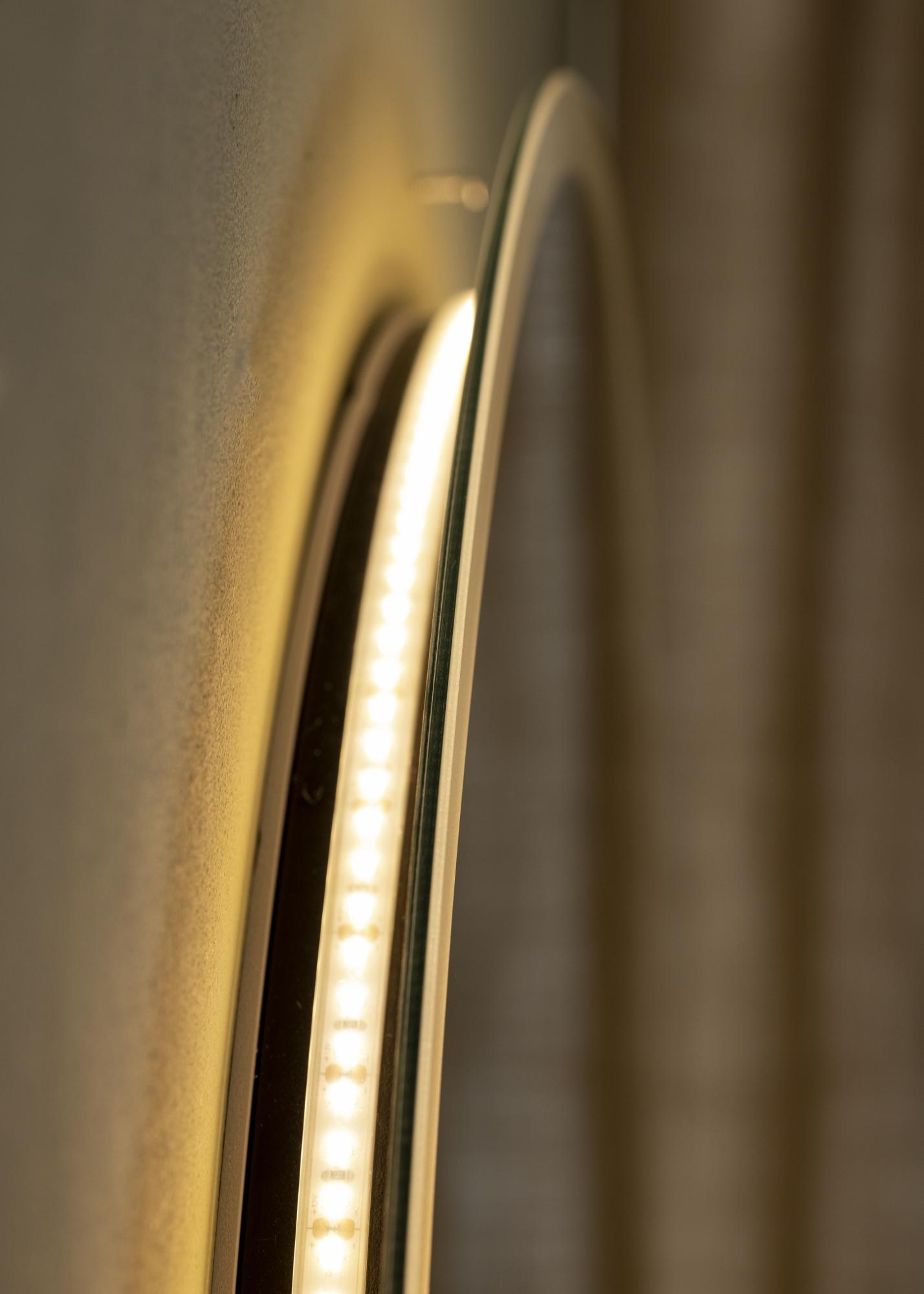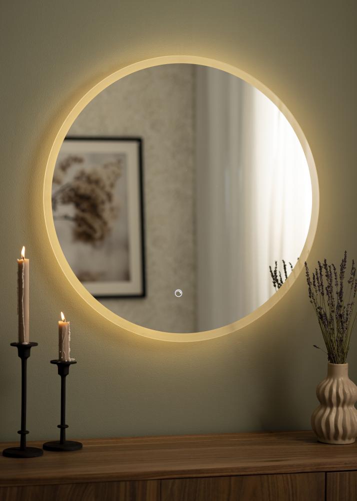 Това е класическо и стилно кръгло огледало за баня. Огледалото е обрамчено с матиран ръб с интегрирано LED осветление. Осветлението свети зад огледалото и дава приятно топлобяло сияние напред в 3000K. Осветлението е димируемо и можете лесно да регулирате силата на осветлението, като задържите бутона за няколко секунди. Следващия път, когато включите осветлението, огледалото ще запомни на каква яркост е било настроено. Огледалото има съответстващи стенни скоби и е одобрено за баня. Огледалото за баня е предназначено за постоянна инсталация и се свързва към ключ.