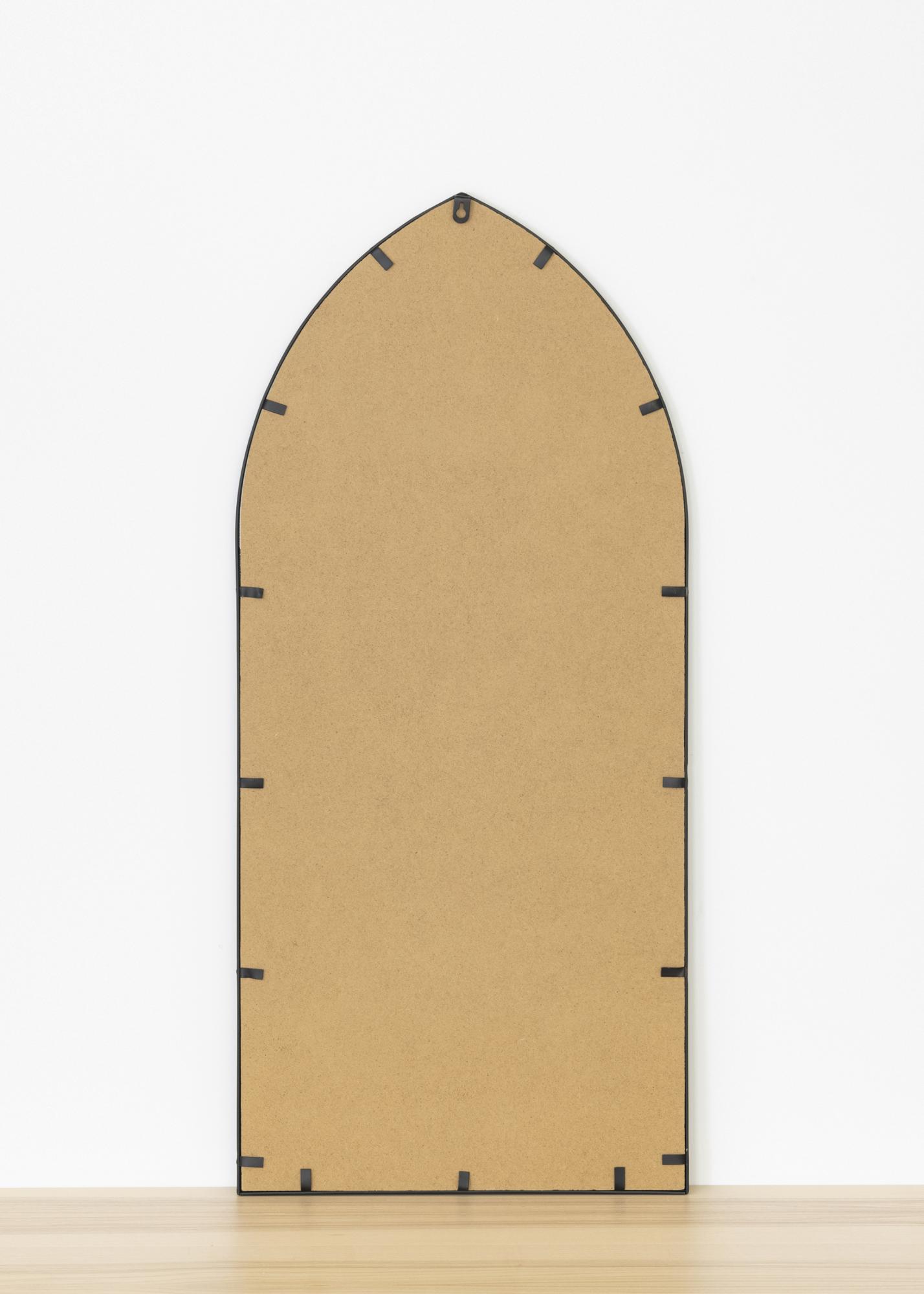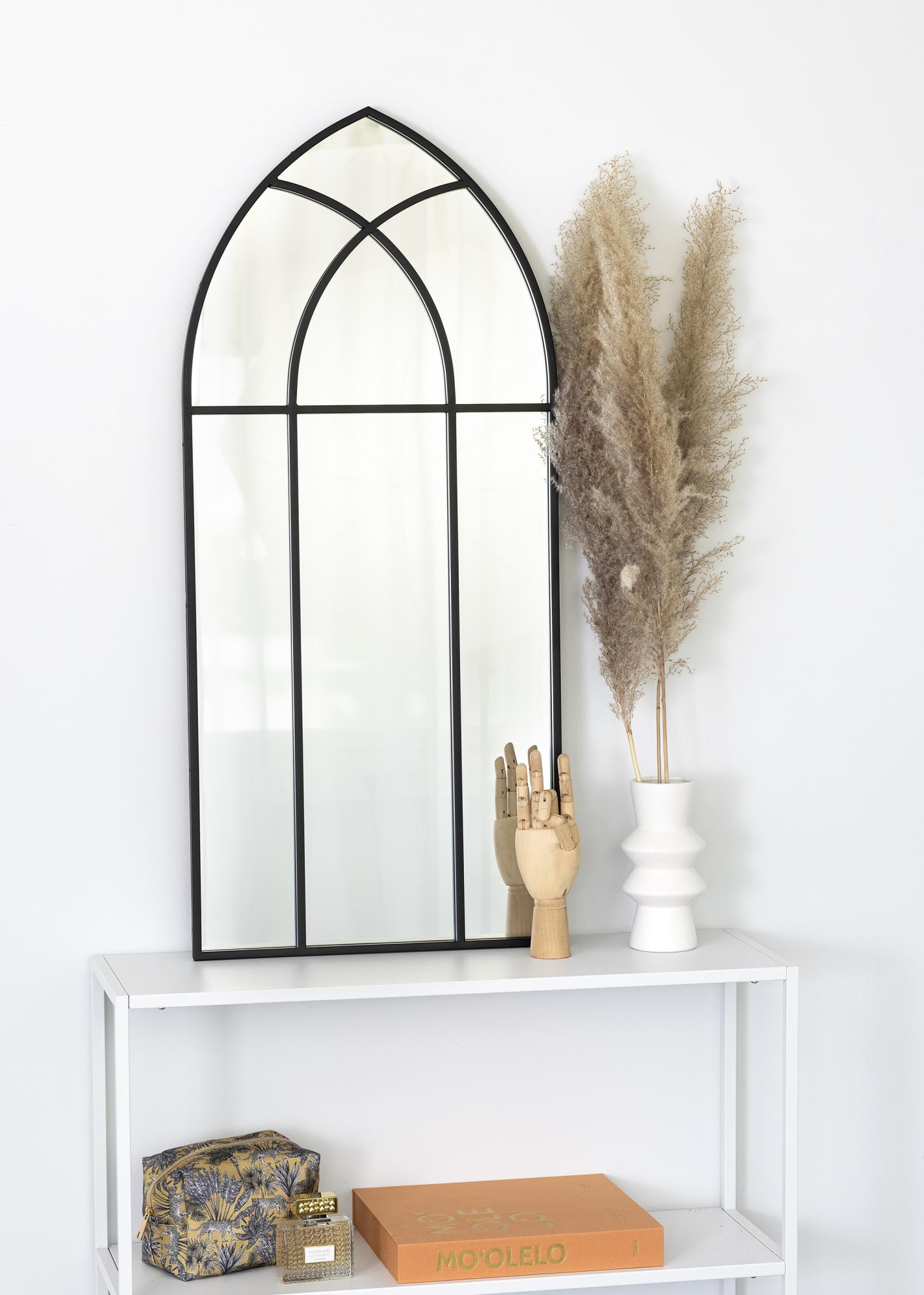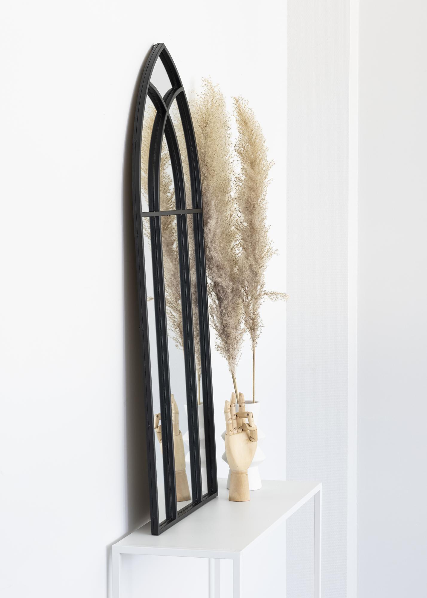 Това е много декоративно огледало, което веднага създава по-романтична атмосфера в стаята, в която е поставено! Огледалото има дизайн, който напомня на градински прозорец с леко готически характер. Вълнуващата форма на огледалото ще го превърне в акцент в дома ви! Огледалото е с размери 45x100 и има декоративен мотив от черни тънки линии от метал.