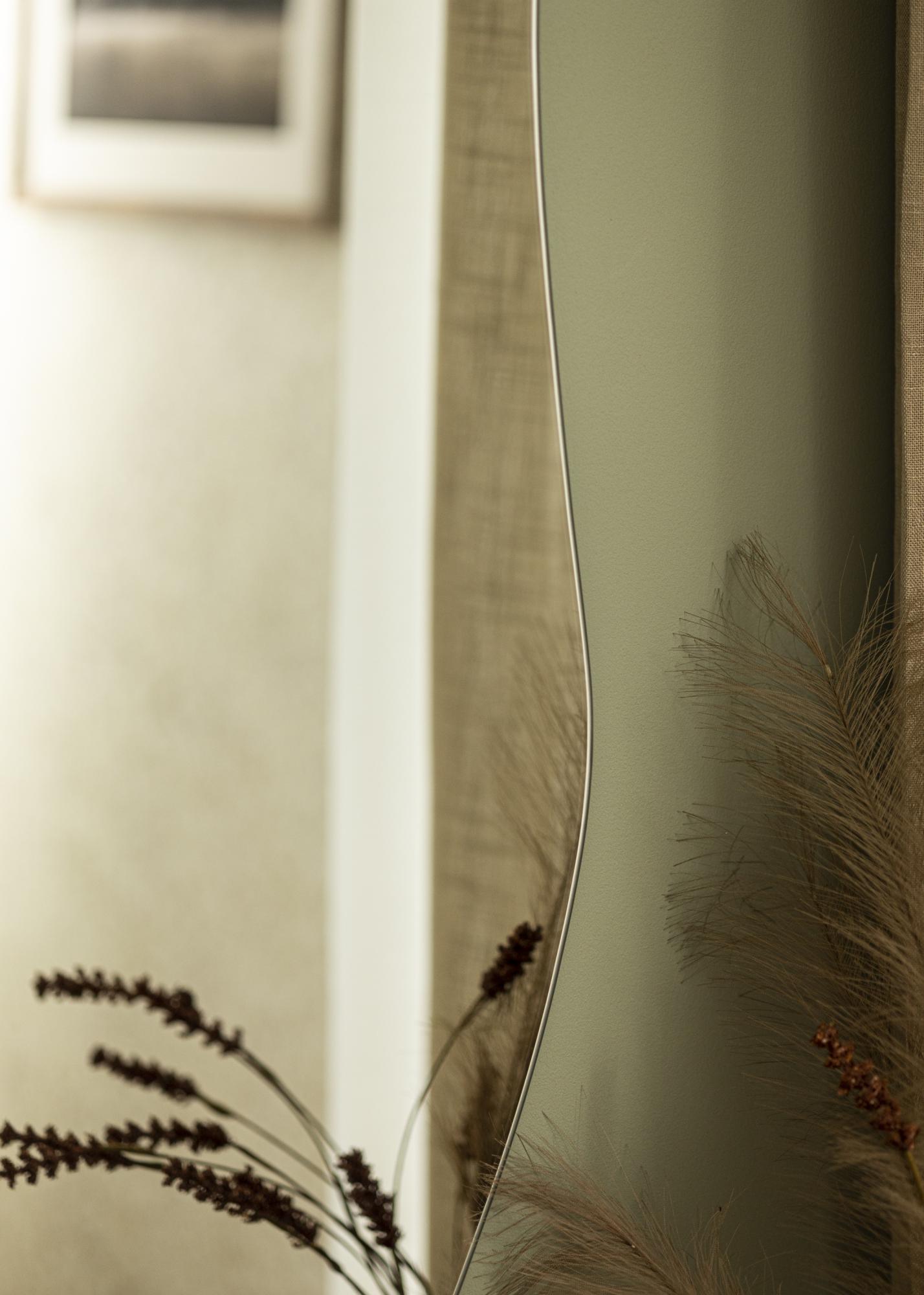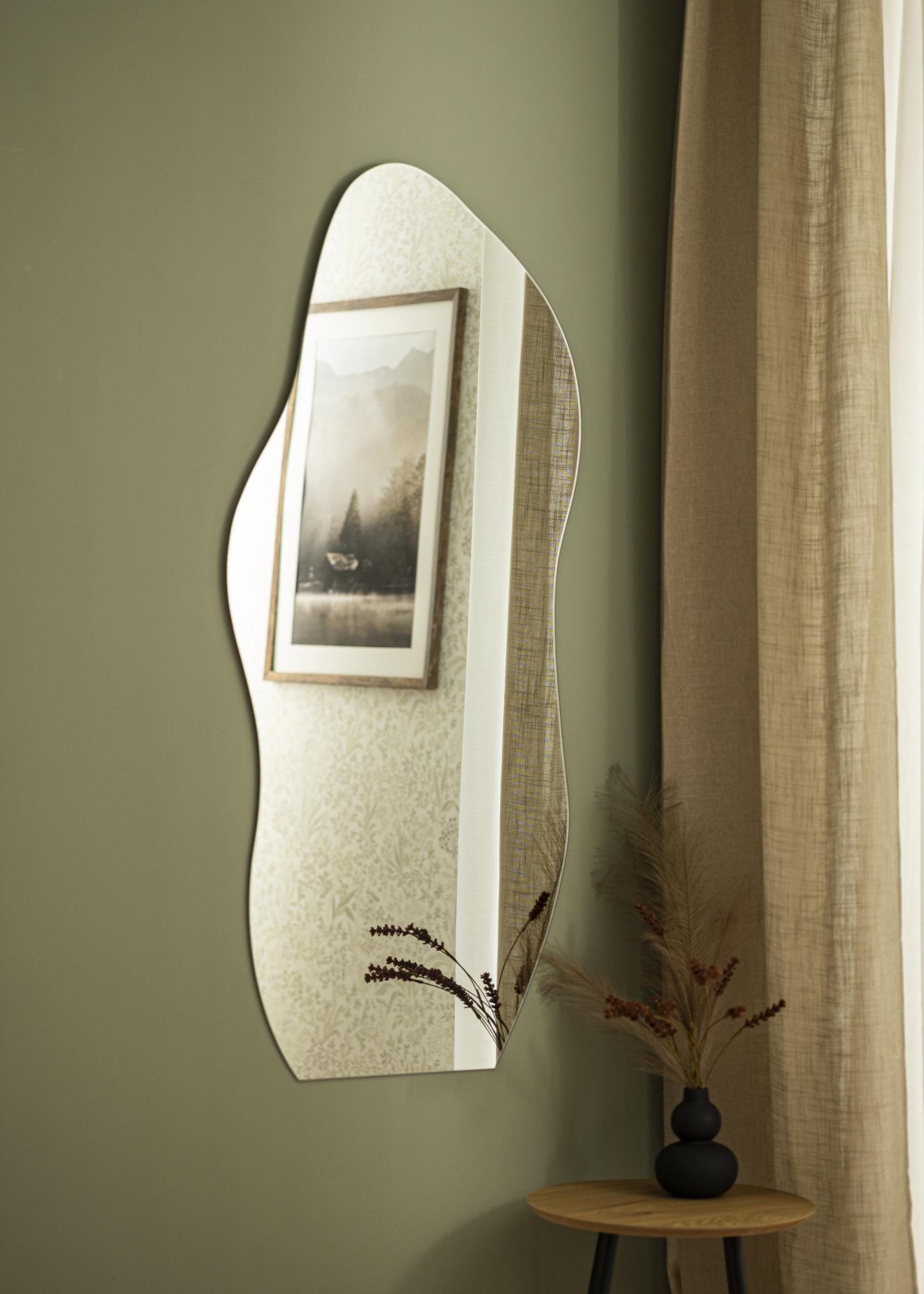 Това е стенни огледало в модерен дизайн, с страни с мека вълнообразна форма. Долният ръб е прав, което прави огледалото изключително елегантно за окачване над мебел, където долният ръб на огледалото става успоредна линия с горната страна на скрина или страничната маса. Огледалото има стенни крепежни елементи на гърба и се монтира на стената във вертикално положение.