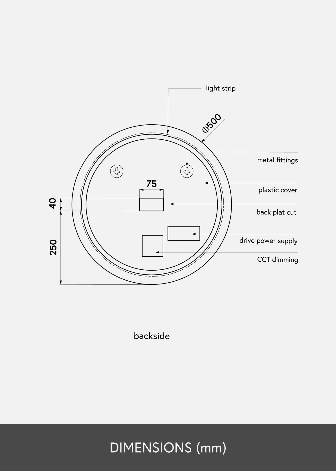 Огледалото е одобрено за баня, но неговият вечен и елегантен дизайн също добре се вписва на други стени в дома. Огледалото е с диаметър 50 см, дълбочина само 3 см и разполага с крепежи за стена. Огледалото е предназначено за твърдо инсталиране и се свързва към ключ. За да работи правилно, огледалото трябва да се свърже към обикновен ключ, а не към ключ с димер.